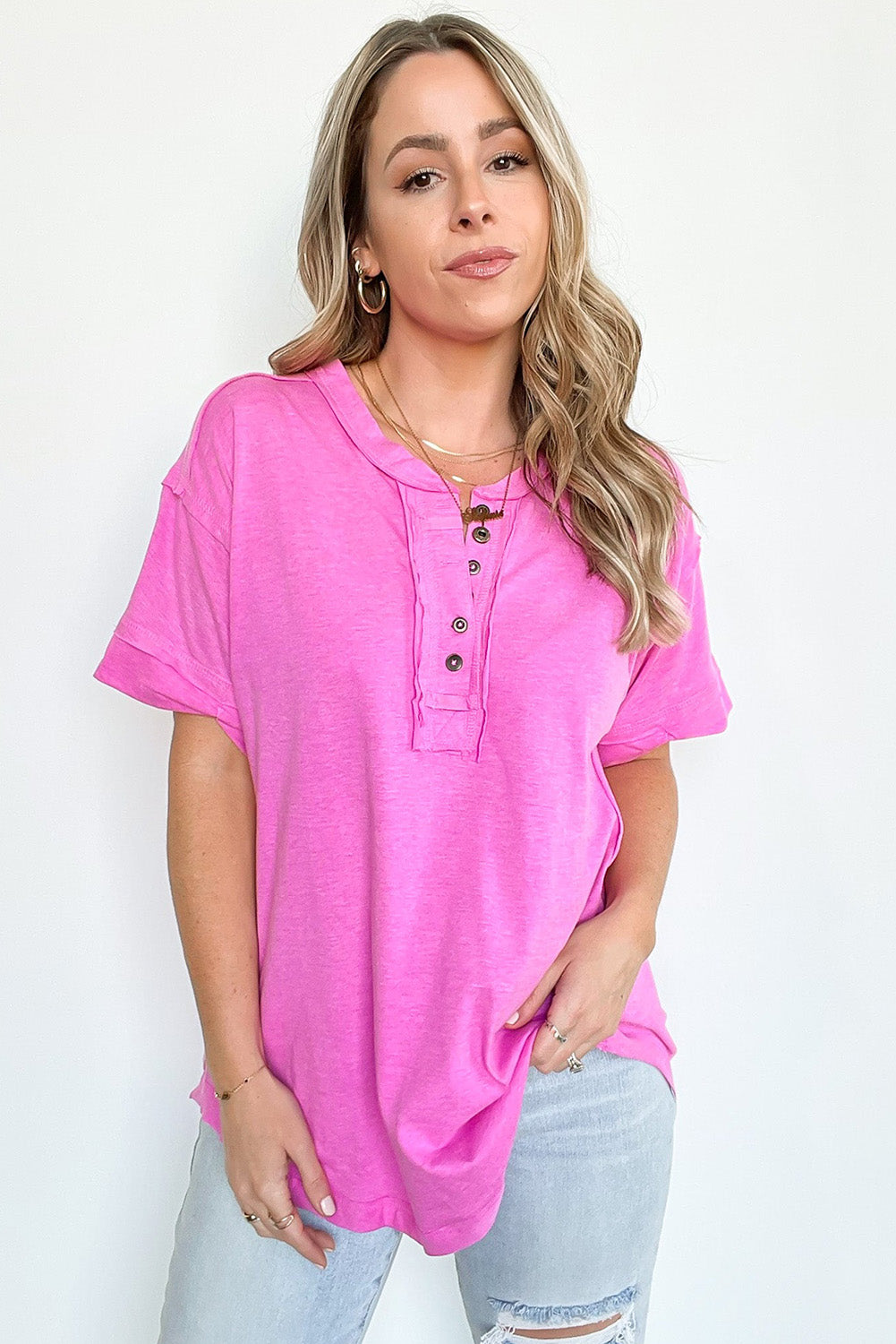 Look stylish and stay comfortable in the Raw Edge Button Henley Top.