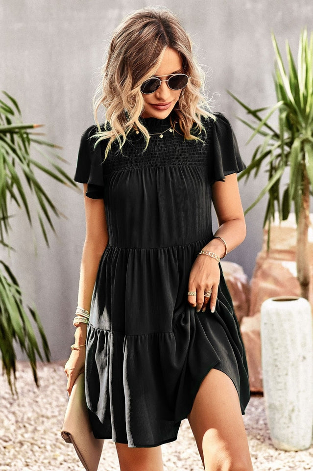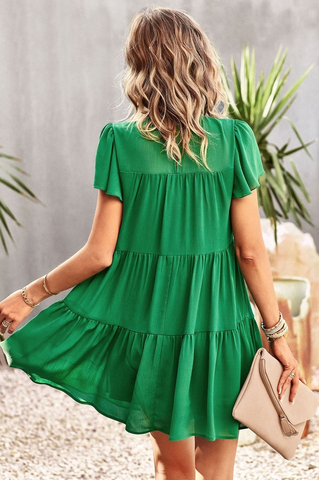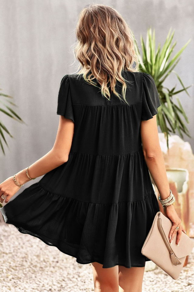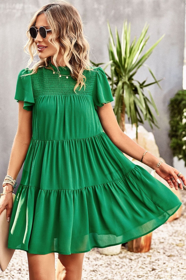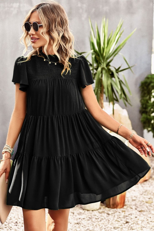 You will be "ready to party" when you put on this flirty dress featuring lightweight material. a high rounded neckline. short loose sleeves with large ruffled trim. and an ultra relaxed tiered babydoll silhouette that falls into an uneven mid-thigh length hemline!