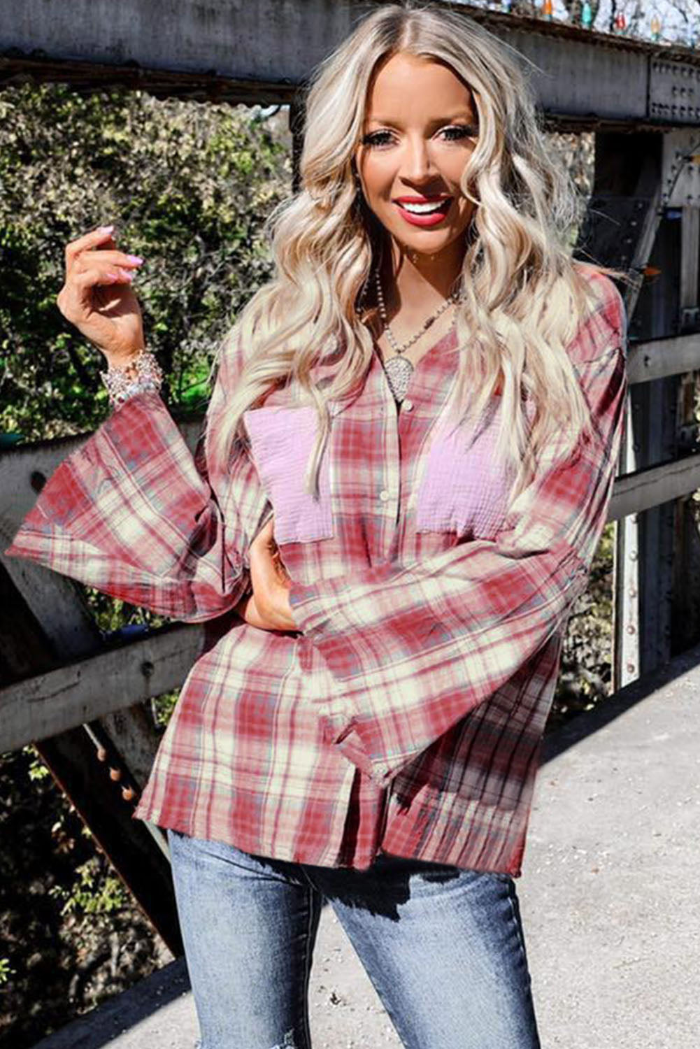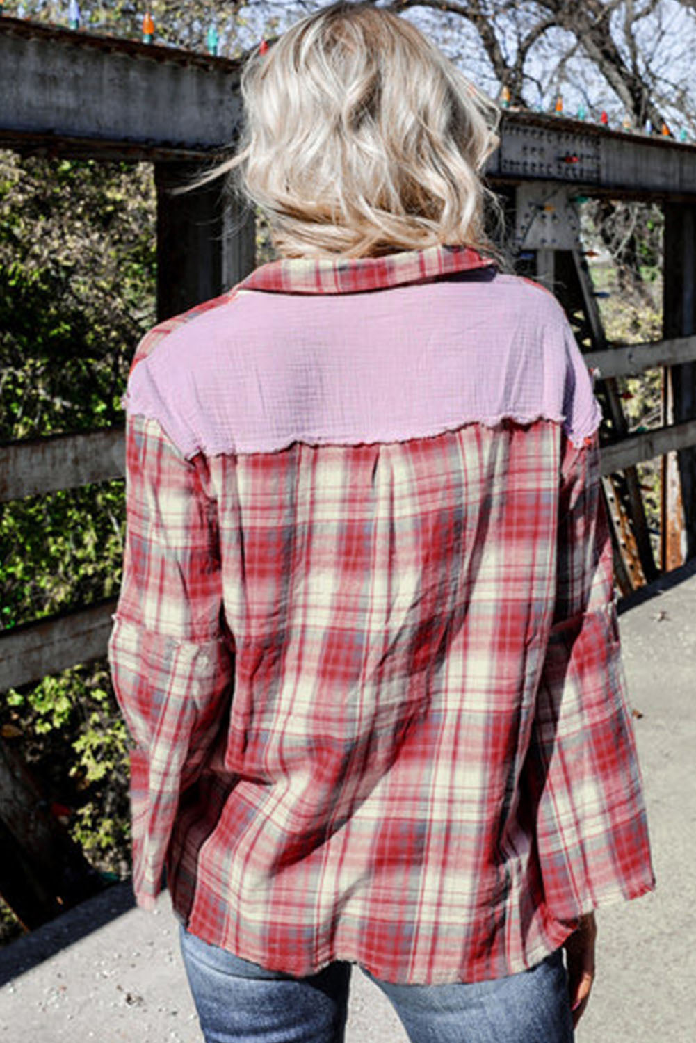 Red Contrast Patchwork Raw Edge Distressed Plaid Shirt