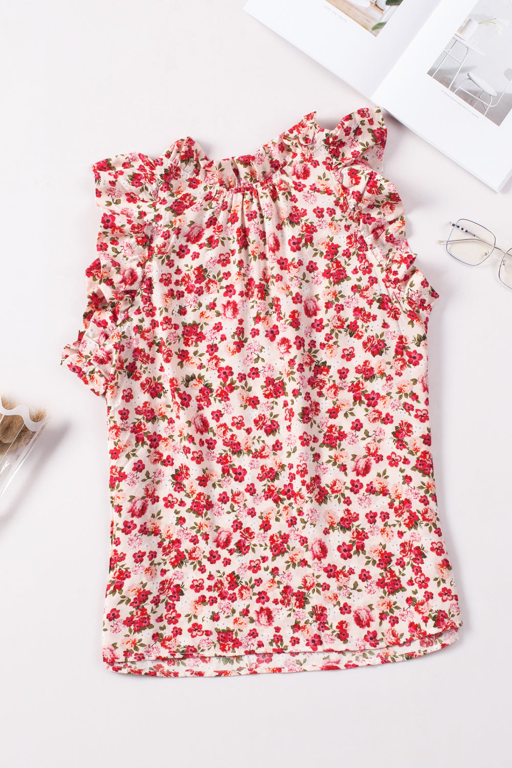 Add a touch of elegance to your wardrobe with this Red Floral Print Ruffled Mock Neck Sleeveless Top.