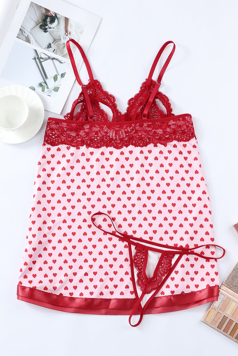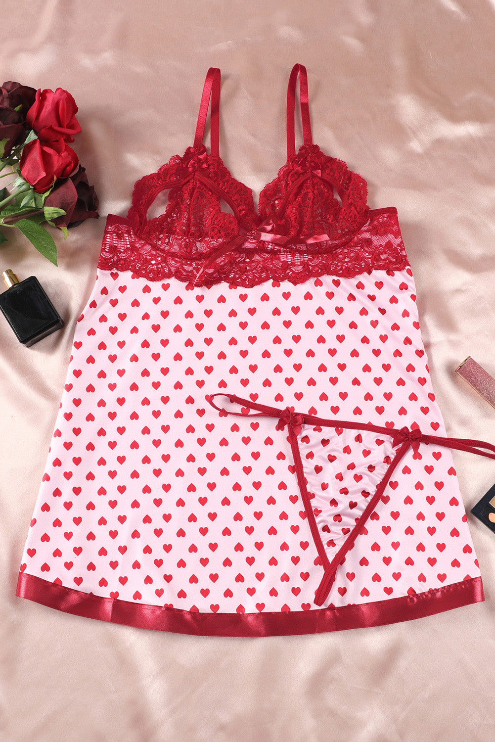 Whether you're looking for something to wear for a special occasion or just want to add a little something extra to your everyday look. this Red Heart Shape Print Lace Crochet Babydoll Set is sure to make a statement.