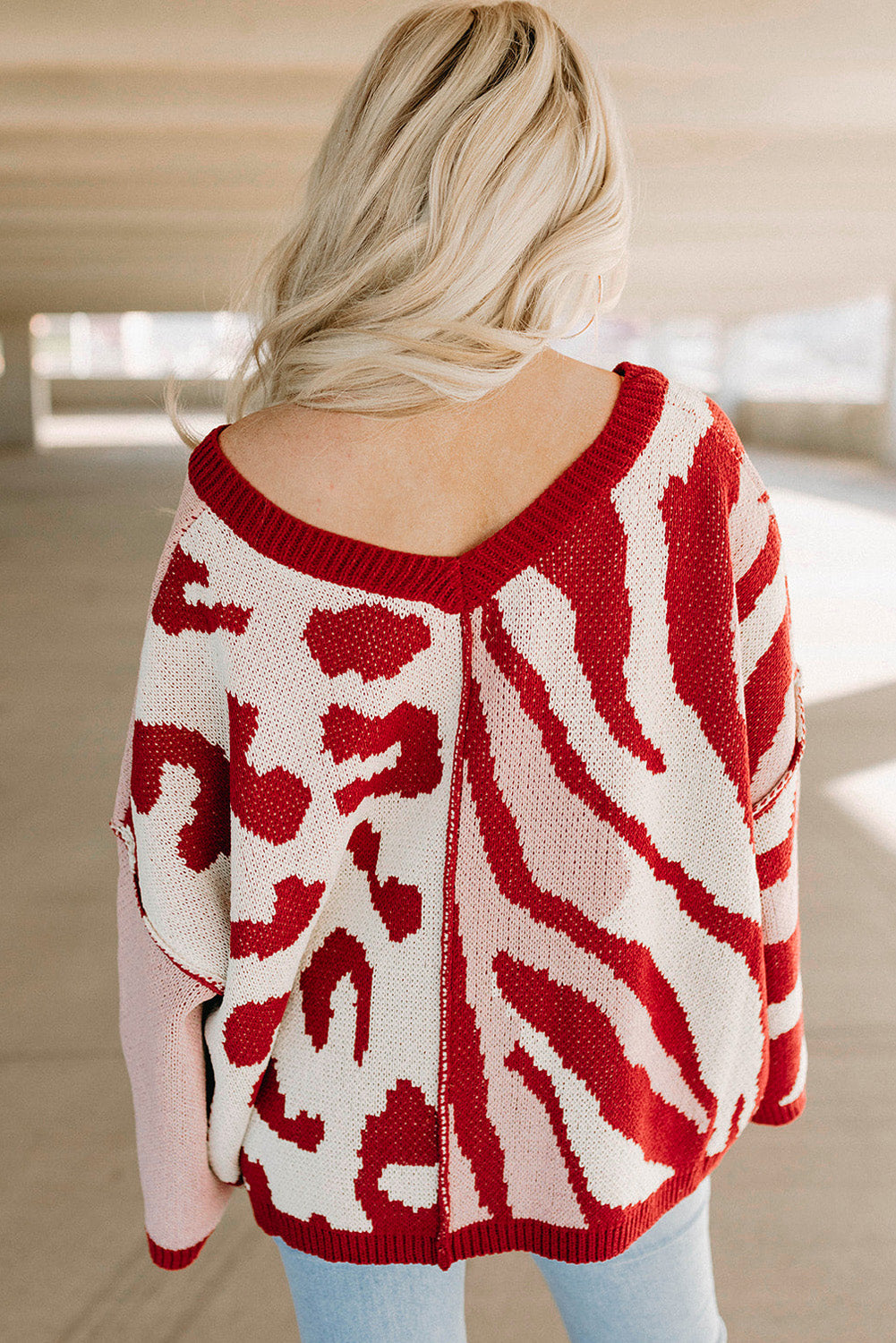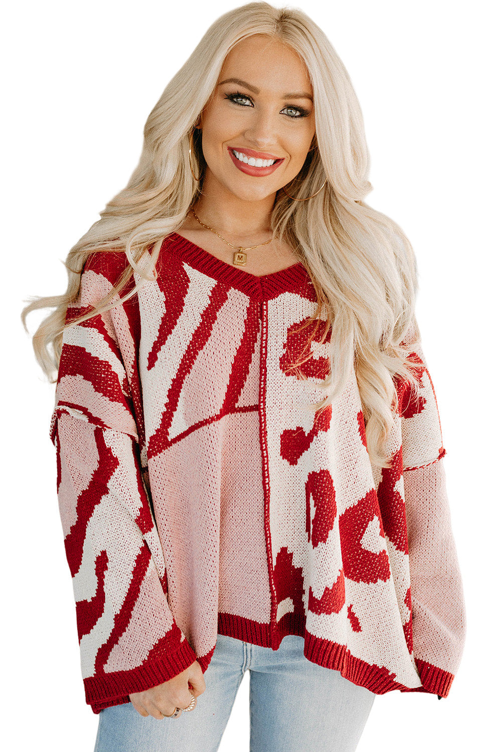 Stay warm and fashionable in this beautiful red mix pattern knit ribbed trim oversize sweater.