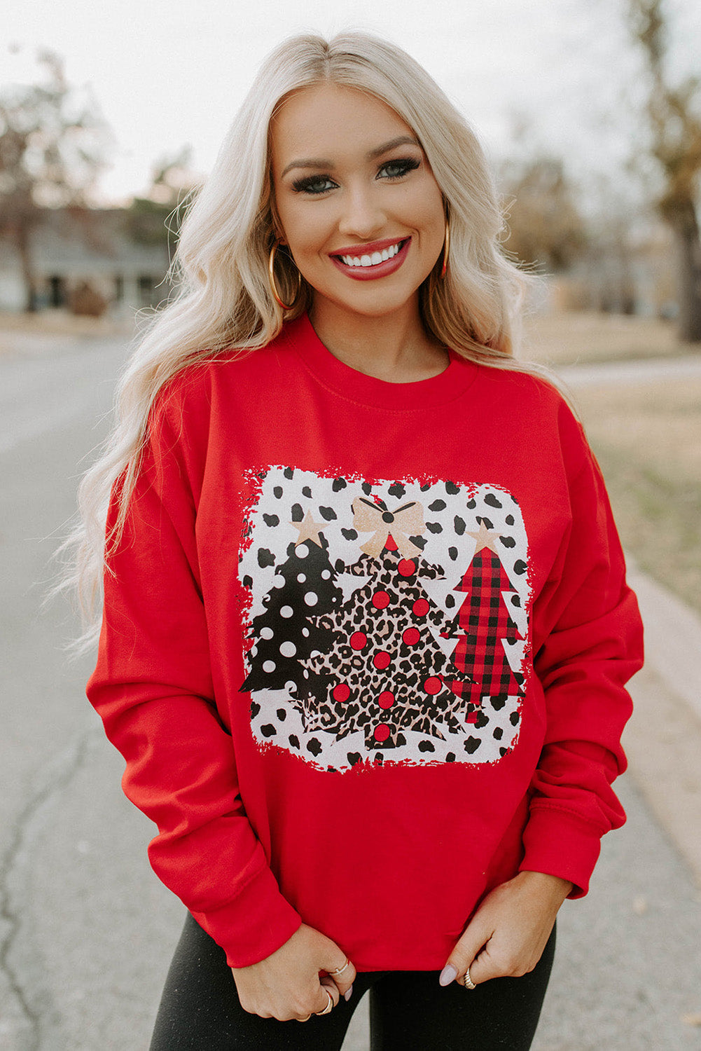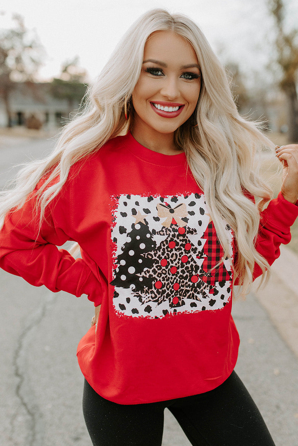 Whether you're heading to a holiday party or just want to stay warm. this Red Multi Christmas Tree Pattern Casual Sweatshirt is the perfect choice.