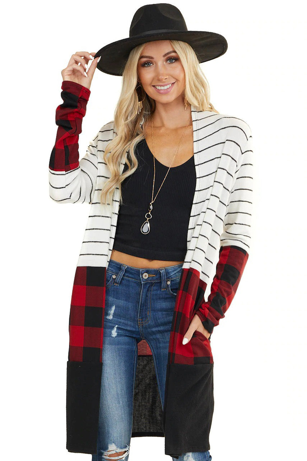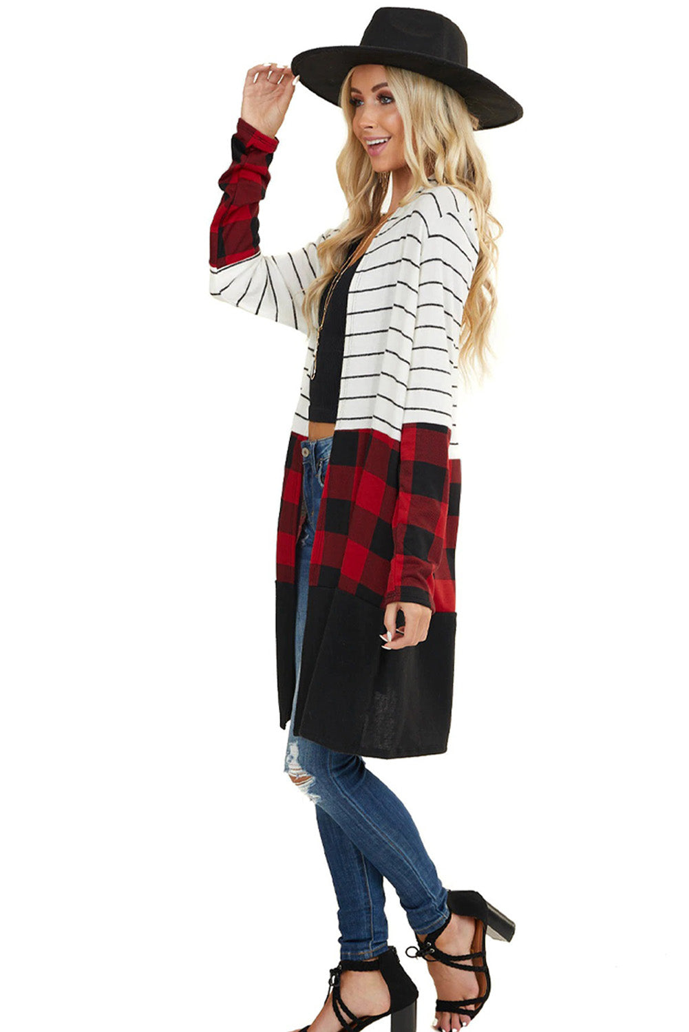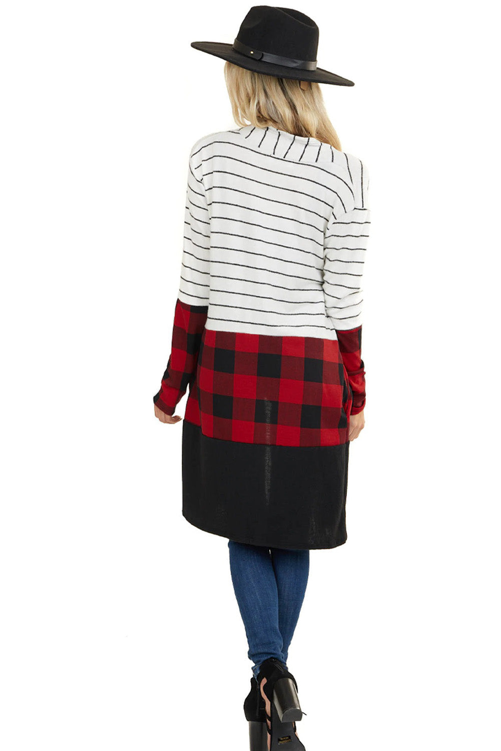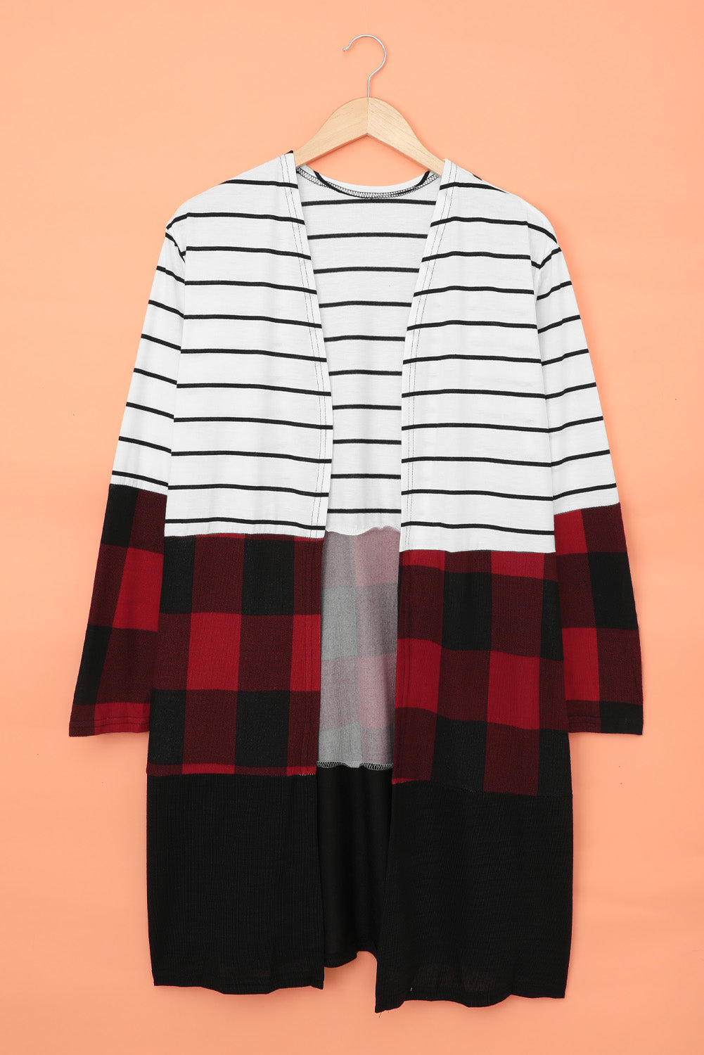 This Red Plaid Colorblock Striped Cardigan is the perfect addition to your wardrobe.