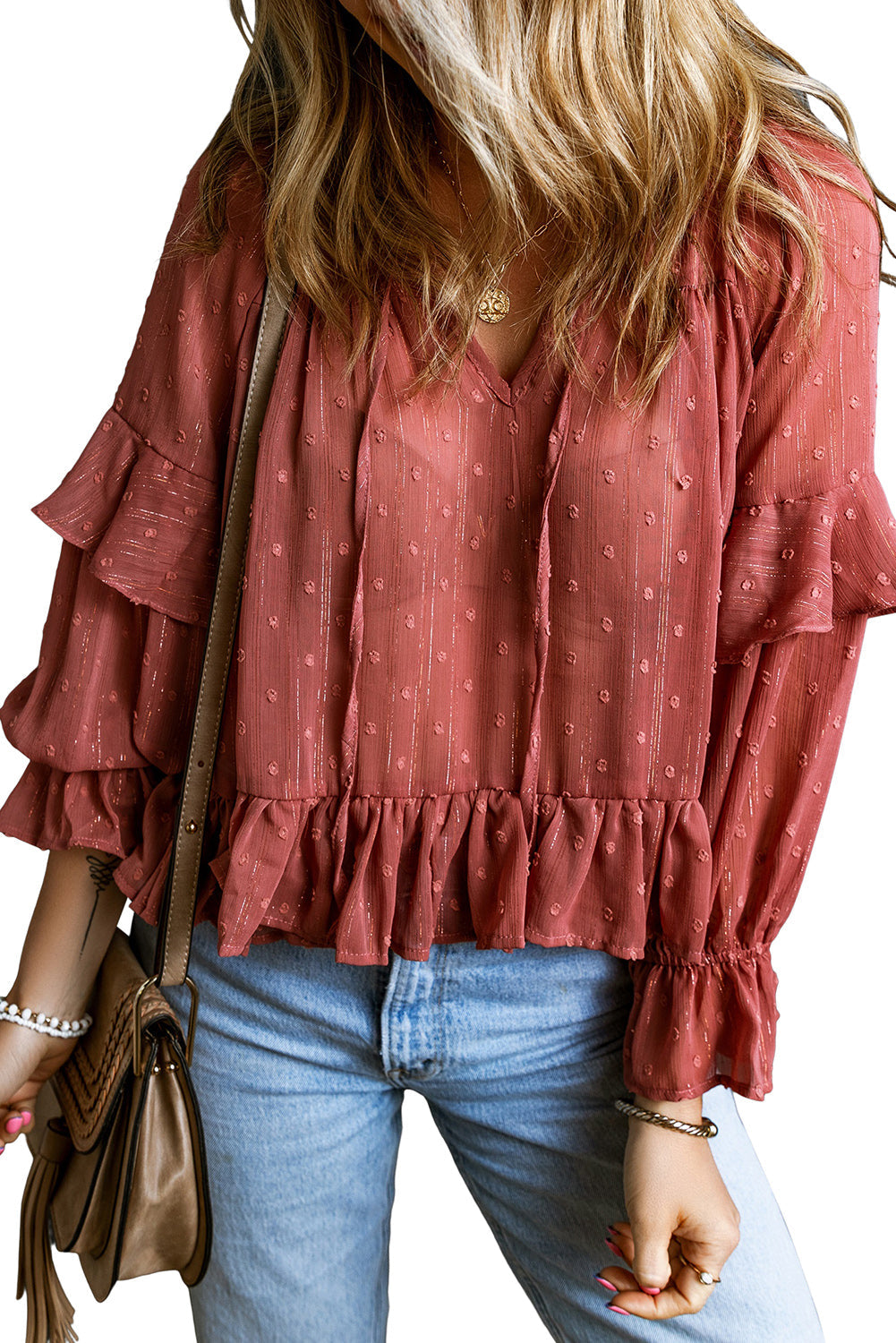 Red Swiss Dot Lace up V Neck Ruffled Blouse