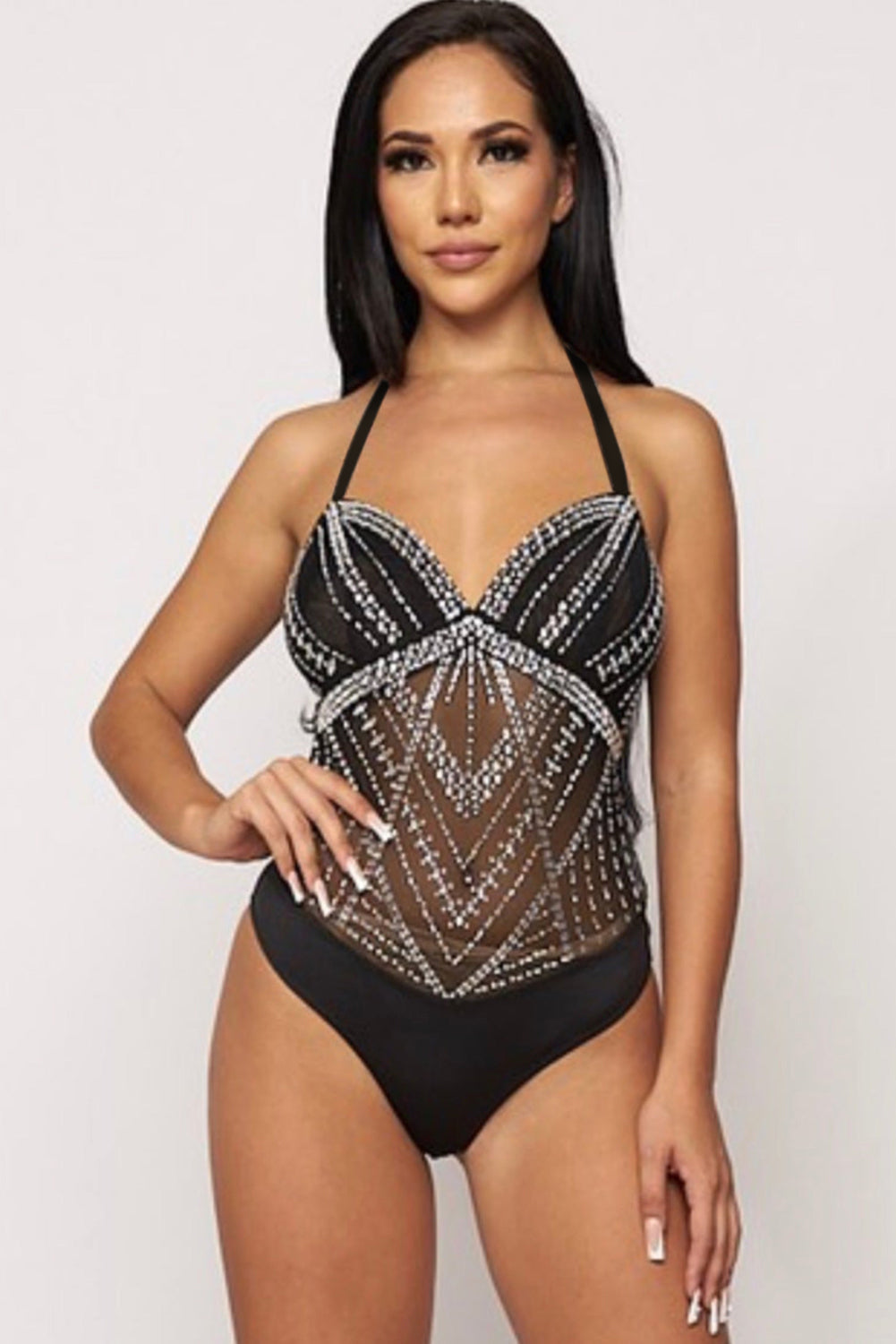 Be the envy of the evening in this stunning Rhinestone Sleeveless Halter Neck Bodysuit.