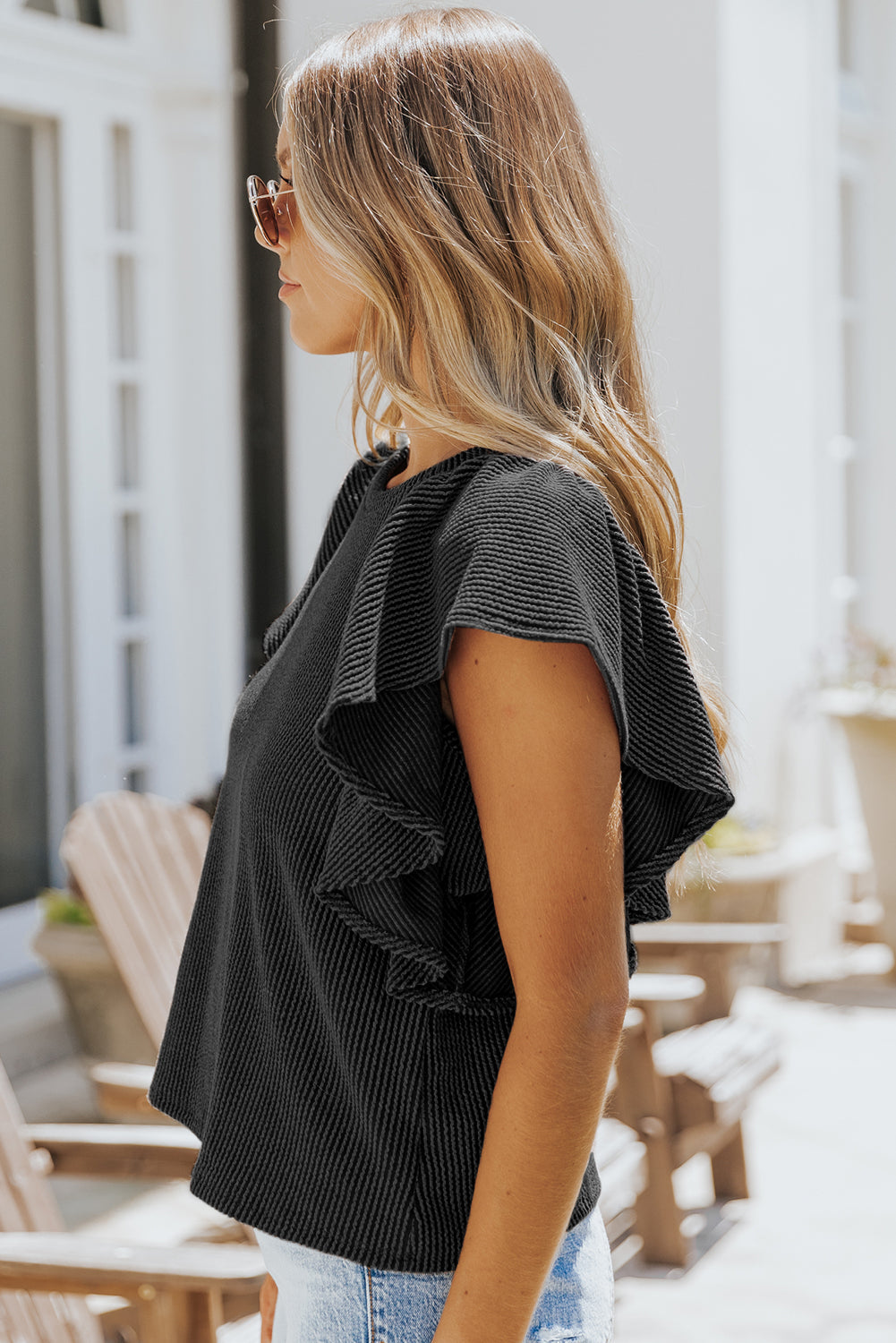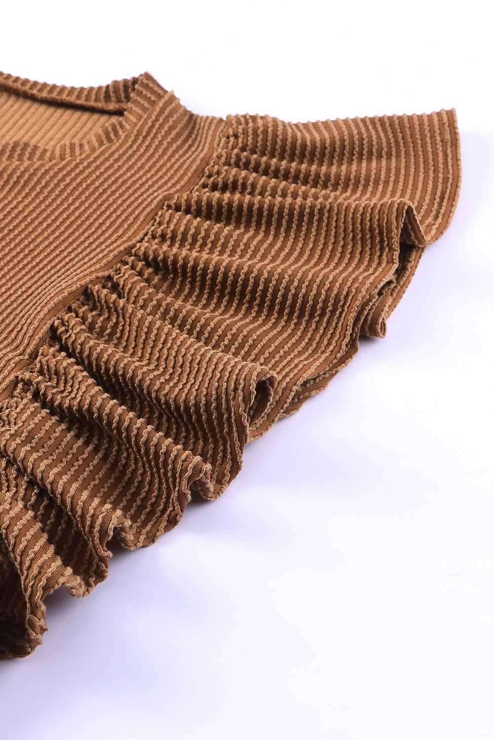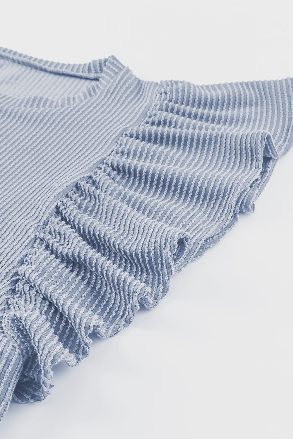 This Ribbed Knit Ruffled Short Sleeve T Shirt is a must-have for your wardrobe.