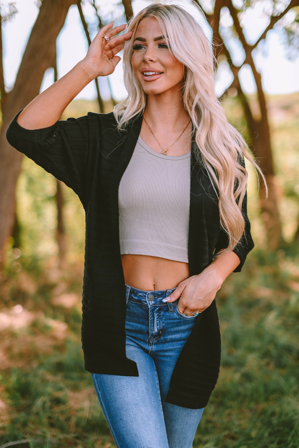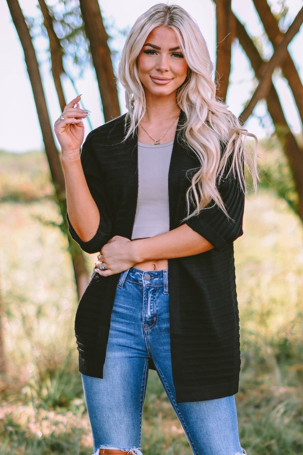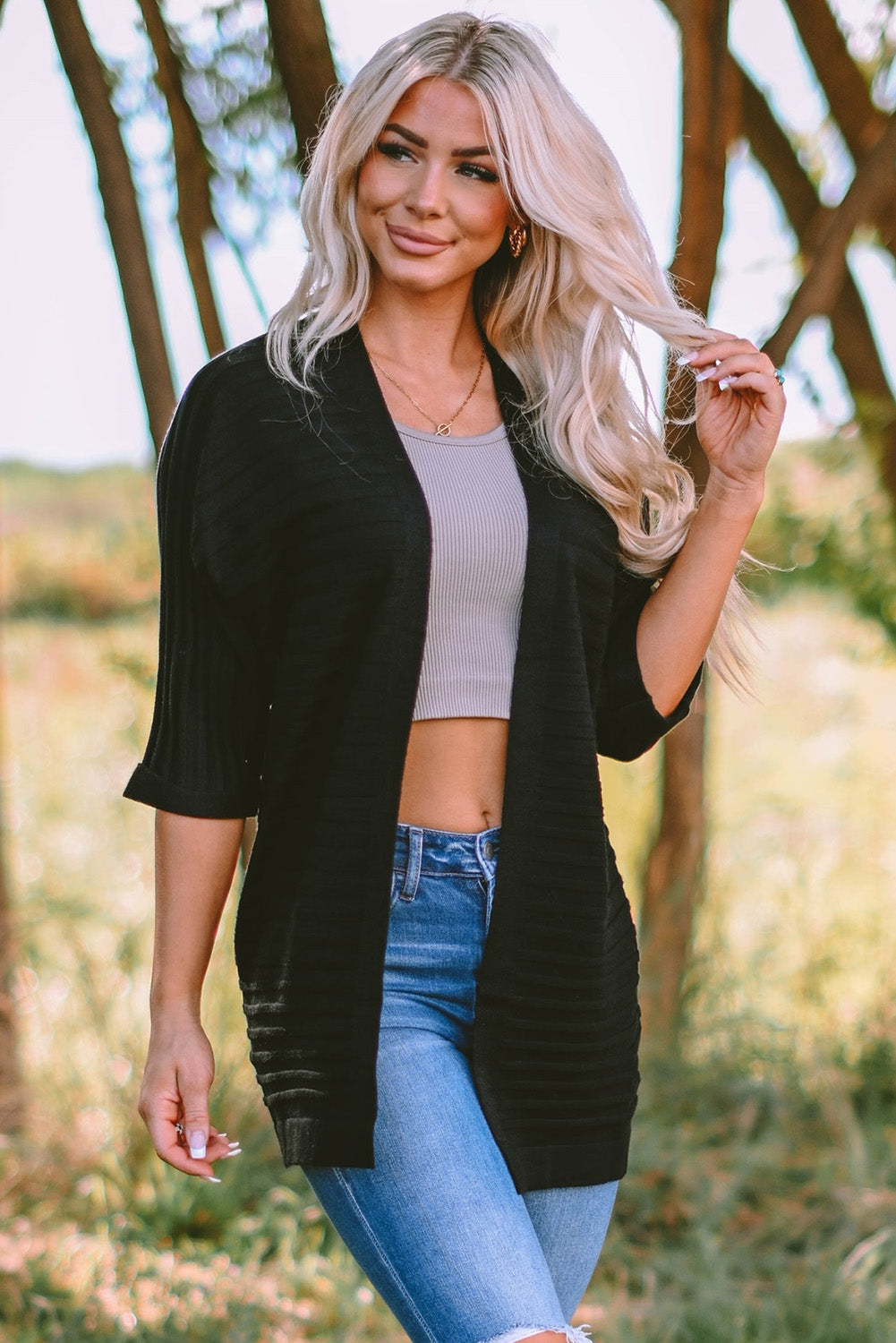 The ribbed texture gives it a unique look. while the open front design allows for easy layering.