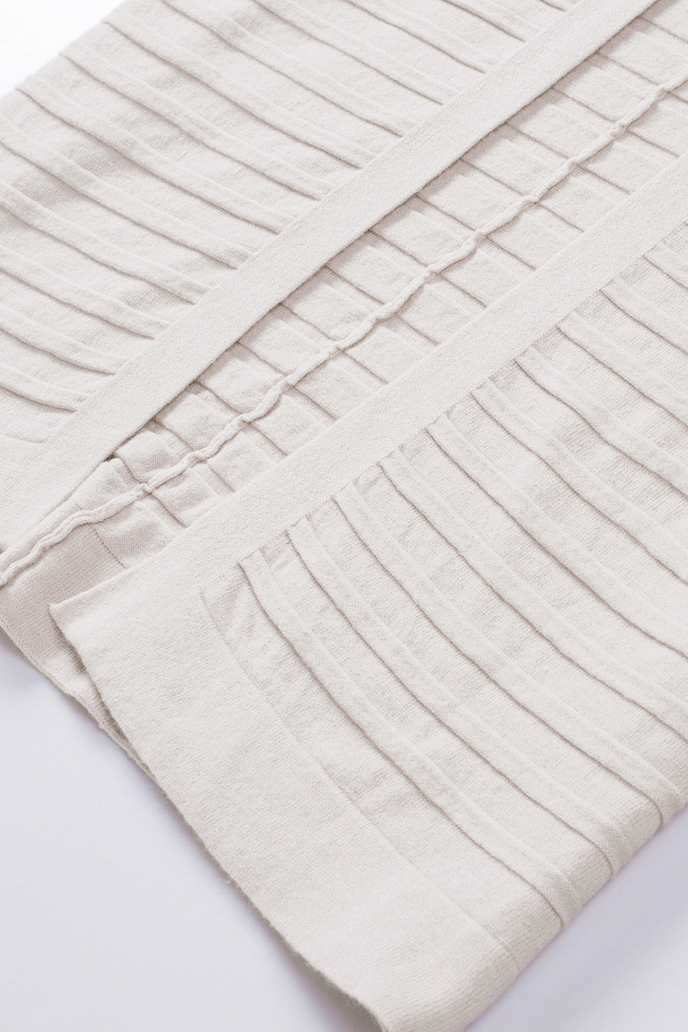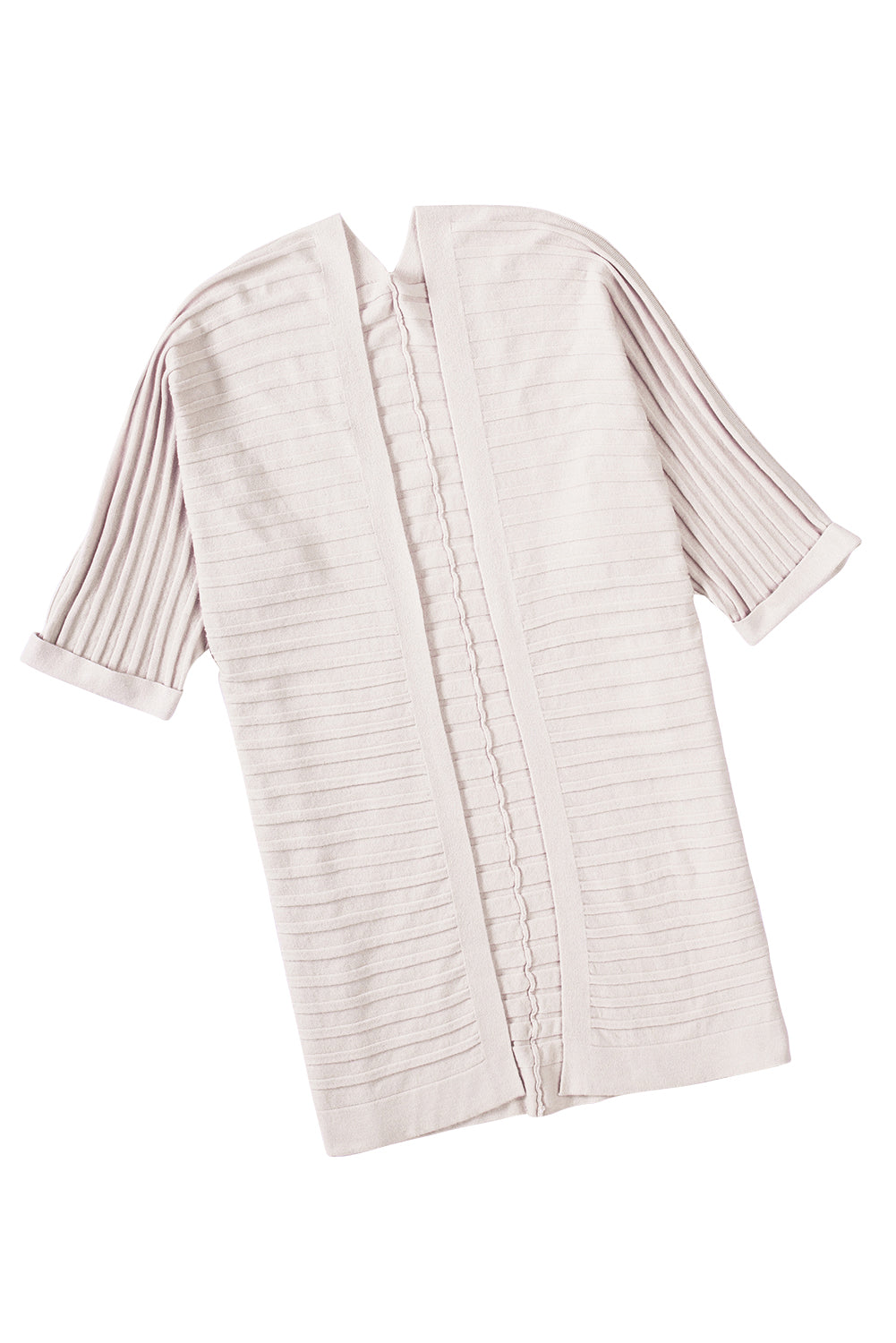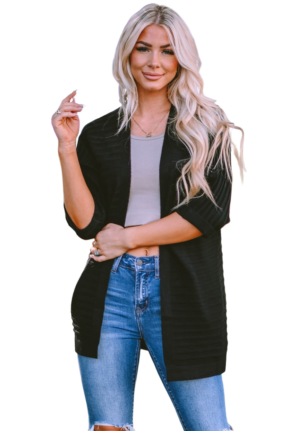 The ribbed texture gives it a unique look. while the open front design allows for easy layering.