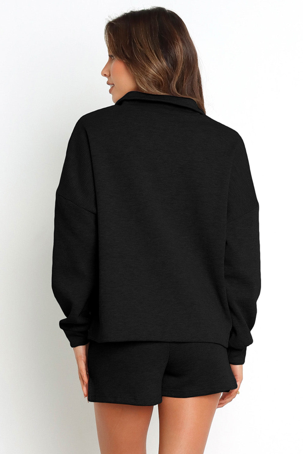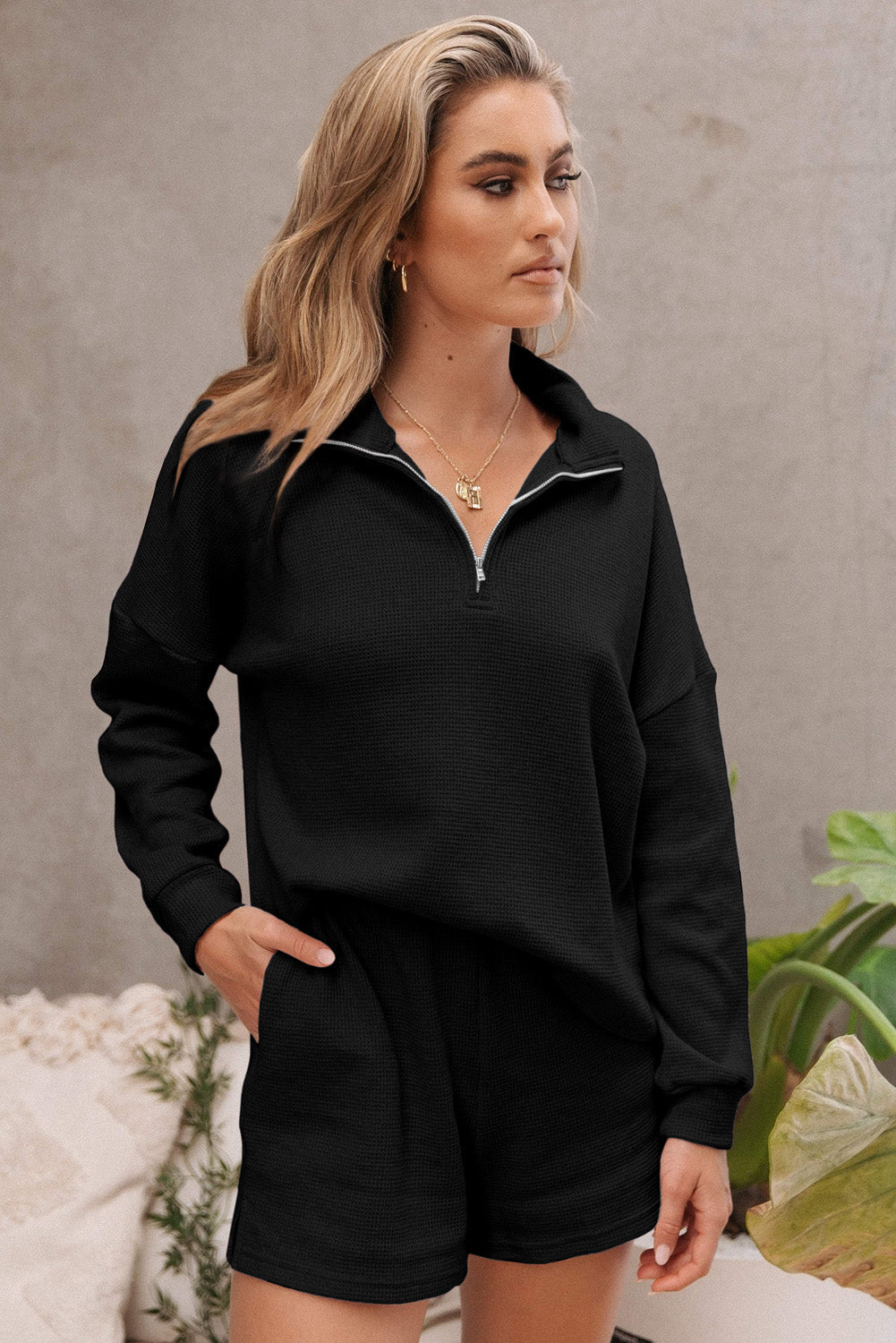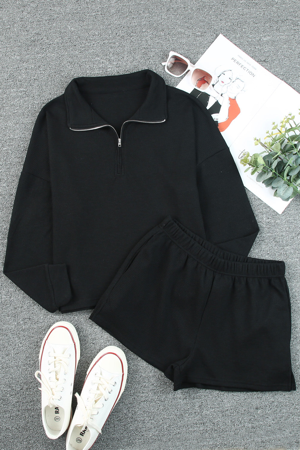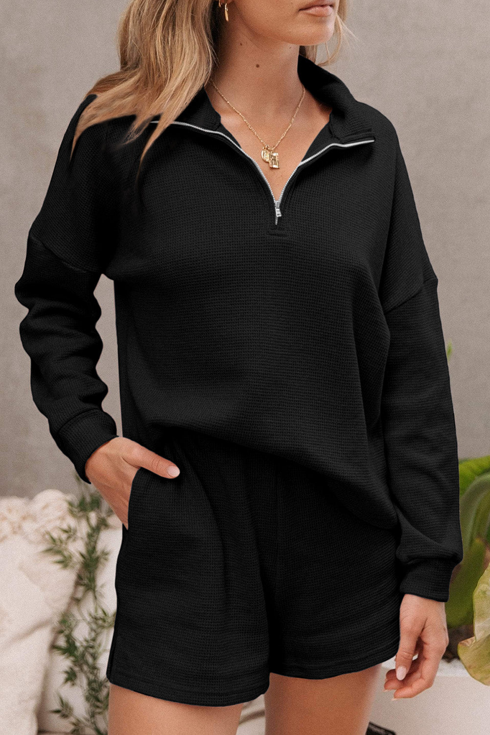 Ribbed Zipper Sweatshirt and High Waist Shorts Set