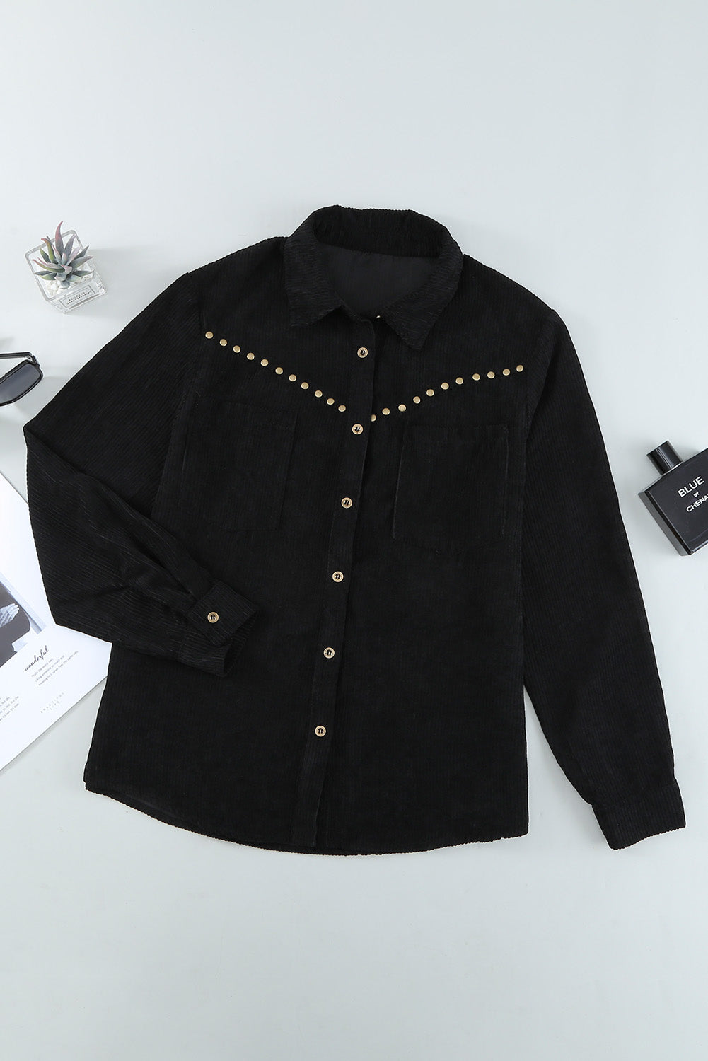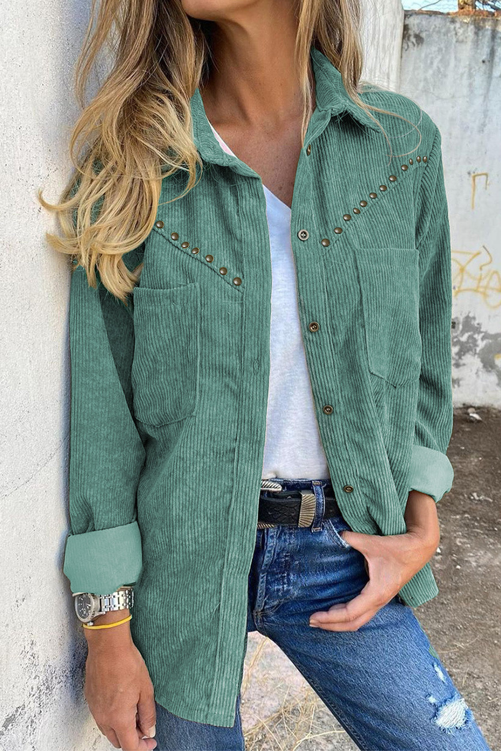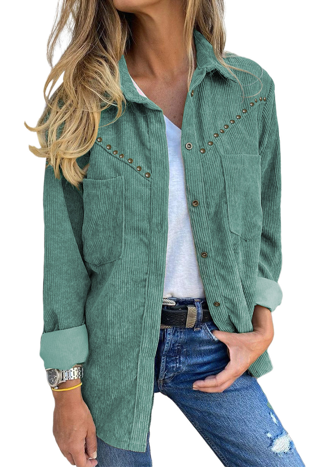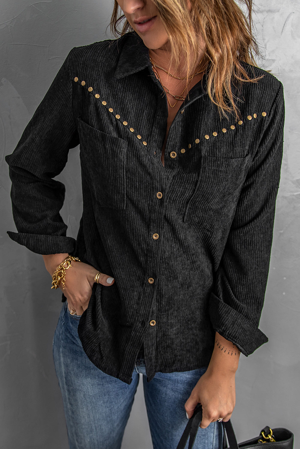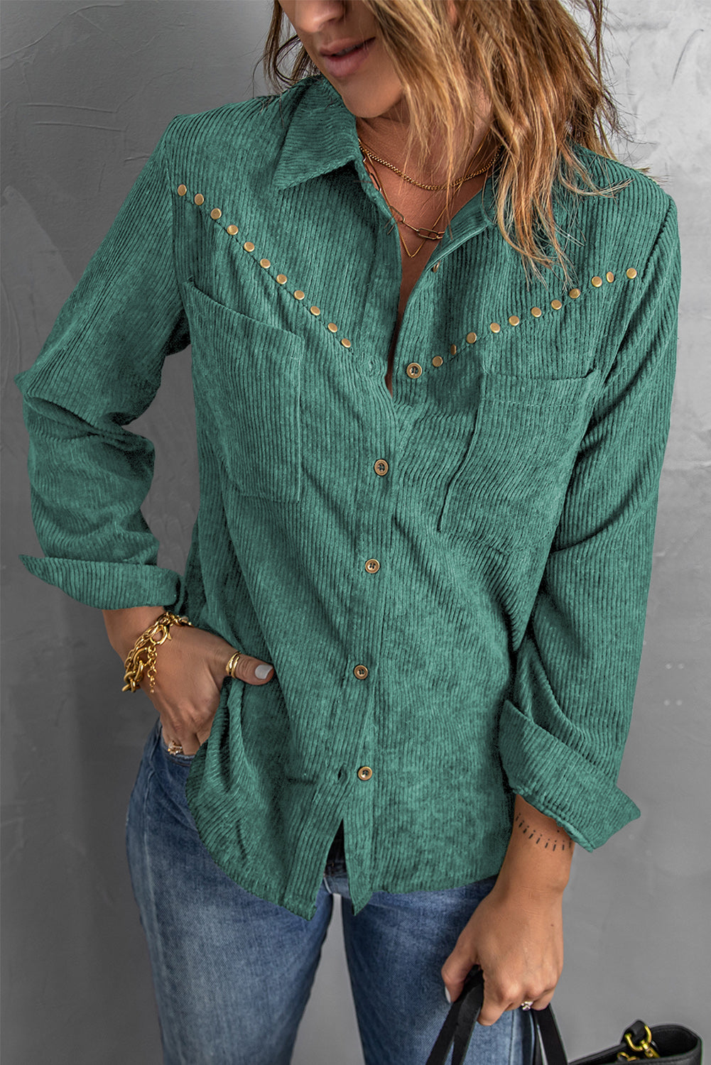 This Rivet Corduroy Buttoned Long Sleeve Shirt With Pockets is the perfect addition to your wardrobe.
