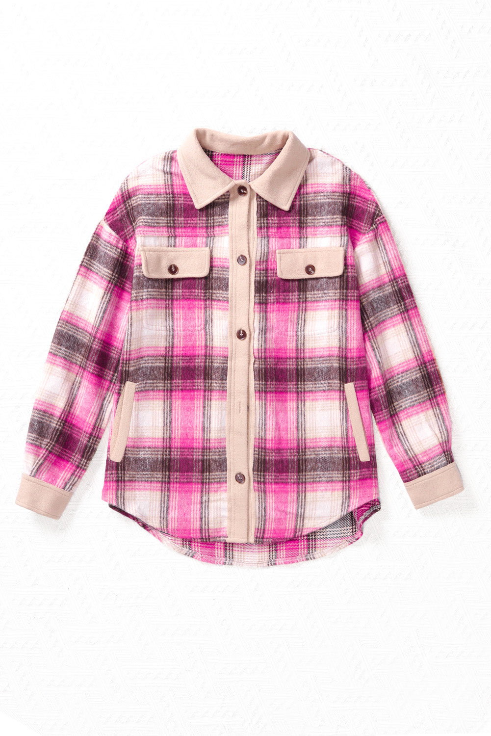 Introducing the Rose Contrast Trim Plaid Shacket. the perfect addition to your wardrobe this season.