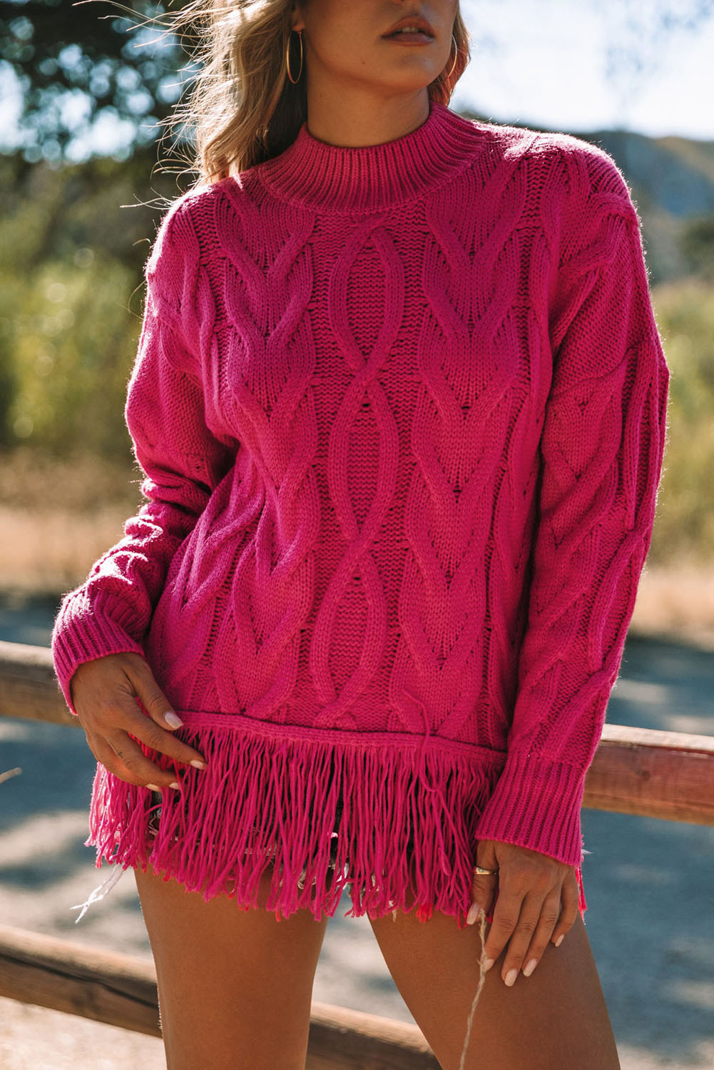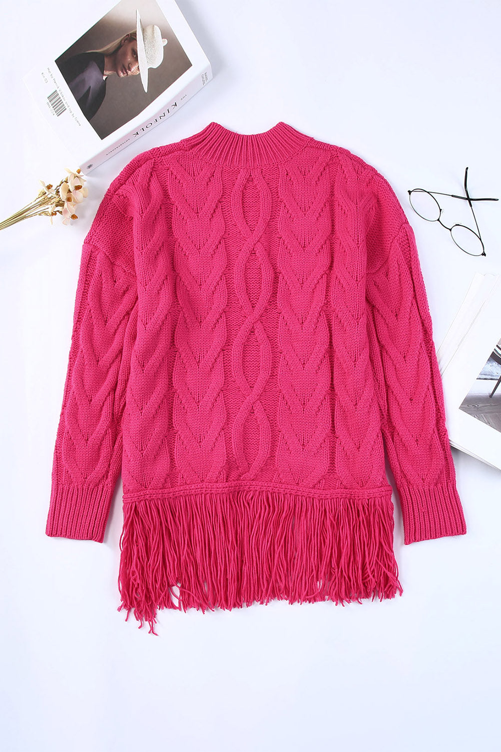 Introducing the Rose High Neck Cable Knit Tasseled Sweater. the perfect addition to your wardrobe this season.