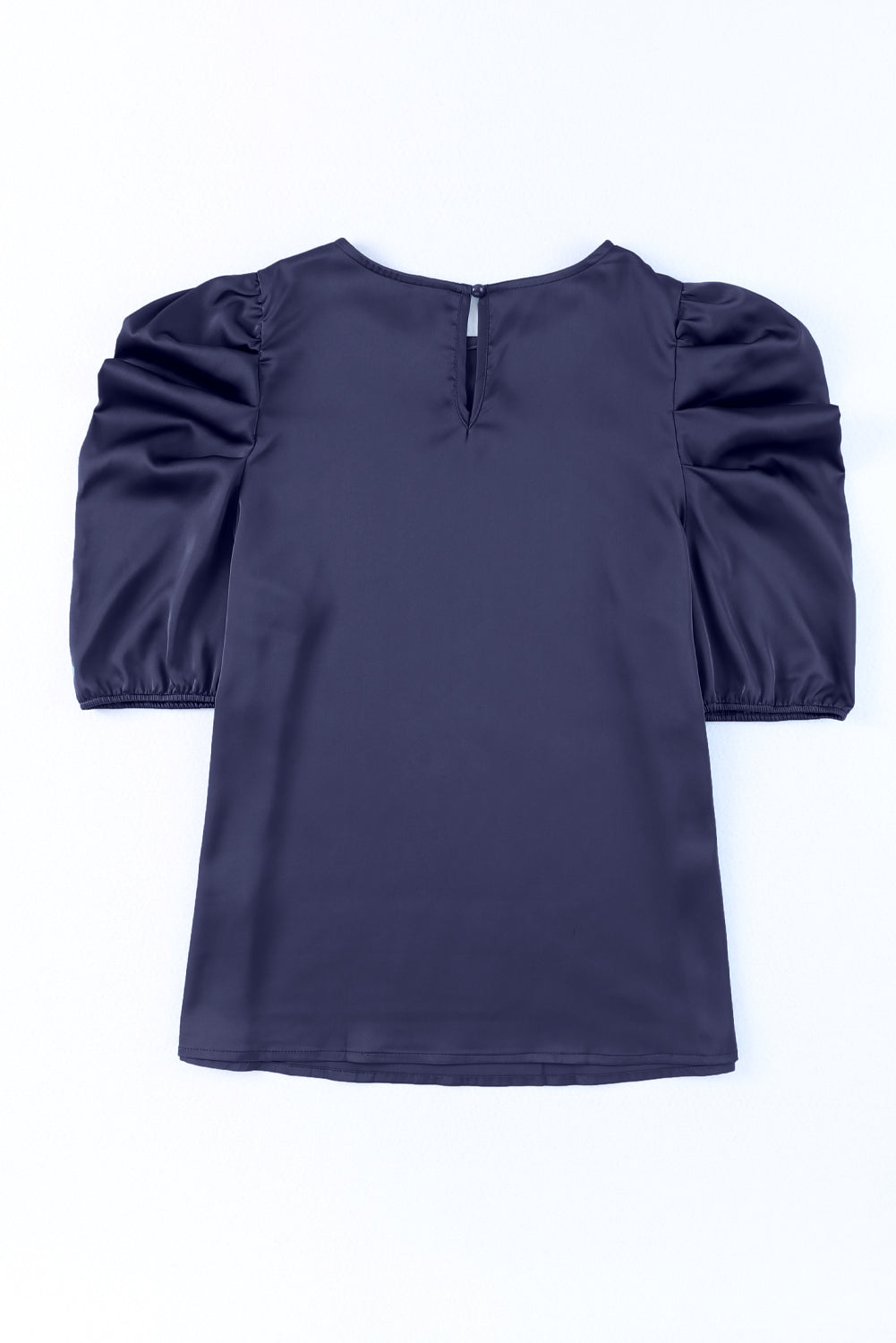 This Ruched Puff Short Sleeve Satin Blouse is a must-have for any fashionista's wardrobe!