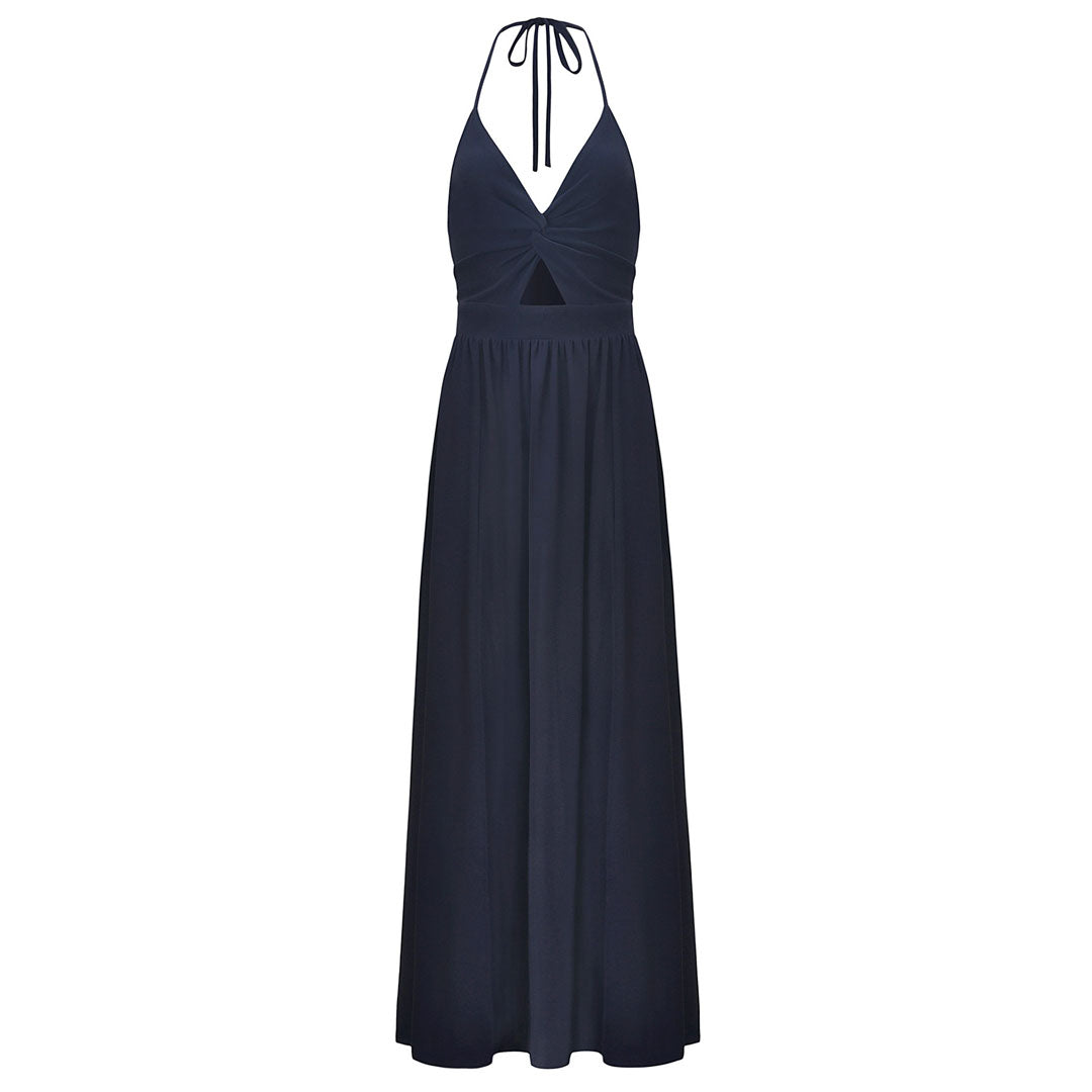The sexy dress details for the holiday resort encompass a solid color. a deep V-neckline adorned with cutout trim. a low scoop back. and a tied strap at the back. Additionally. it features a high thigh split and a maxi hemline. all designed using a lightweight chiffon and polyester fabric. To enhance the allure. complement the outfit with an exquisite necklace for a touch of glamour.