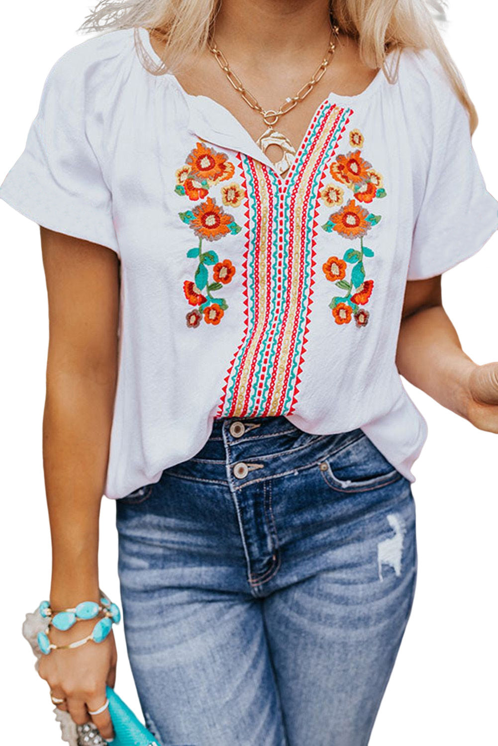 This Short Sleeve V Neck Floral Embroidered Blouse is the perfect addition to your wardrobe.