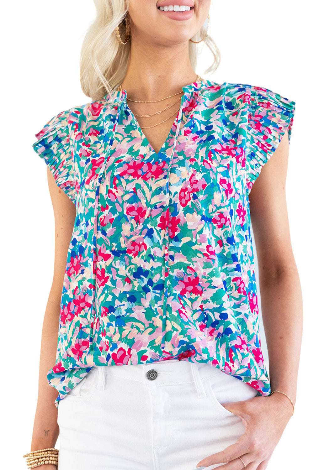 Look effortlessly elegant in this sky blue floral blouse. featuring a pleated flutter sleeve and tie V neck.