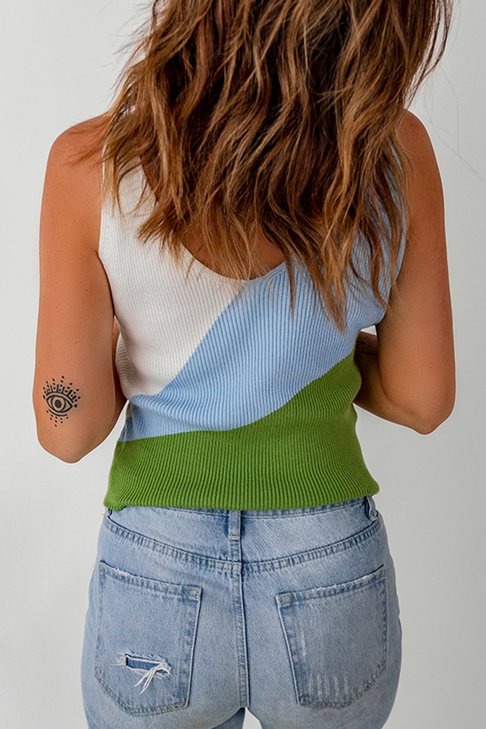 This Sky Blue Ribbed Knit Color Block Sweater Vest is the perfect addition to your wardrobe.