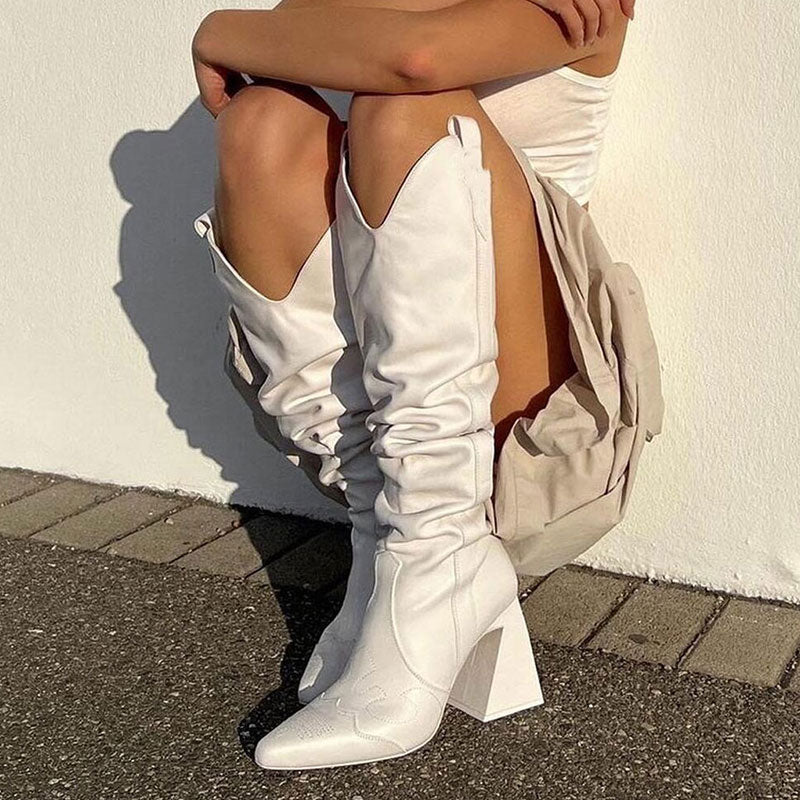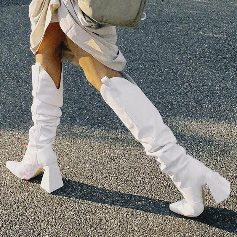 We are absolutely. positively obsessed with these knee-high boots! Made of PU leather. cotton blend and rubber. stand out in a sinuous flared block heel. featuring a pointy layered upper dotted with fancy stitch detailing. a soft footbed. a synthetic leather shaft trimmed with a pull-tab at the curved collar. a slouchy pull-on styling embodied with an over-the-knee shaft. ending up with a rubber patch. Find more trendy women's geometrically heeled boots and unique shoes in our boutique. and style them with a backless mini dress and a strawberry cardigan - Heel height: 9.5cm.