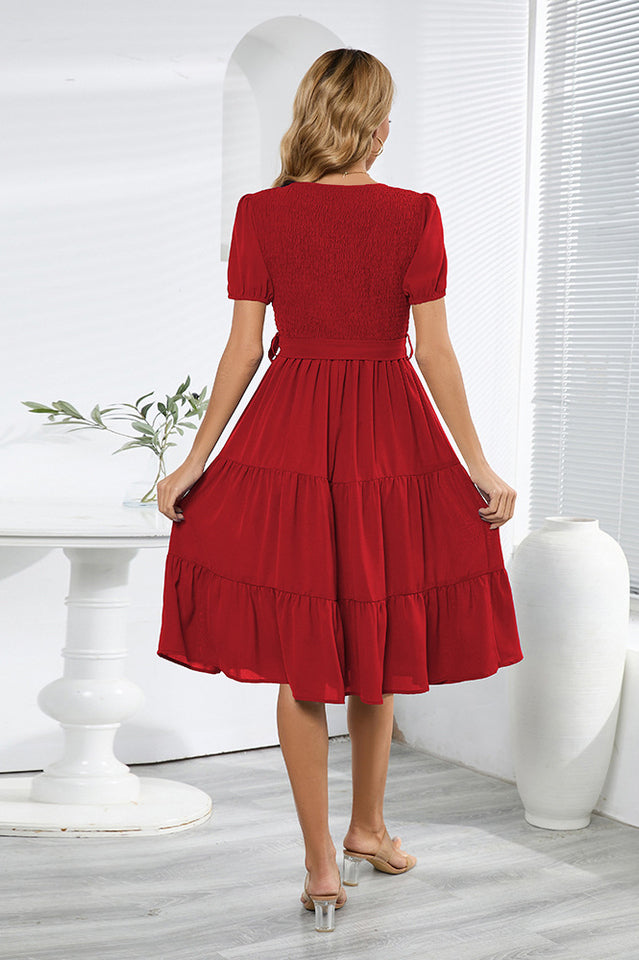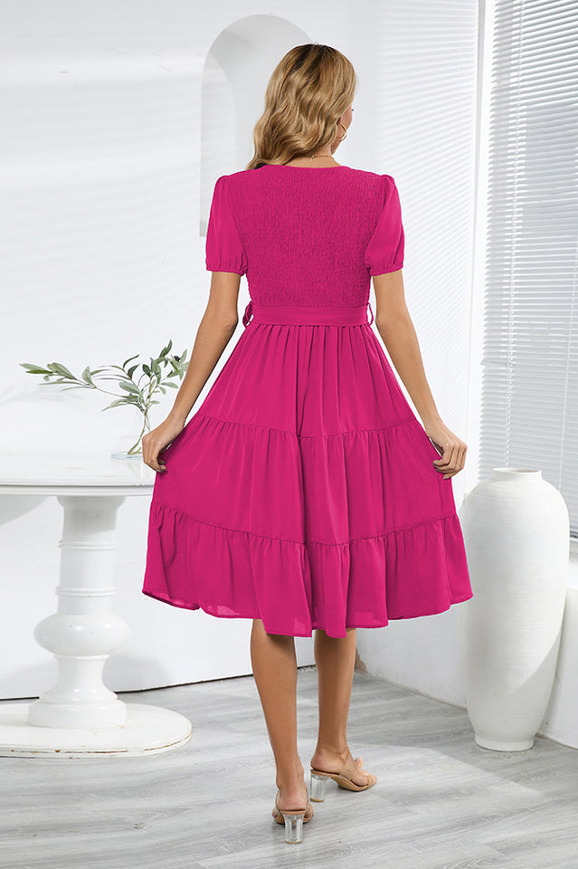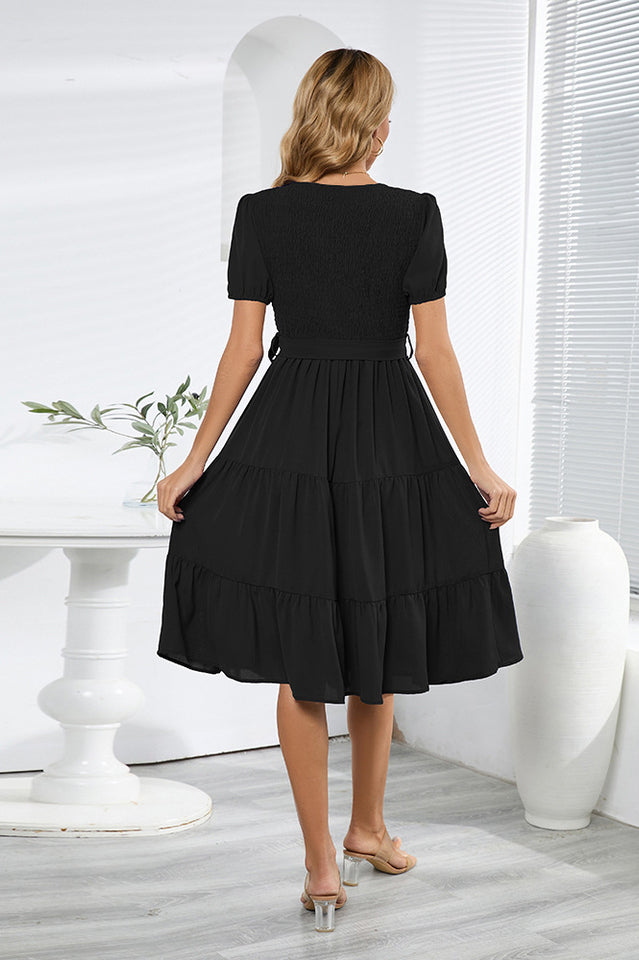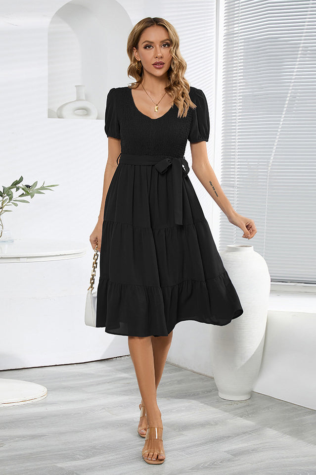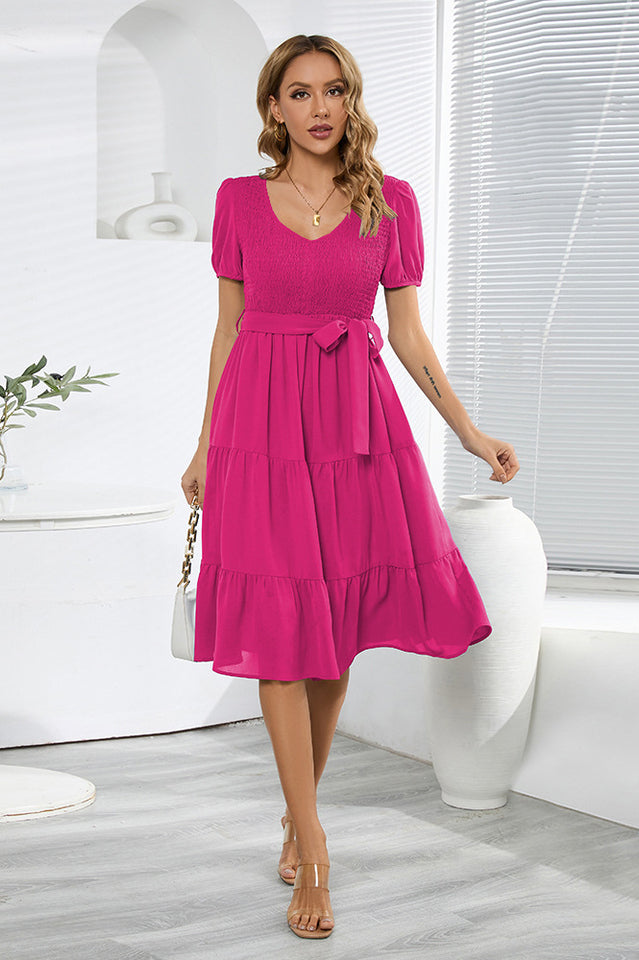 Skater dress in round neck. short sleeves. smocked with tiered details. tie-belt waist. solid colour and a midi length. Style this dress with any solid sandals or wedges and a handbag.