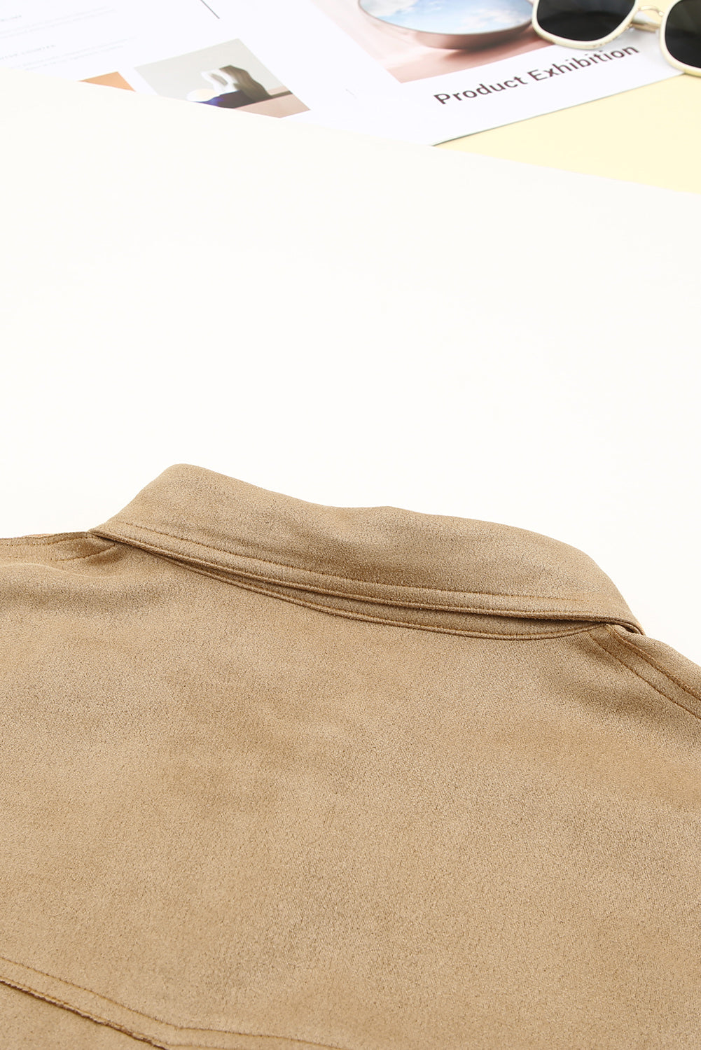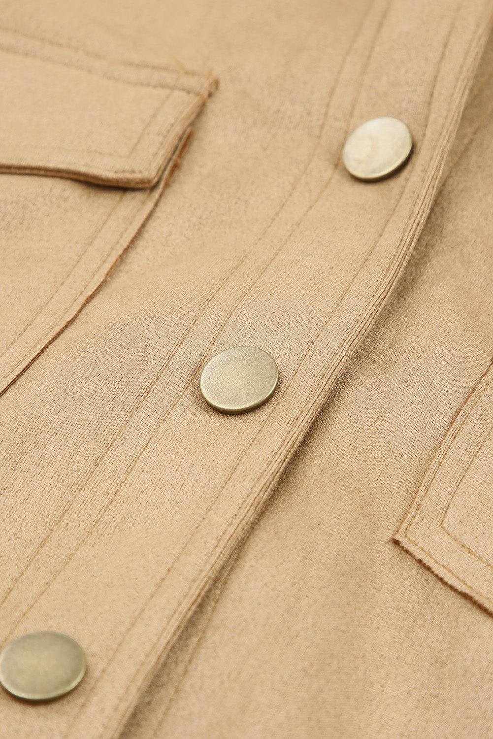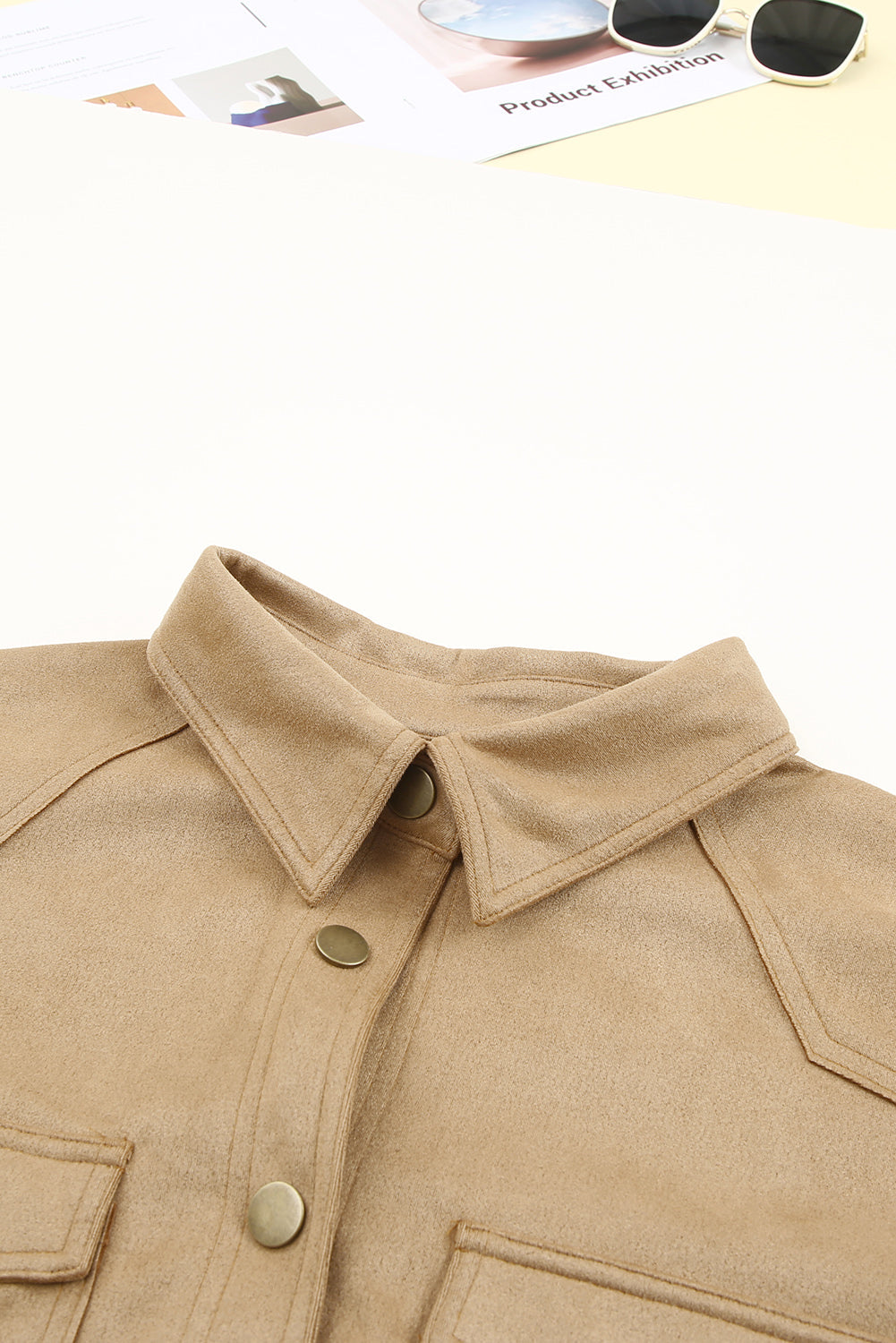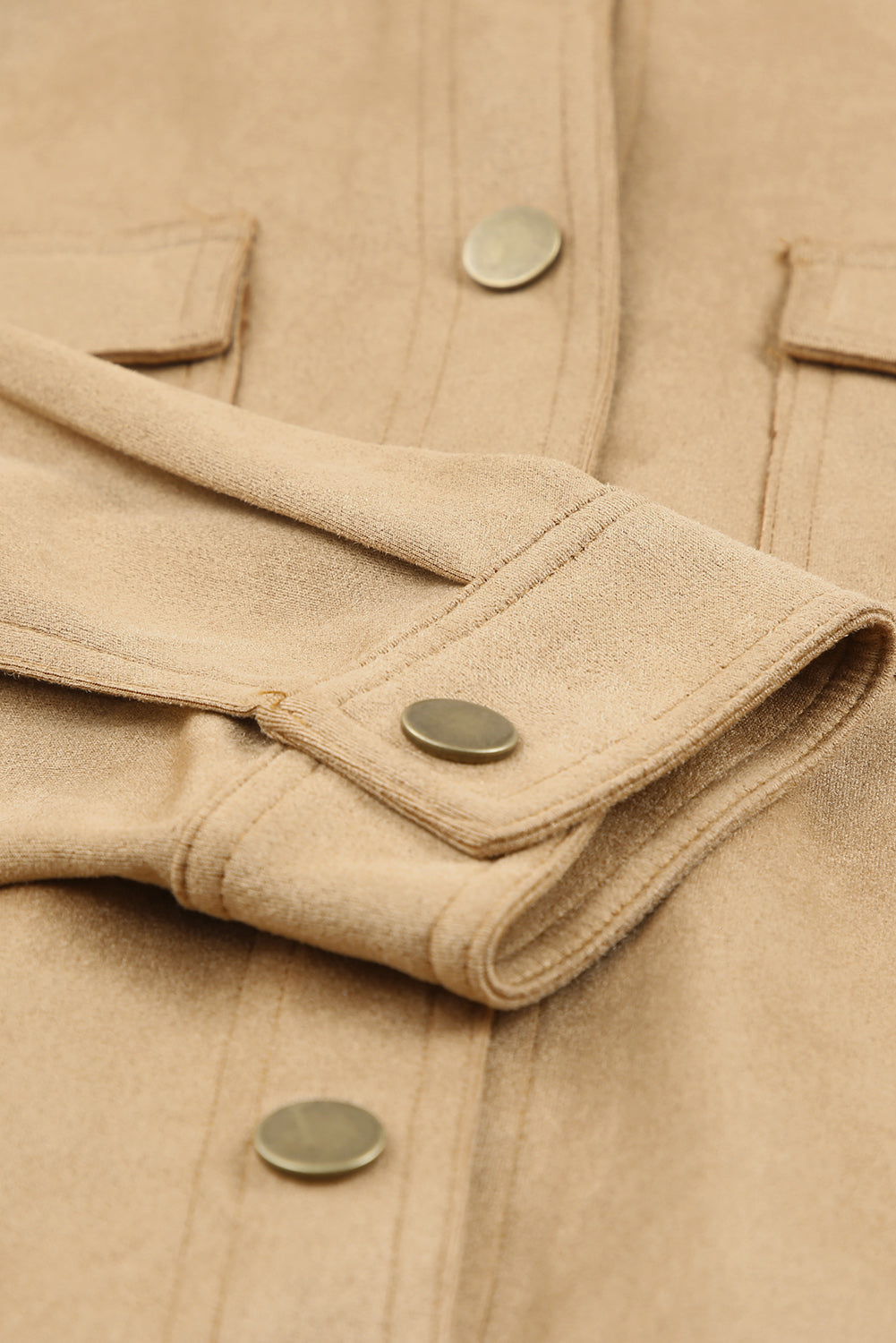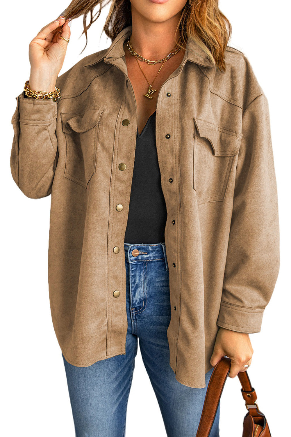 Introducing the Snap Button Up Suede Jacket. the perfect addition to your wardrobe.
