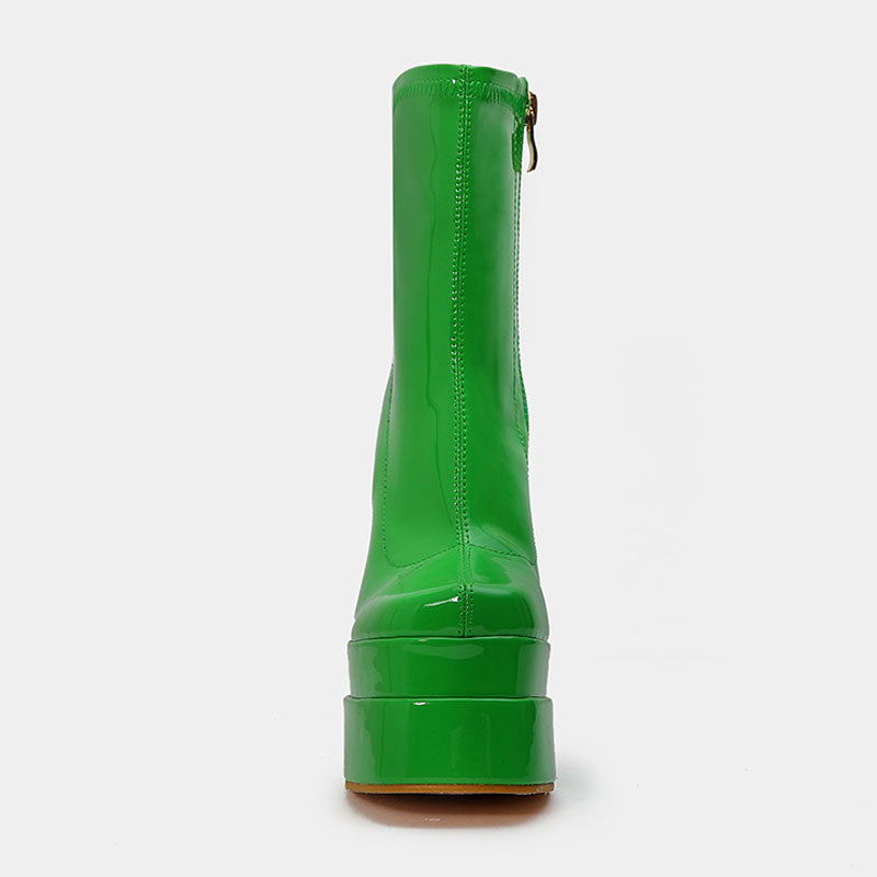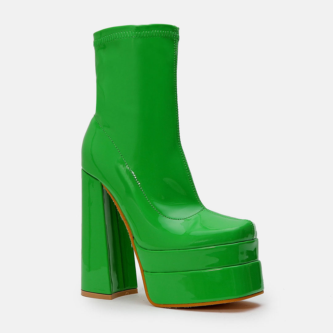 For every time you want to be your best self. you can achieve it in the platform booties! Made of PU leather and rubber. stand out in a heavy two-tiered platform. featuring a square toe enhanced by a polished upper. a slightly cushioned footbed followed with a towering covered block heel. a slim-fit styling trimmed with a tonal exposed zip fastening and seams stitch detailing. Find more trendy women's square-toe boots and unique shoes in our boutique. and wear them with a leather dress or a bodycon matching set for a gorgeous look - Heel height: 14.5cm.