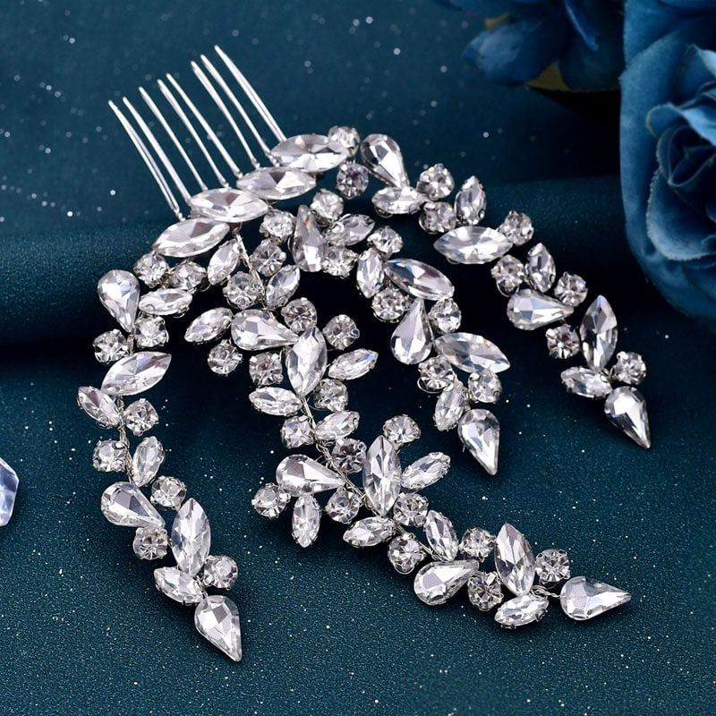 This shiny headpiece takes inspiration from olive branches. an influence observed throughout that will dazzle everyone in sight! Made of silver-tone hardware. stand out in twiggy motifs. featuring hand-wire strands emphasized by teardrop strass. faceted gemstones and marquise-cut crystals. an easy-wear styling finished with a metallic hair comb at the end. Find more trendy women's bridal hair combs or unique hair accessories in our boutique. and team it with everything-depending on the fabulous look you want.
