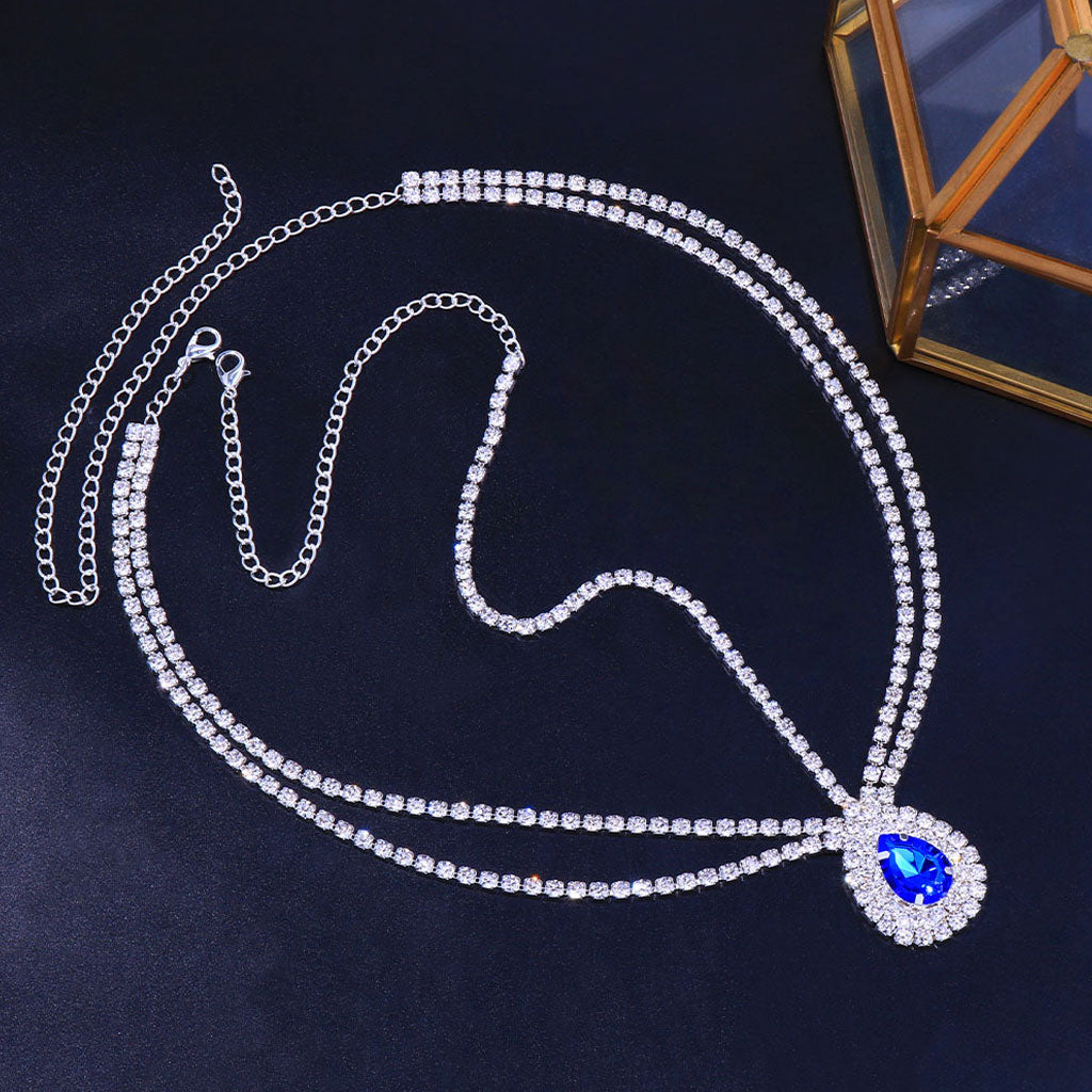 Glitzy yet modern. this statement hair chain will glimmer in any hairstyle. Made of silver-tone hardware fabric. embellished with its fully rhinestones encrusted surface. featuring sparkling chains that drape around your hair. an exaggerated blue water-drop at the center front. an extended chain for an adjustable fit. Find more trendy women's hair chains or chic hairwear in our boutique. and finish the chic boho look with our unique hair accessories.