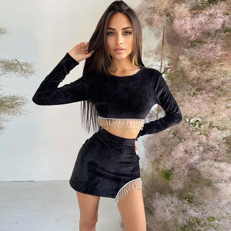 Sparkly Rhinestone Fringe Cut Out Velvet Crop Skirt Matching Set - Black