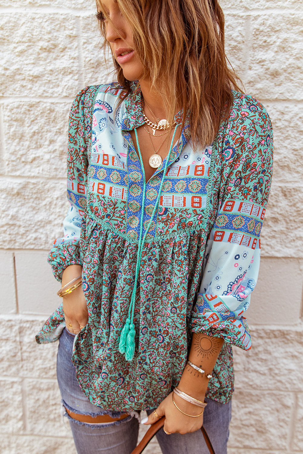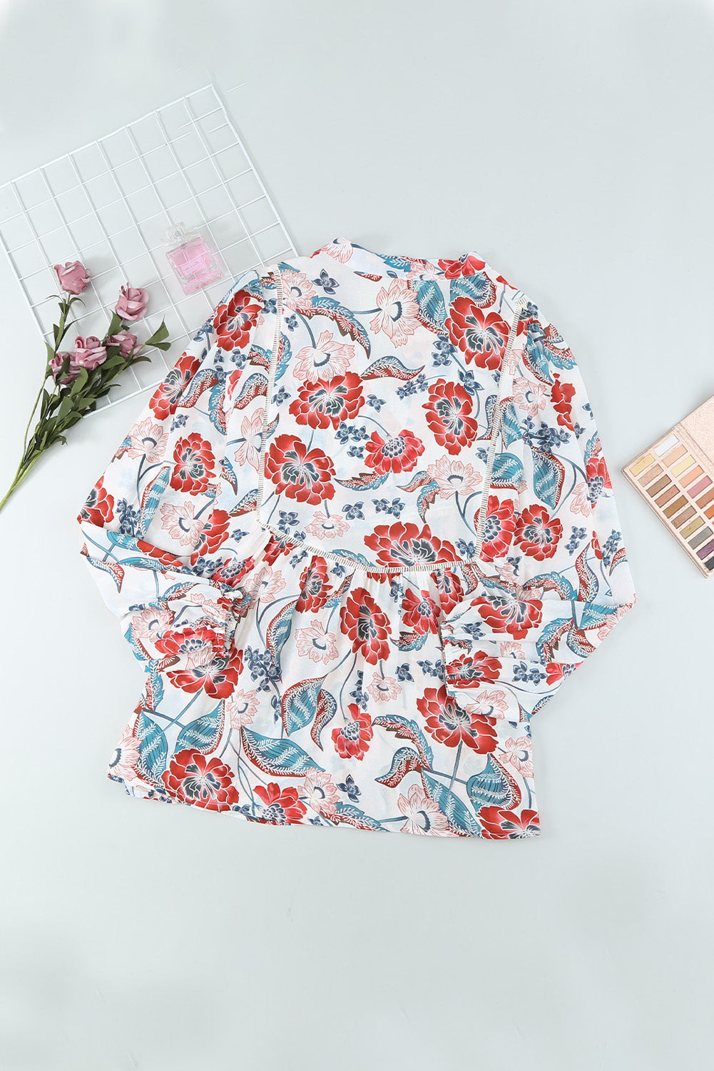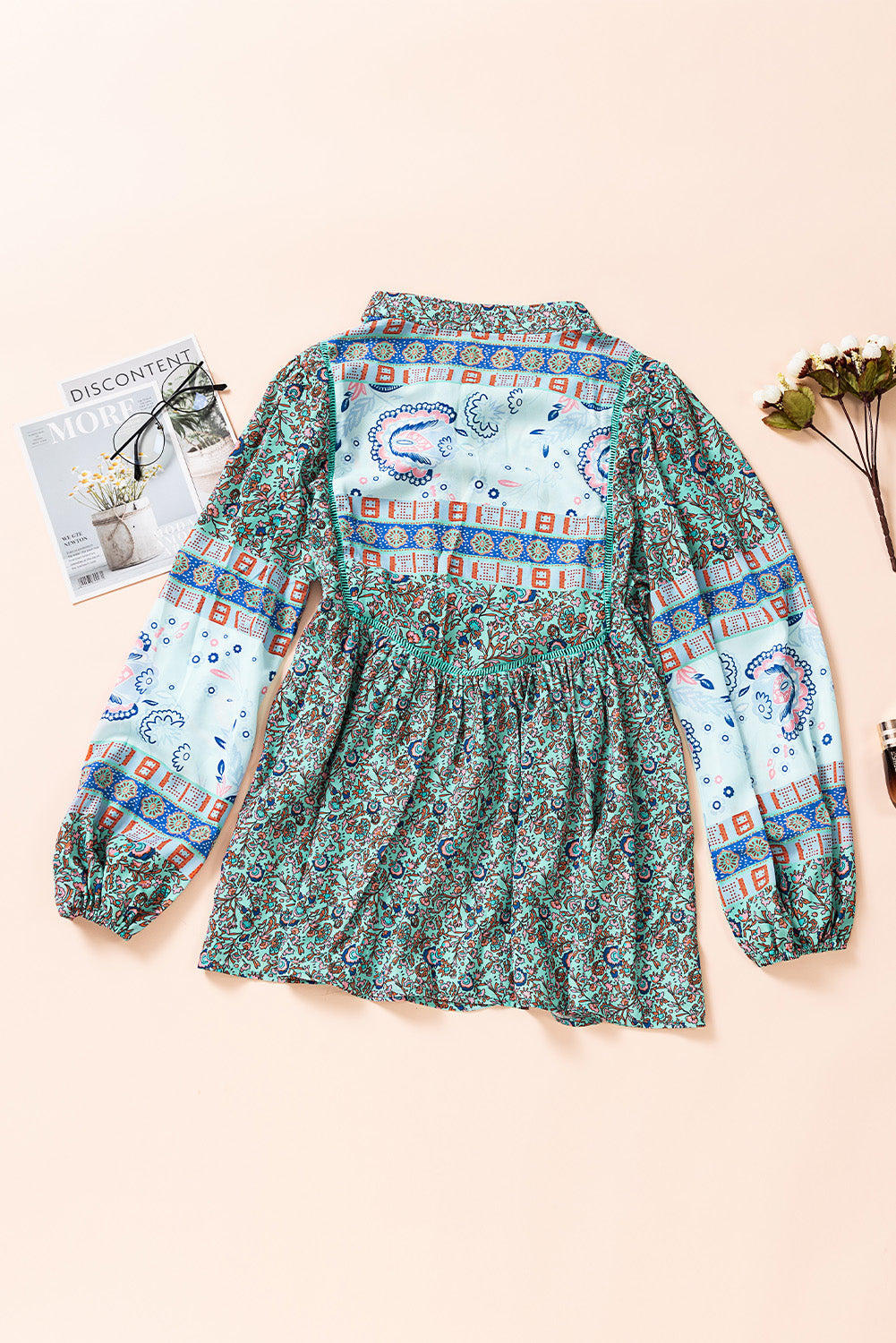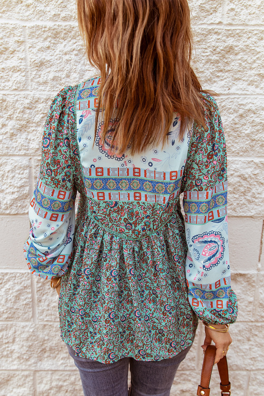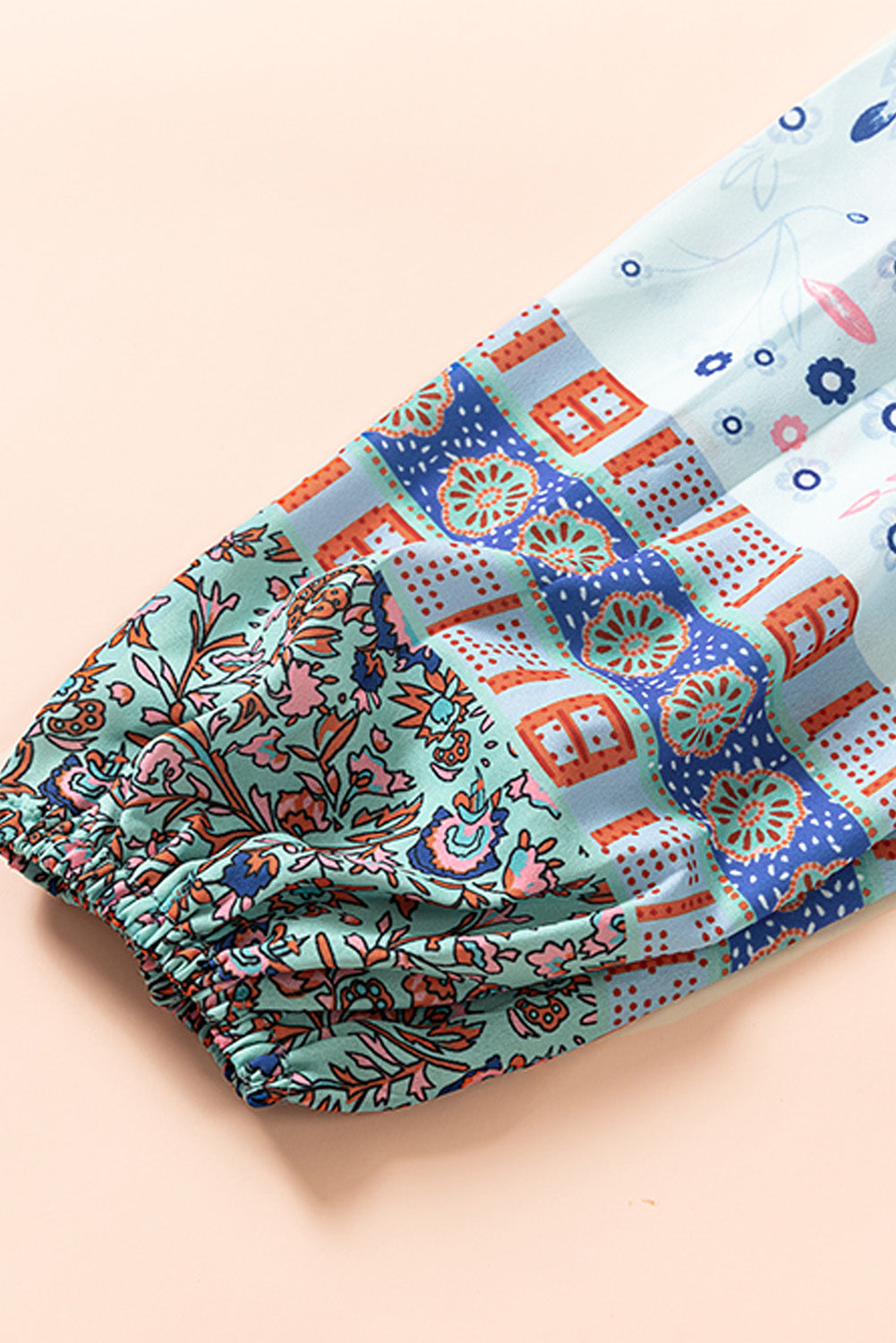 This Split Neck Bubble Sleeve Floral Patchwork Blouse is the perfect addition to your wardrobe.