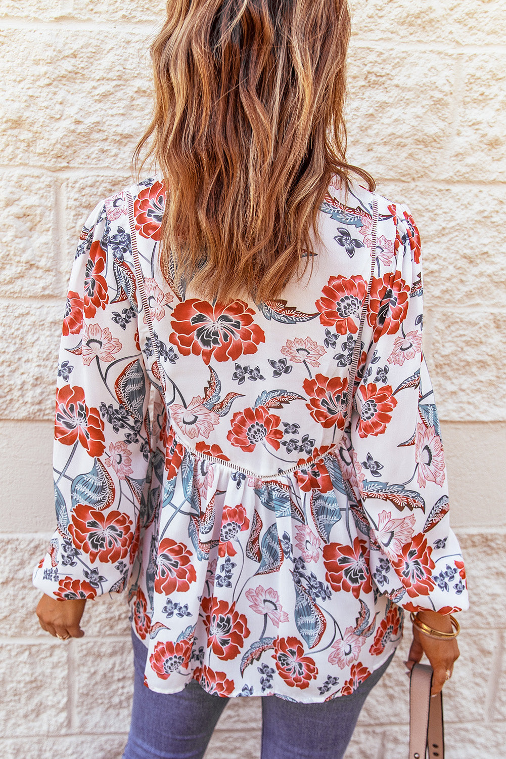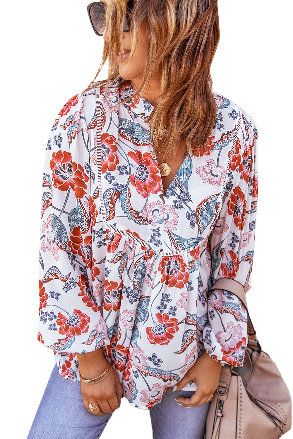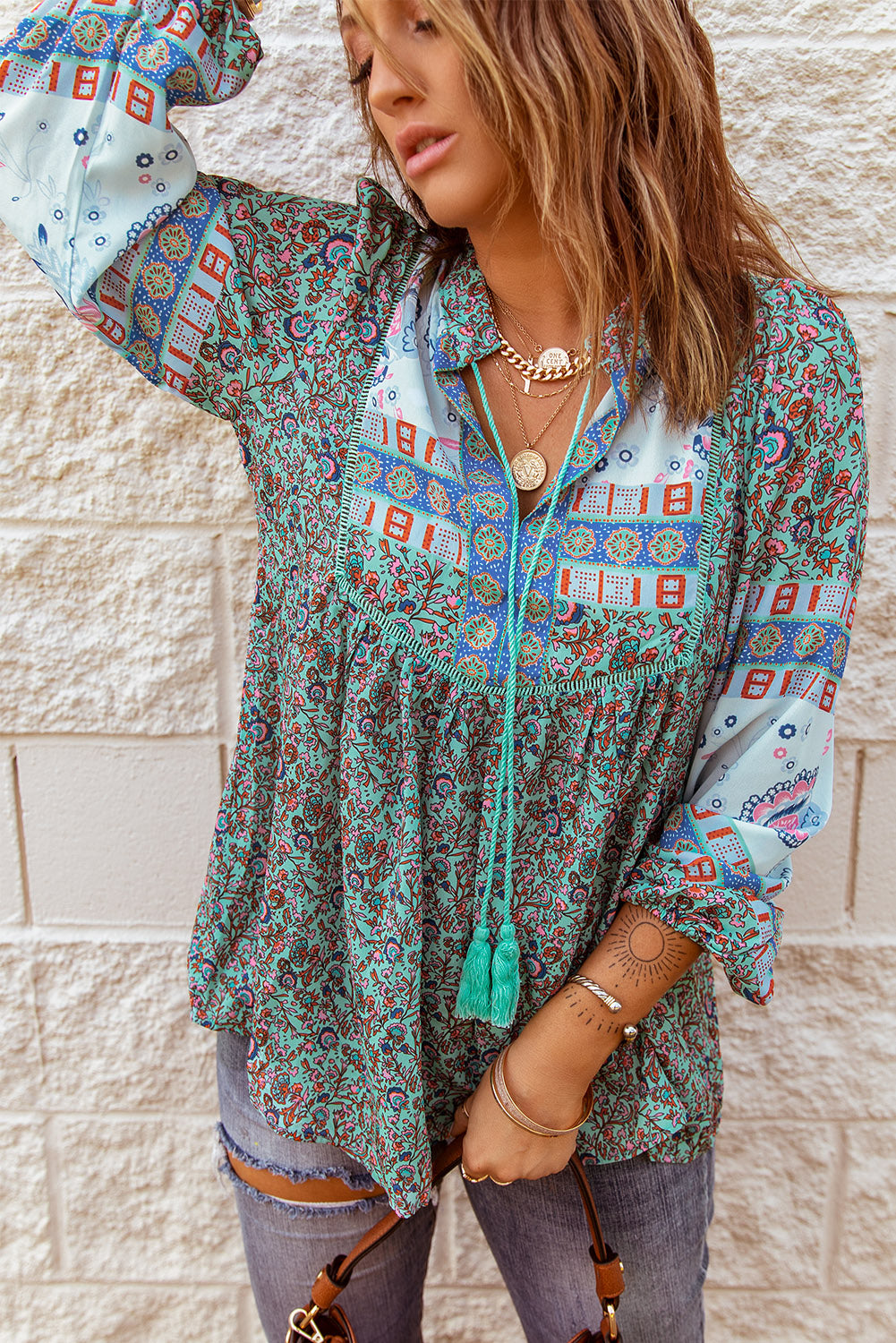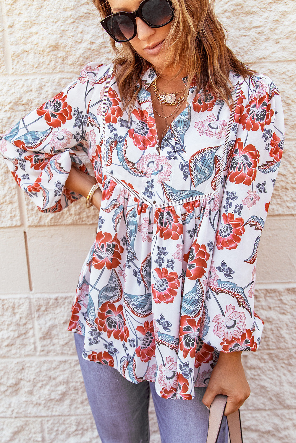 This Split Neck Bubble Sleeve Floral Patchwork Blouse is the perfect addition to your wardrobe.