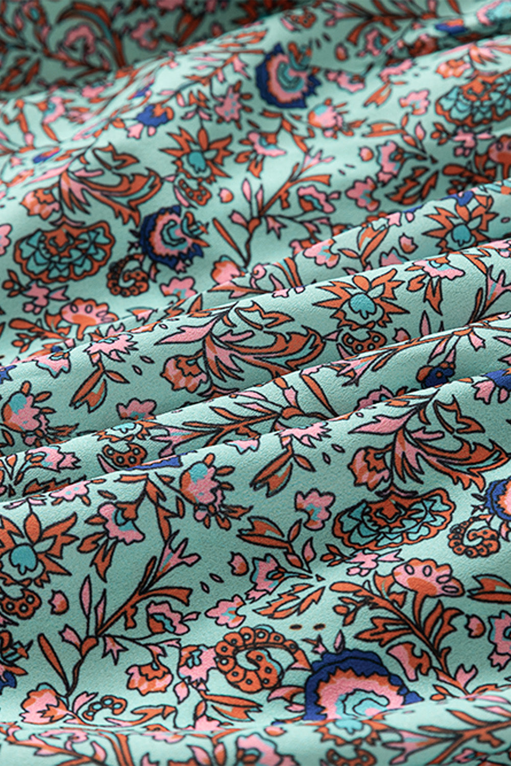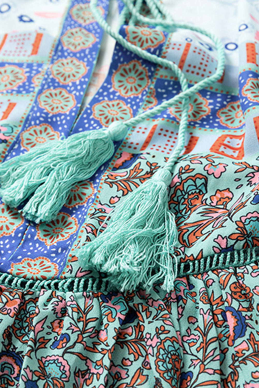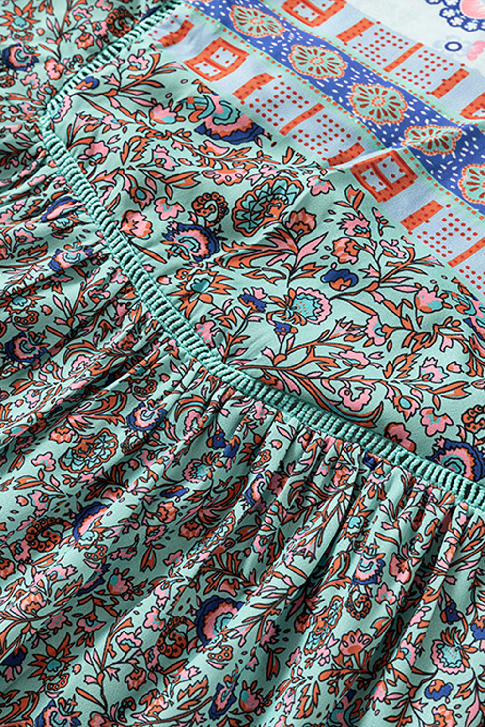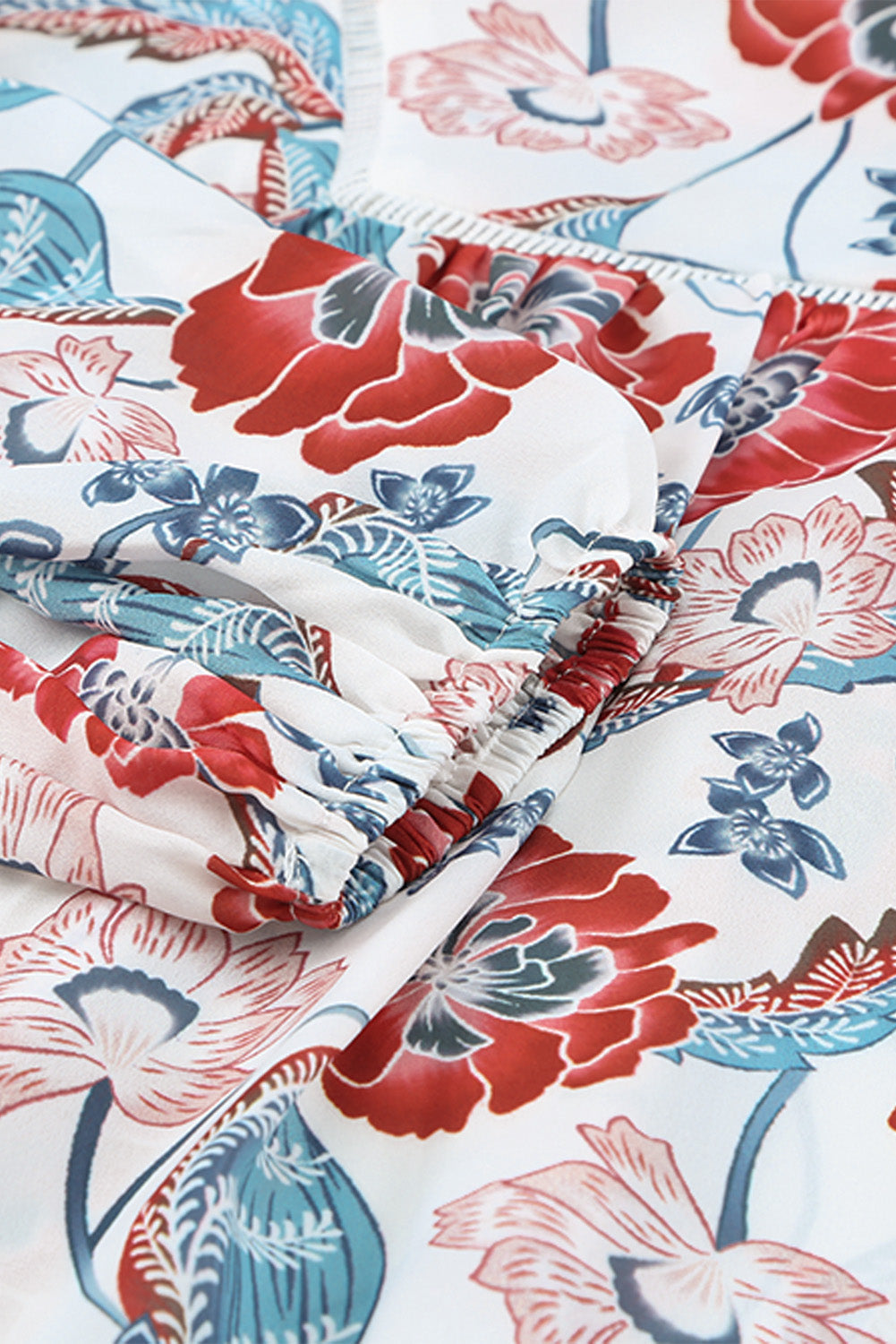 The split neckline and bubble sleeves add a touch of femininity and elegance. while the floral patchwork design adds a unique and stylish touch.