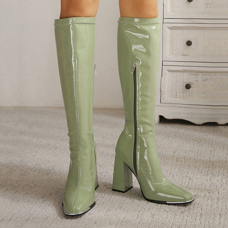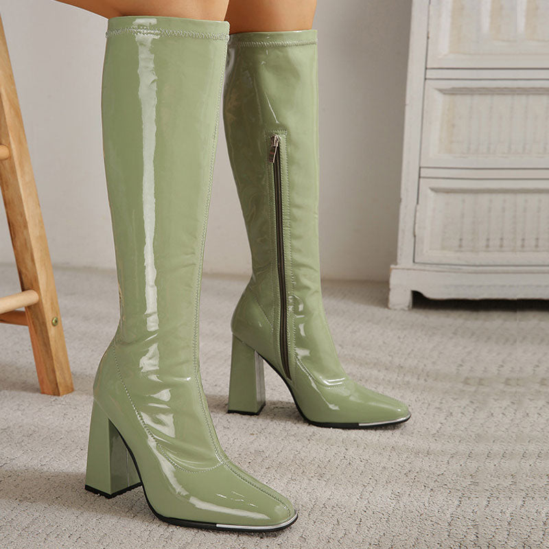 Striking Square Toe Patent Leather Block Heel Knee High Boots - Olive Green