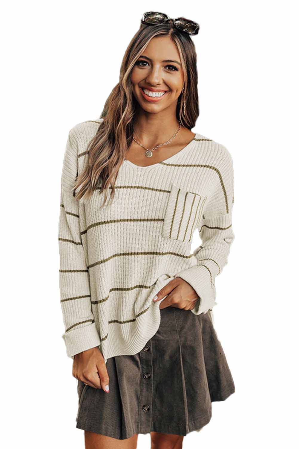 Introducing the Stripe Chest Pocket Striped Sweater. the perfect addition to your wardrobe.