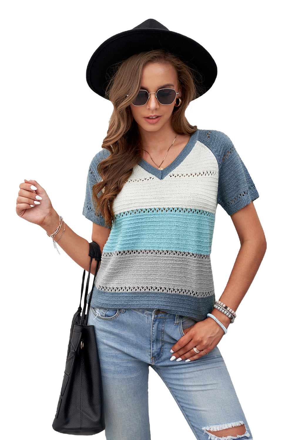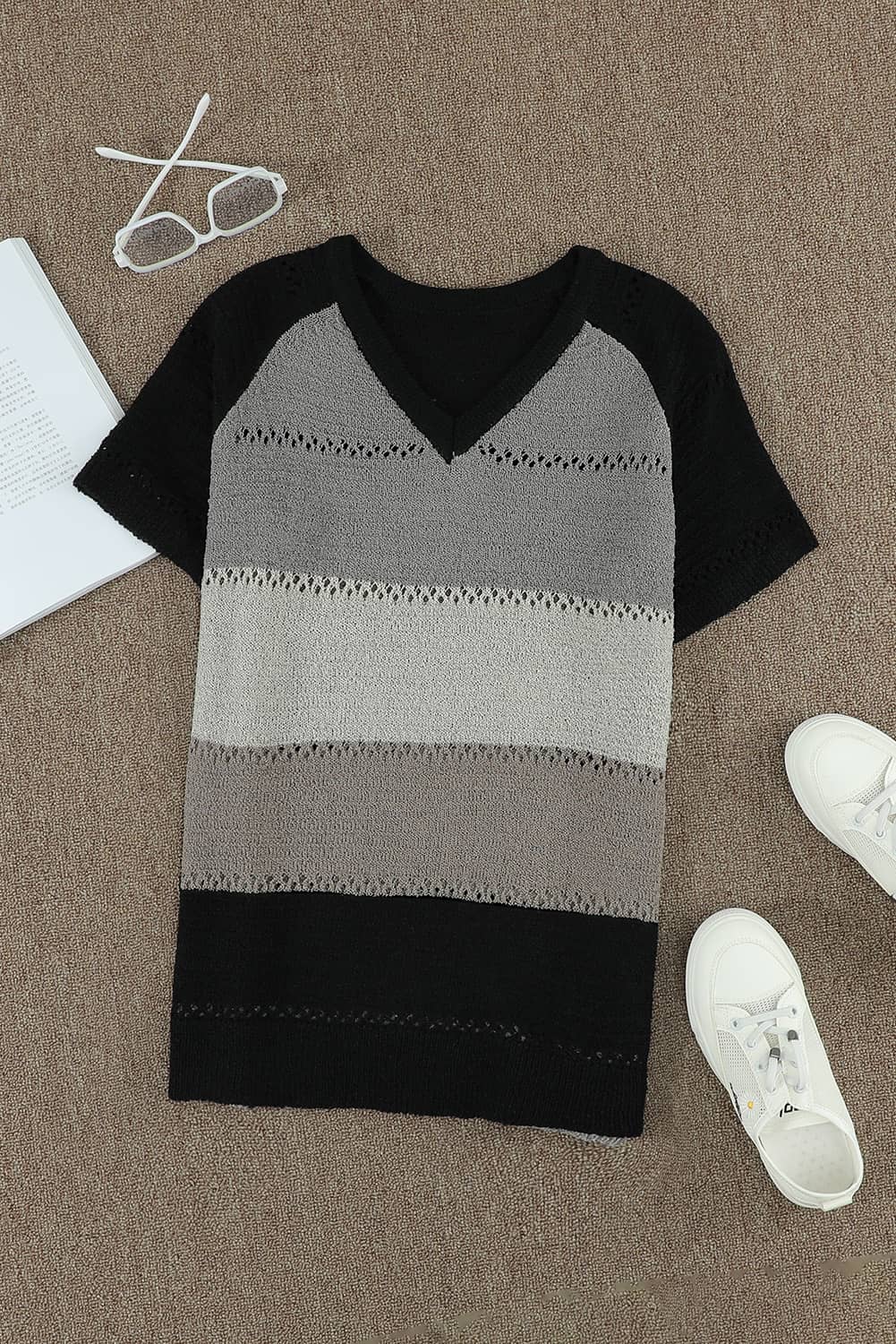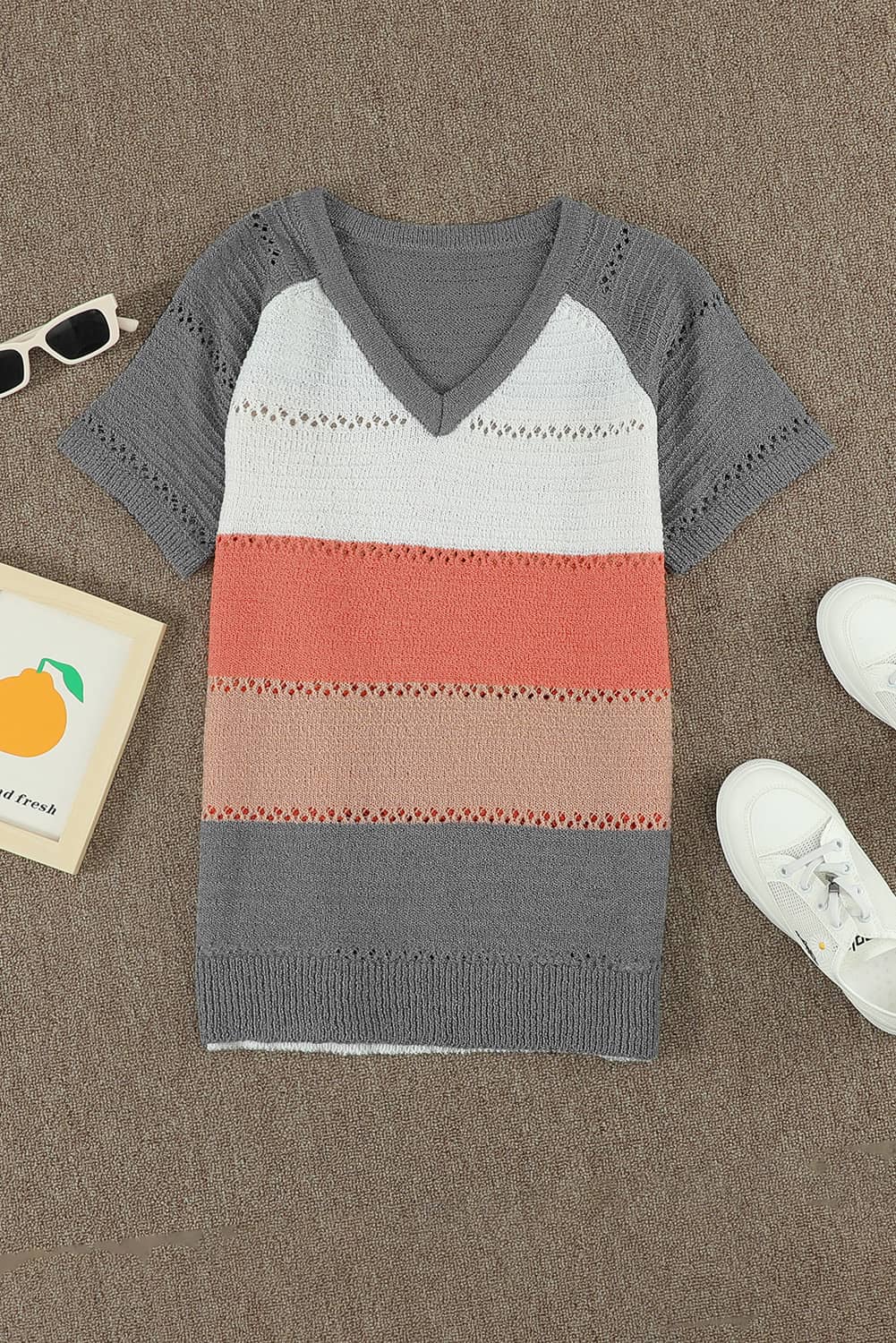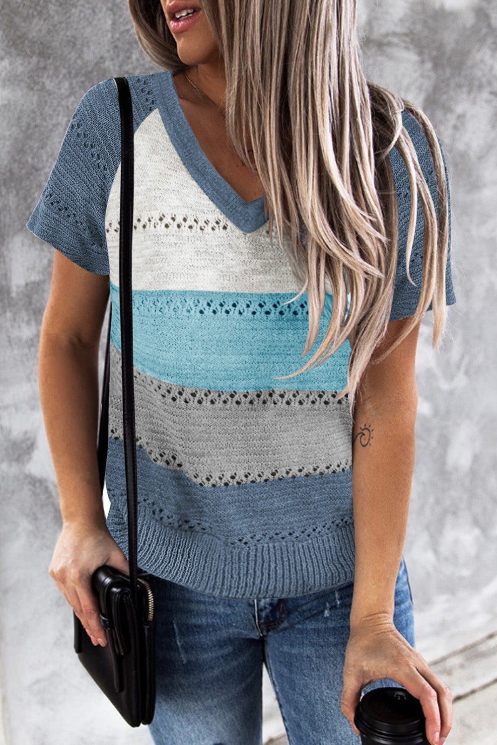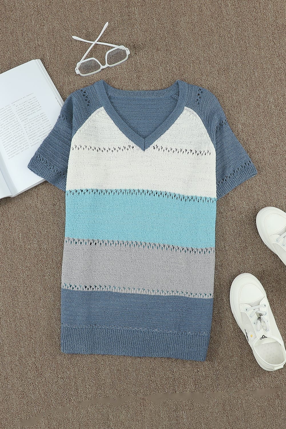 The classic V-neck design is timeless and flattering. while the stripe color block pattern adds a modern touch.