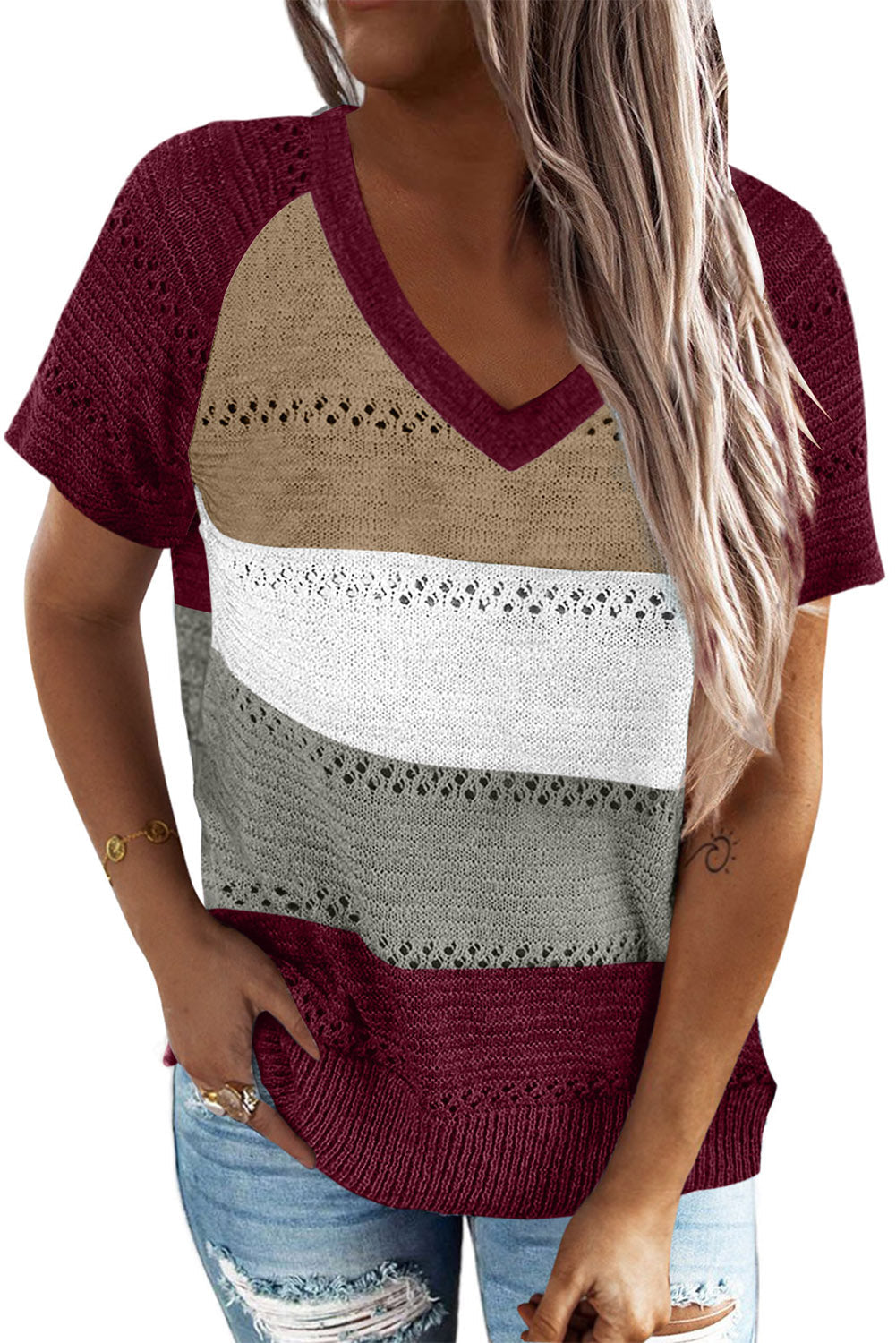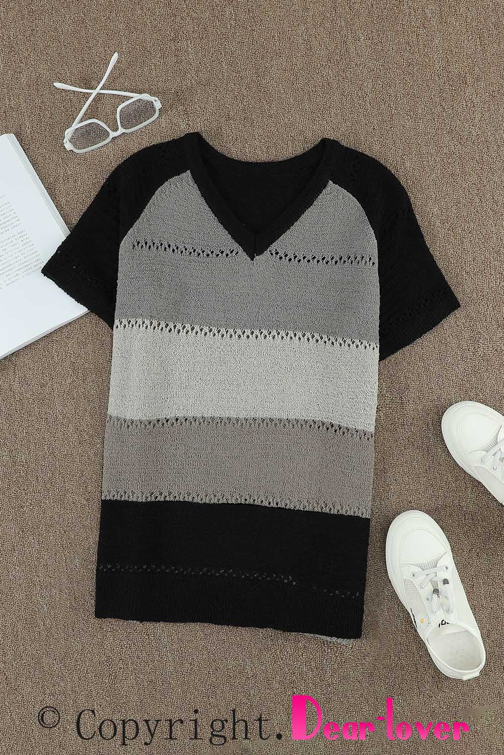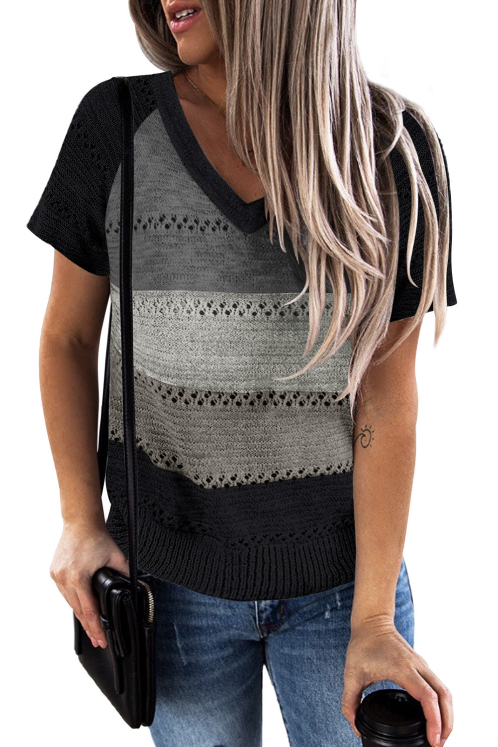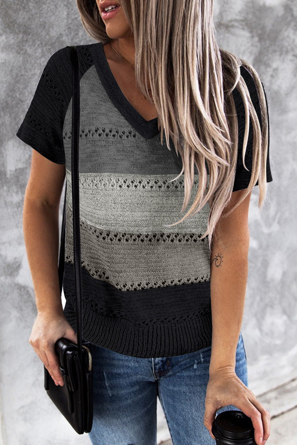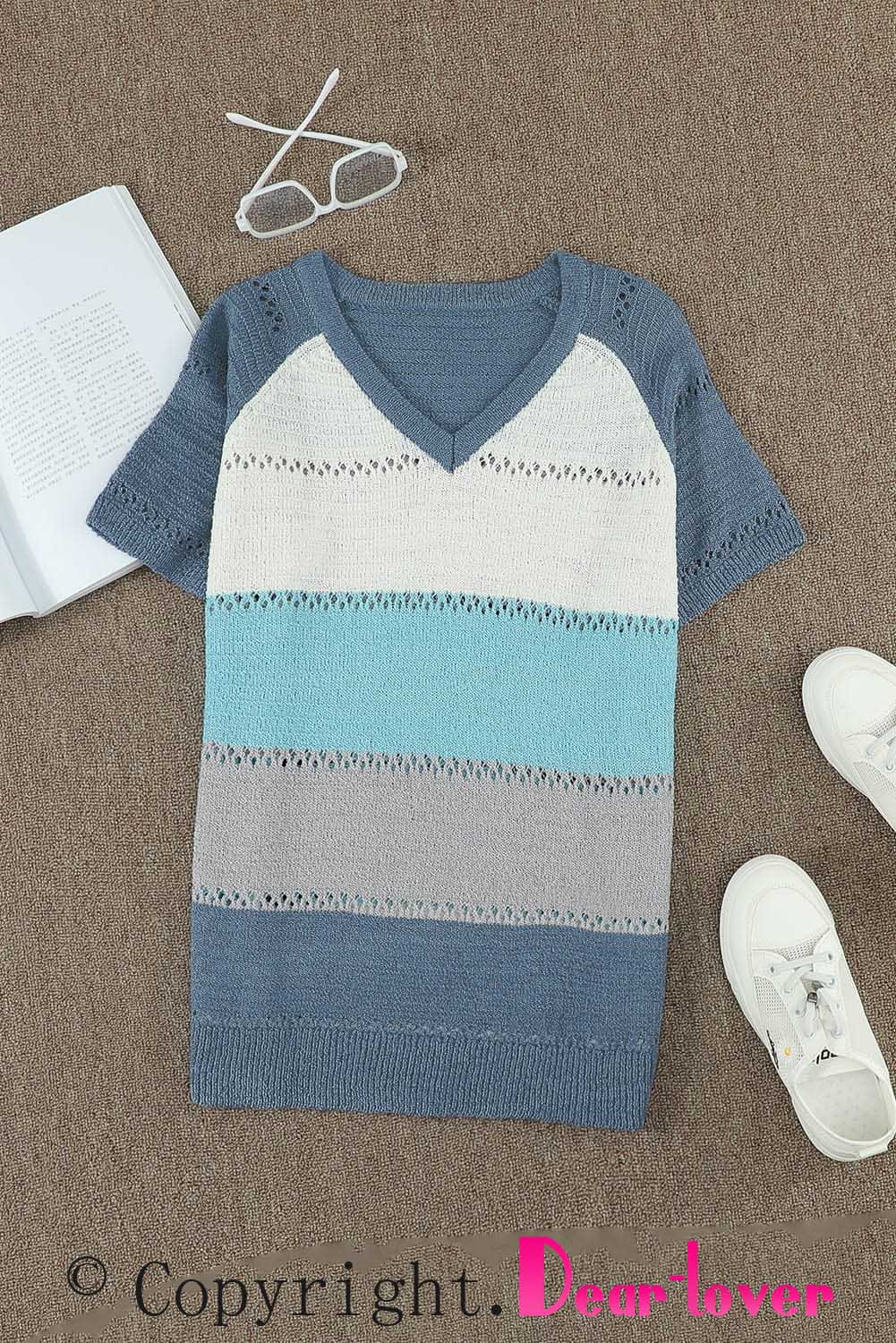 The classic V-neck design is timeless and flattering. while the stripe color block pattern adds a modern touch.
