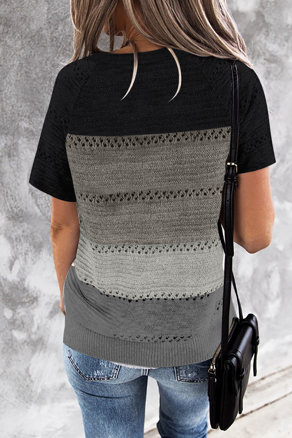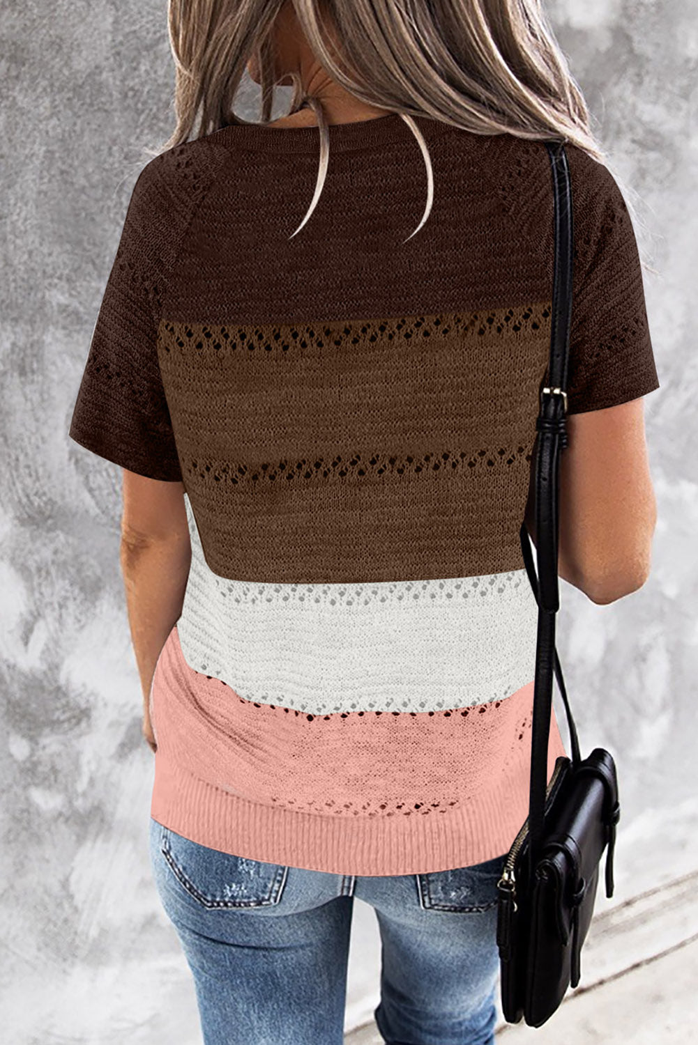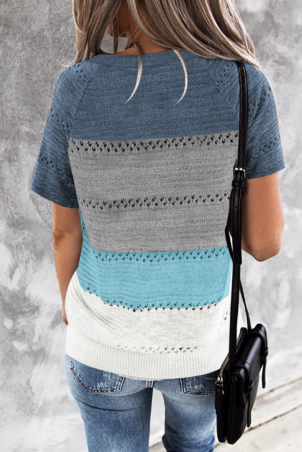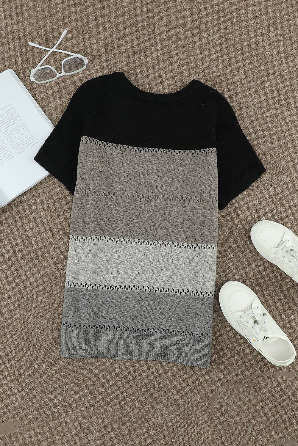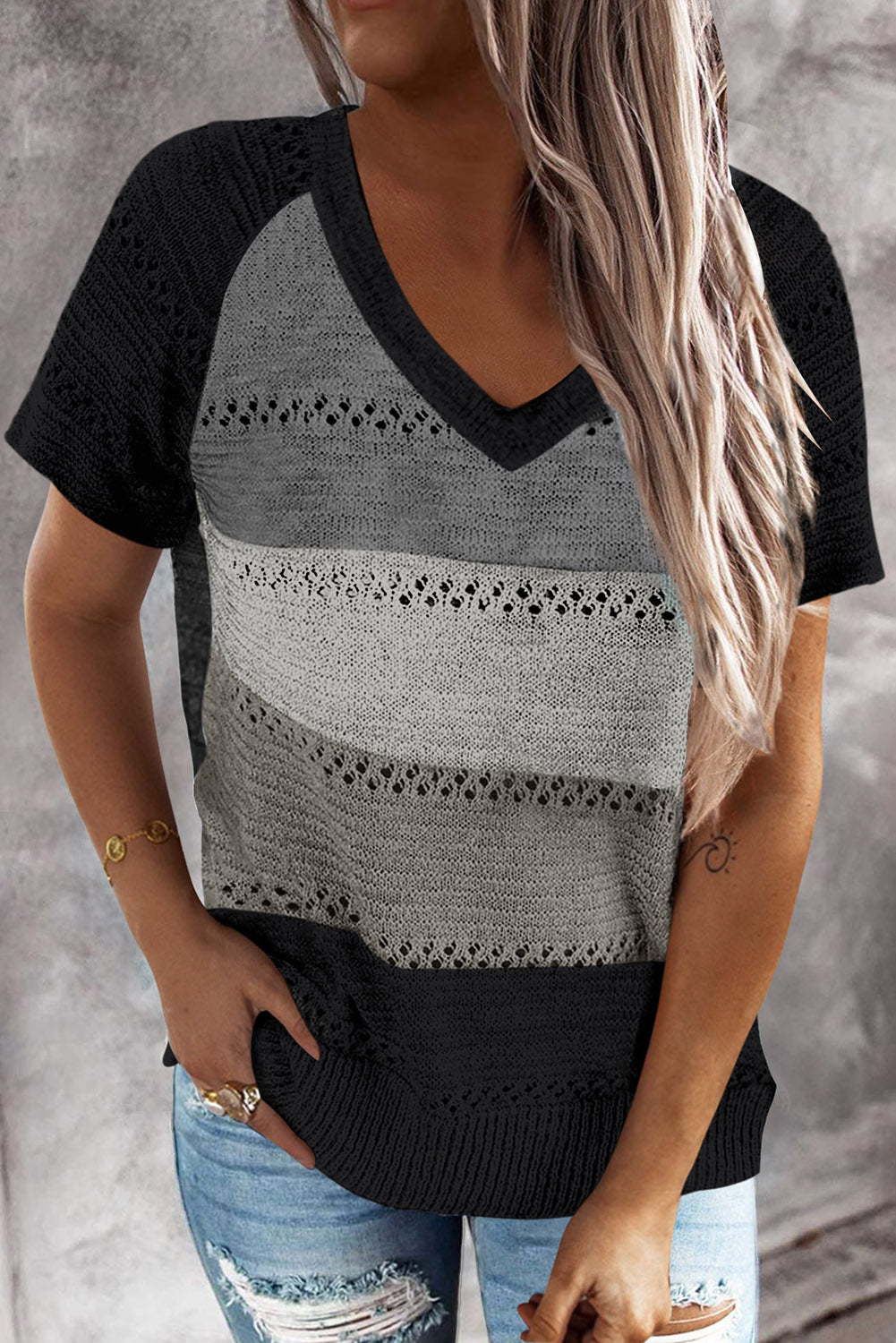 The classic V-neck design is timeless and flattering. while the stripe color block pattern adds a modern touch.
