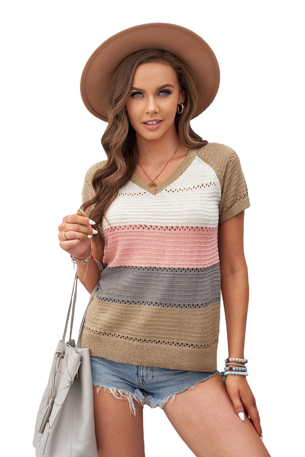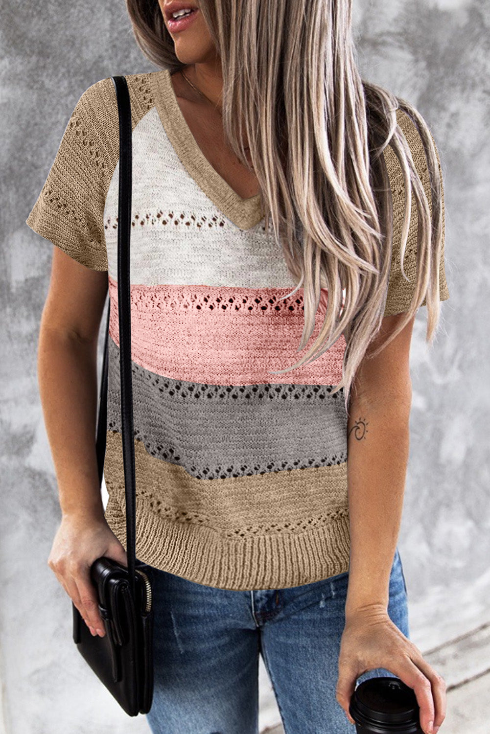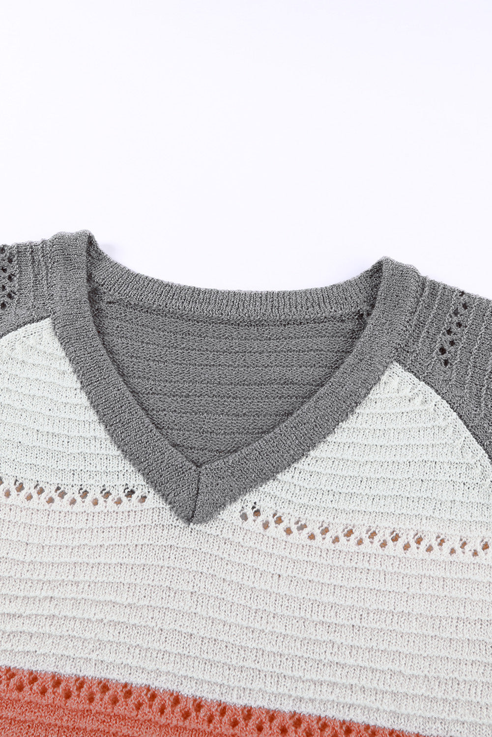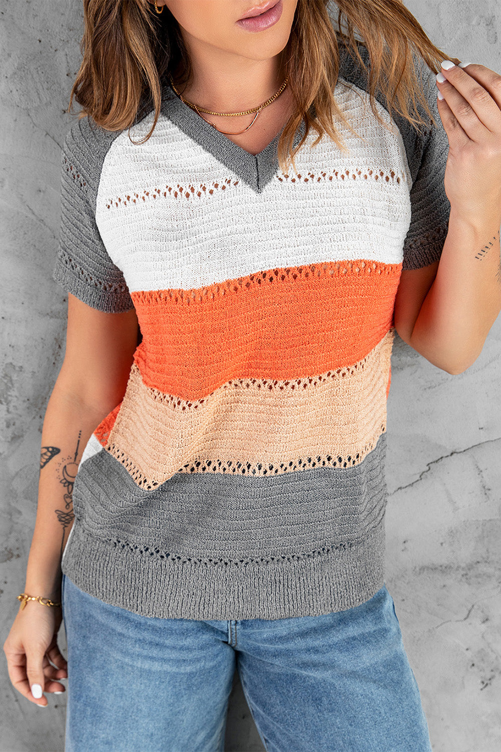 This Stripe Color Block Knitted V Neck Top is the perfect addition to your wardrobe.