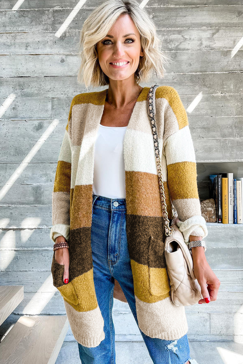 Introducing the Stripe Colorblock Open Front Pocketed Cardigan by Wakni �a versatile and chic addition to your wardrobe. Elevate your style effortlessly with this fashionable piece. Add it to your cart now!
