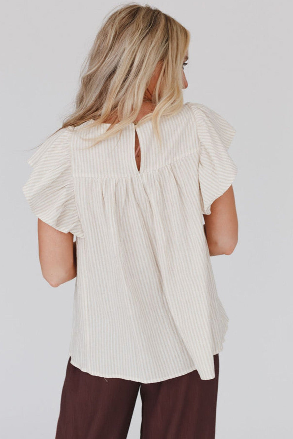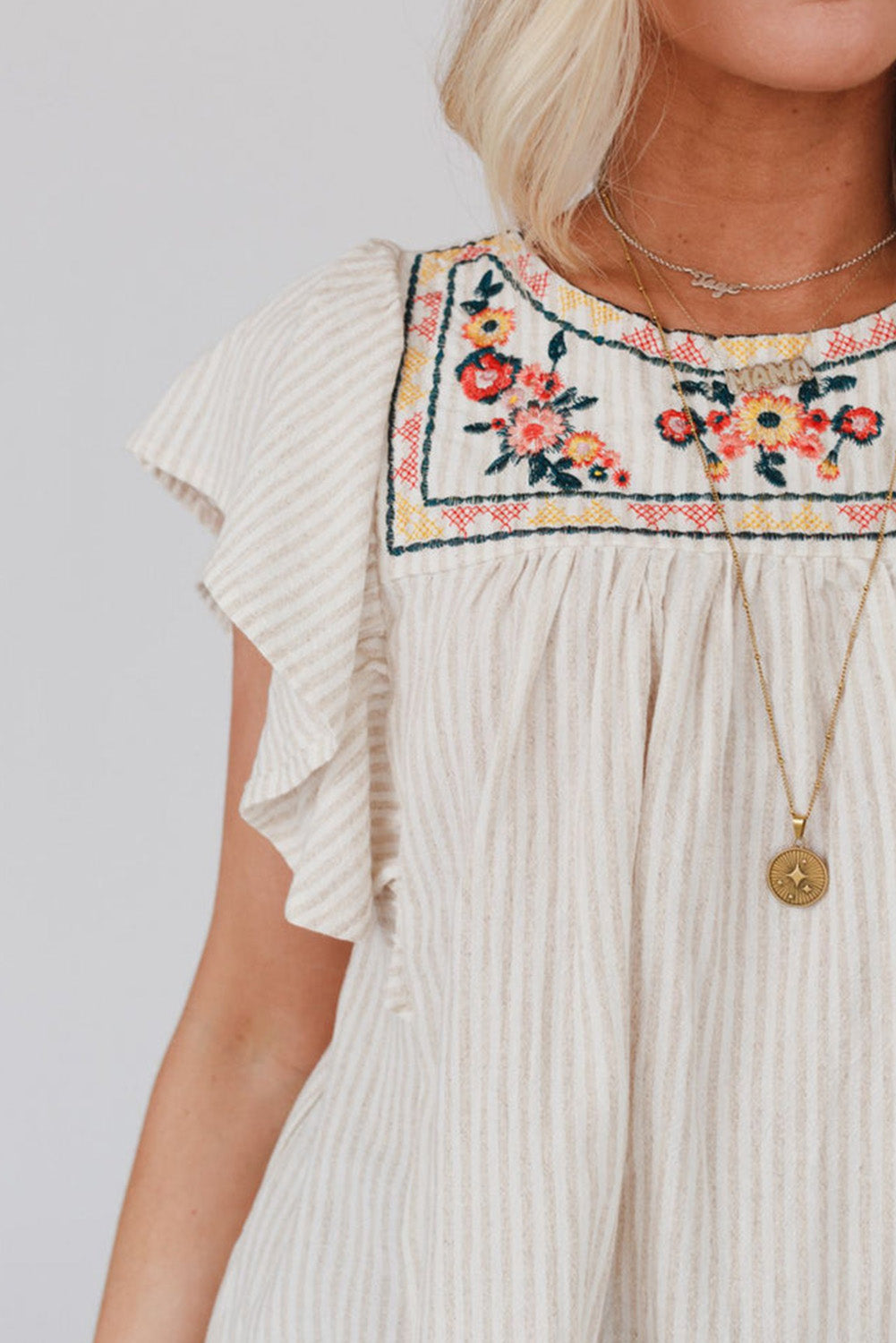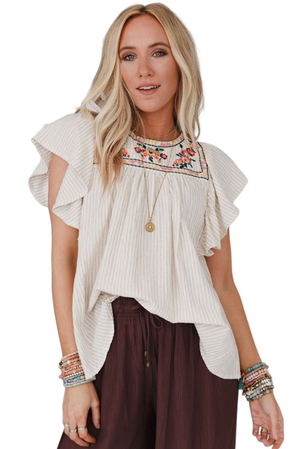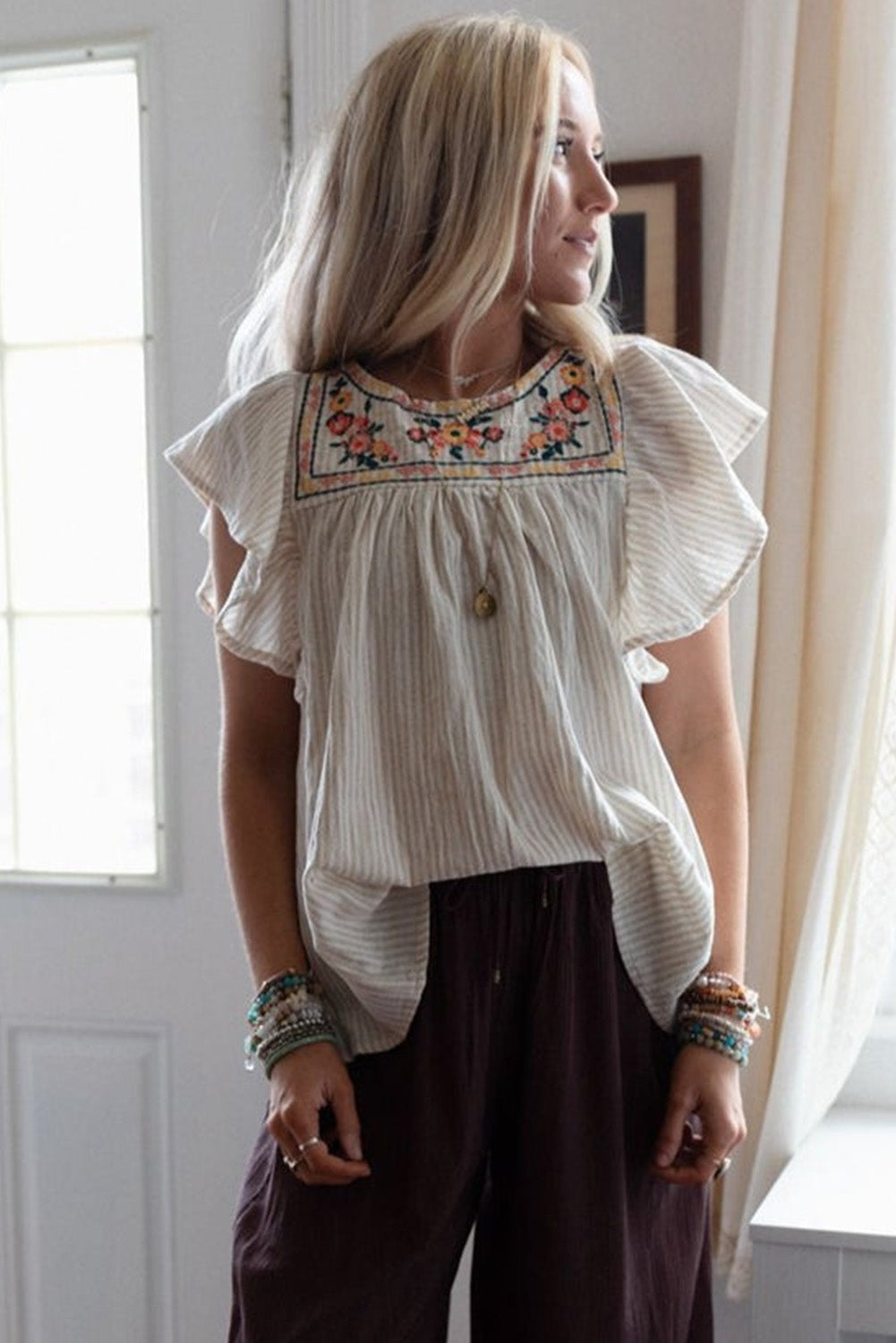 Look beautiful and feel confident as you move through life in our Stripe Ruffled Sleeve Embroidered Blouse.