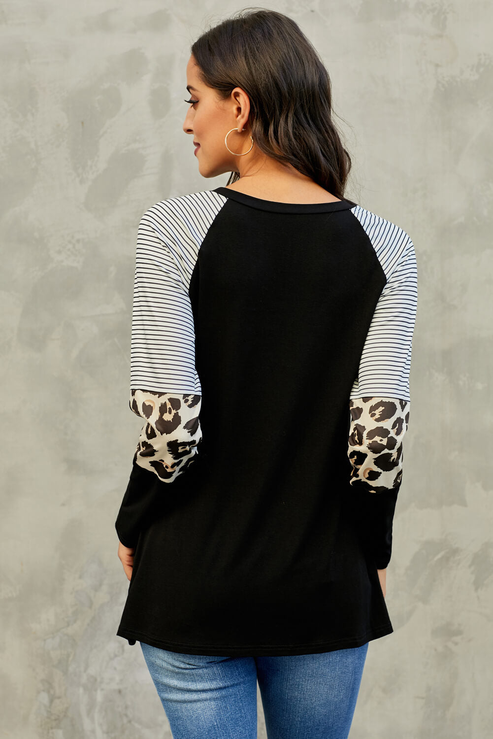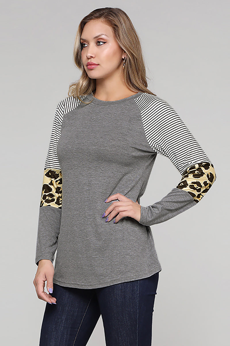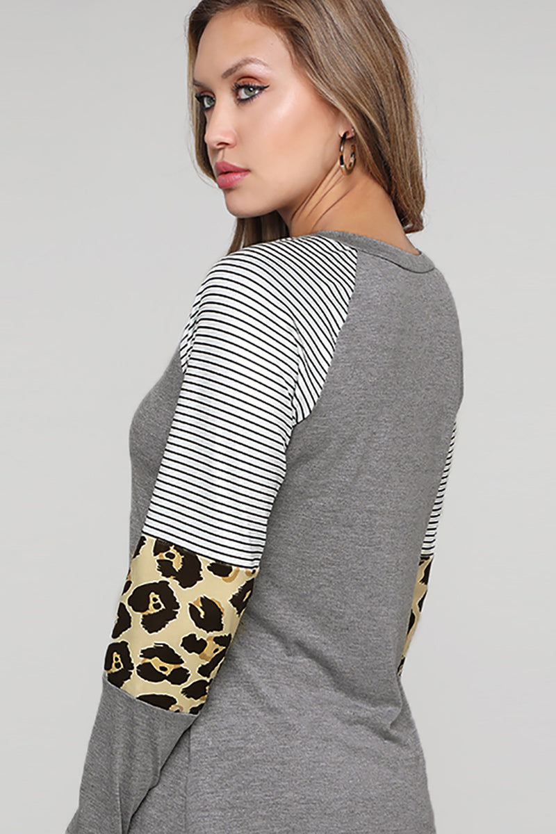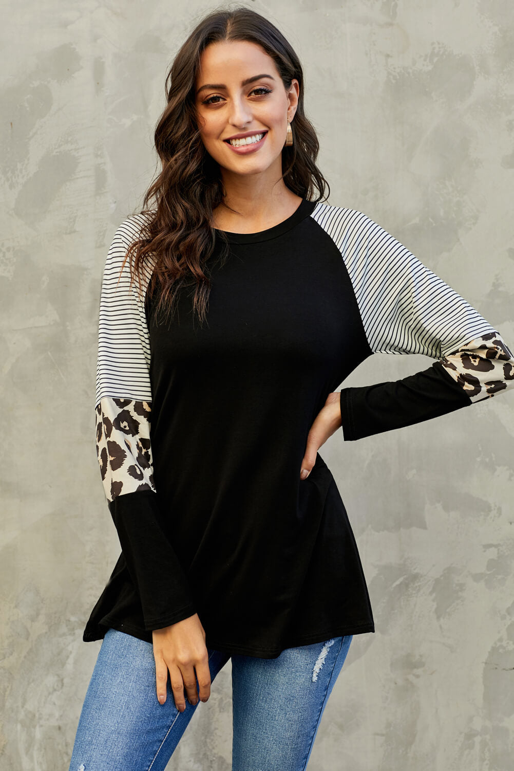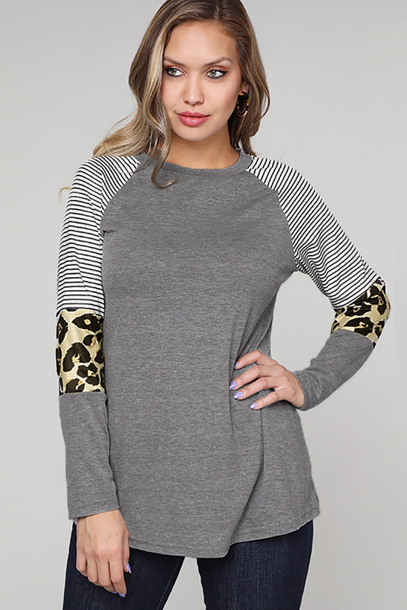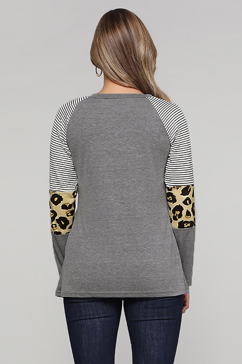 This Striped and Leopard Color Block Sleeves Top is the perfect addition to your wardrobe.