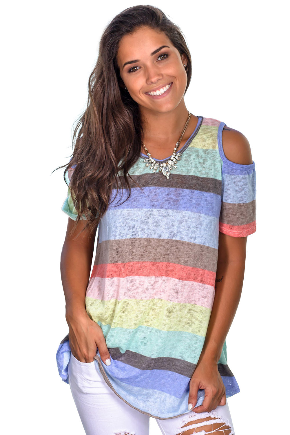 This breezy Striped Knit Cold Shoulder Top is the perfect combination of lightweight comfort and stylish flair.