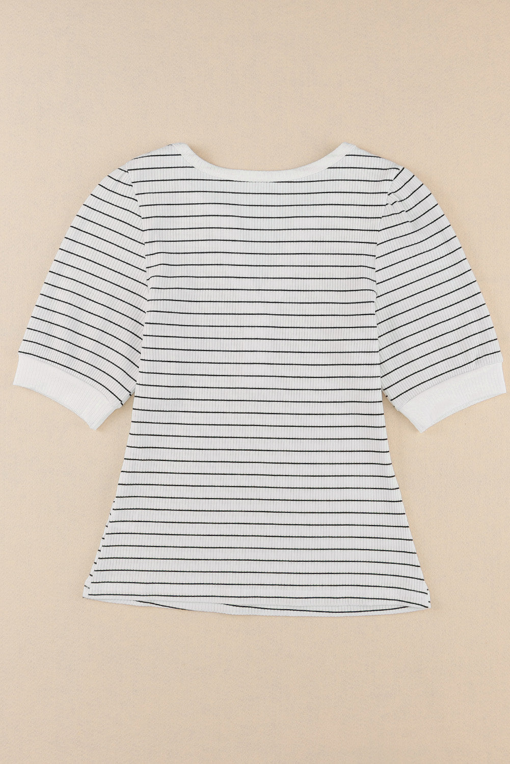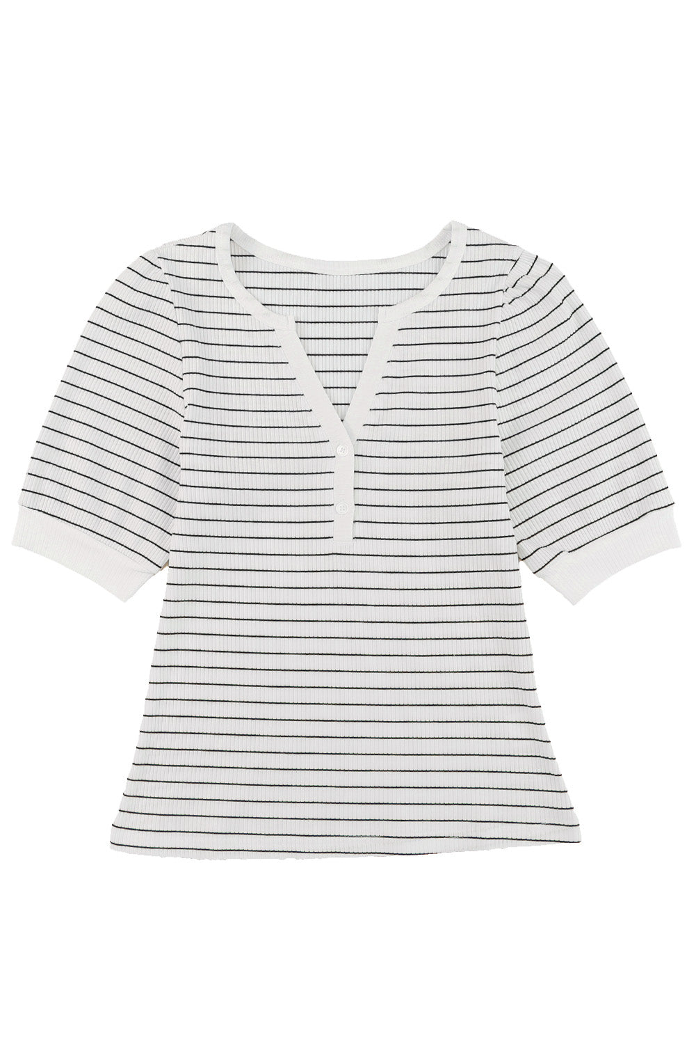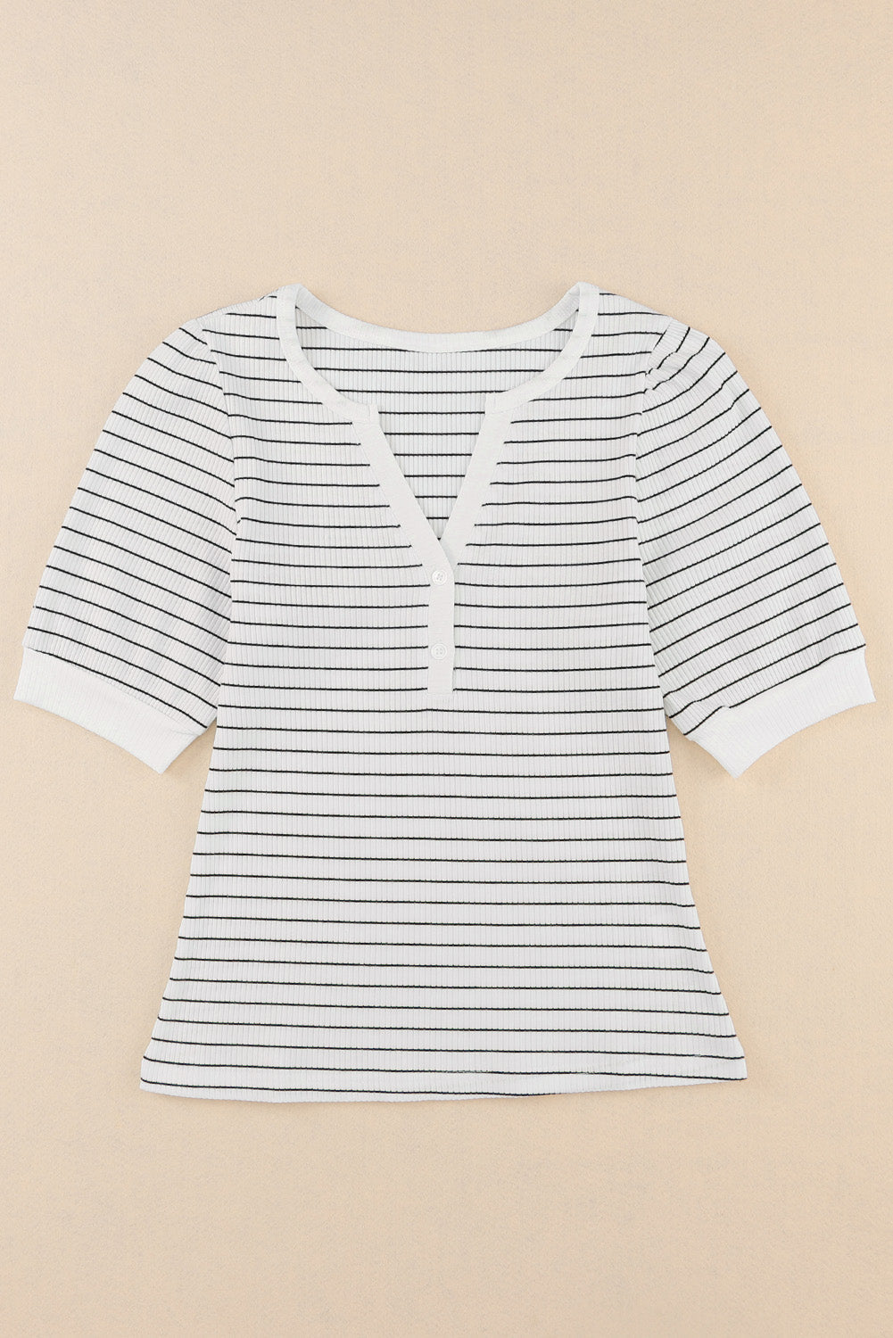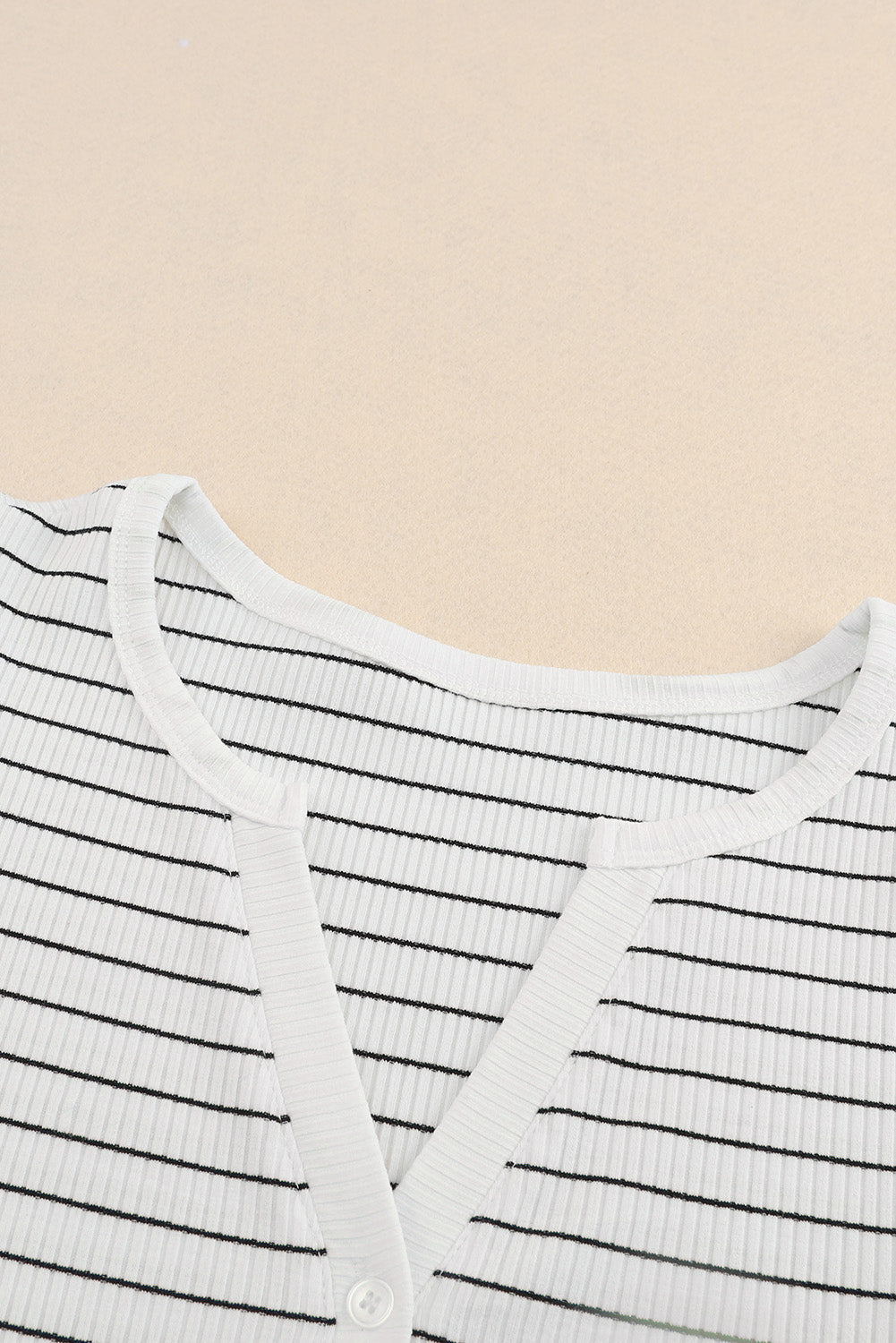 Dress to impress with the Striped Print Notch V Neck Short Sleeve Top - a versatile and trendy addition to your wardrobe that is guaranteed to turn heads.