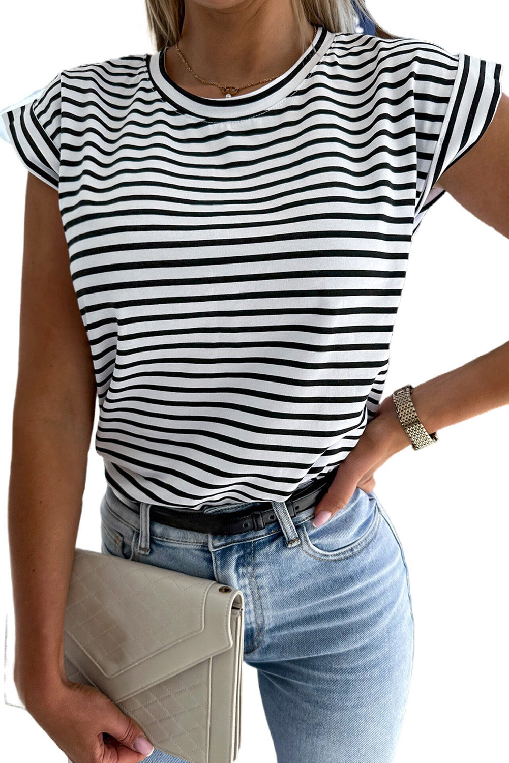 The perfect combination of style and comfort. this Striped Rolled Cap Sleeve Round Neck T Shirt is a must-have for any fashionista.