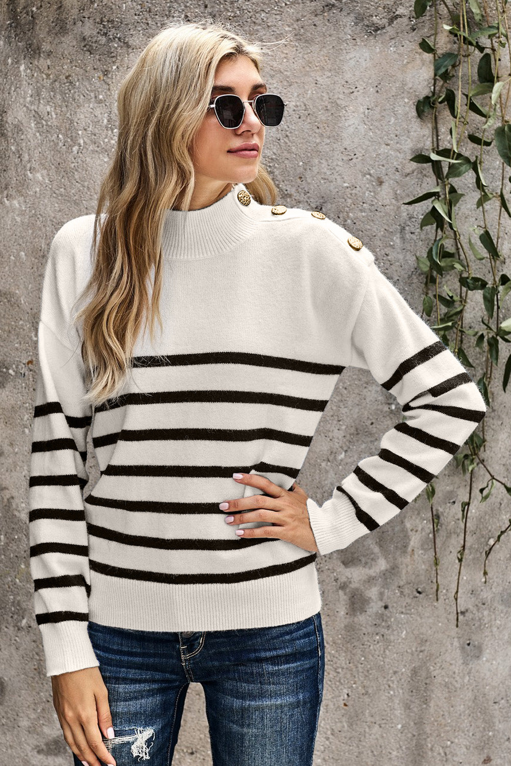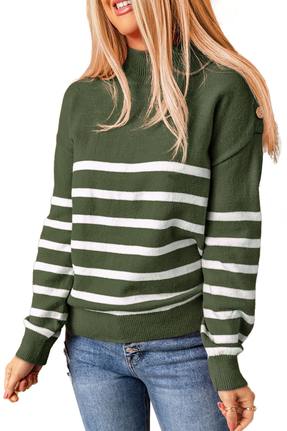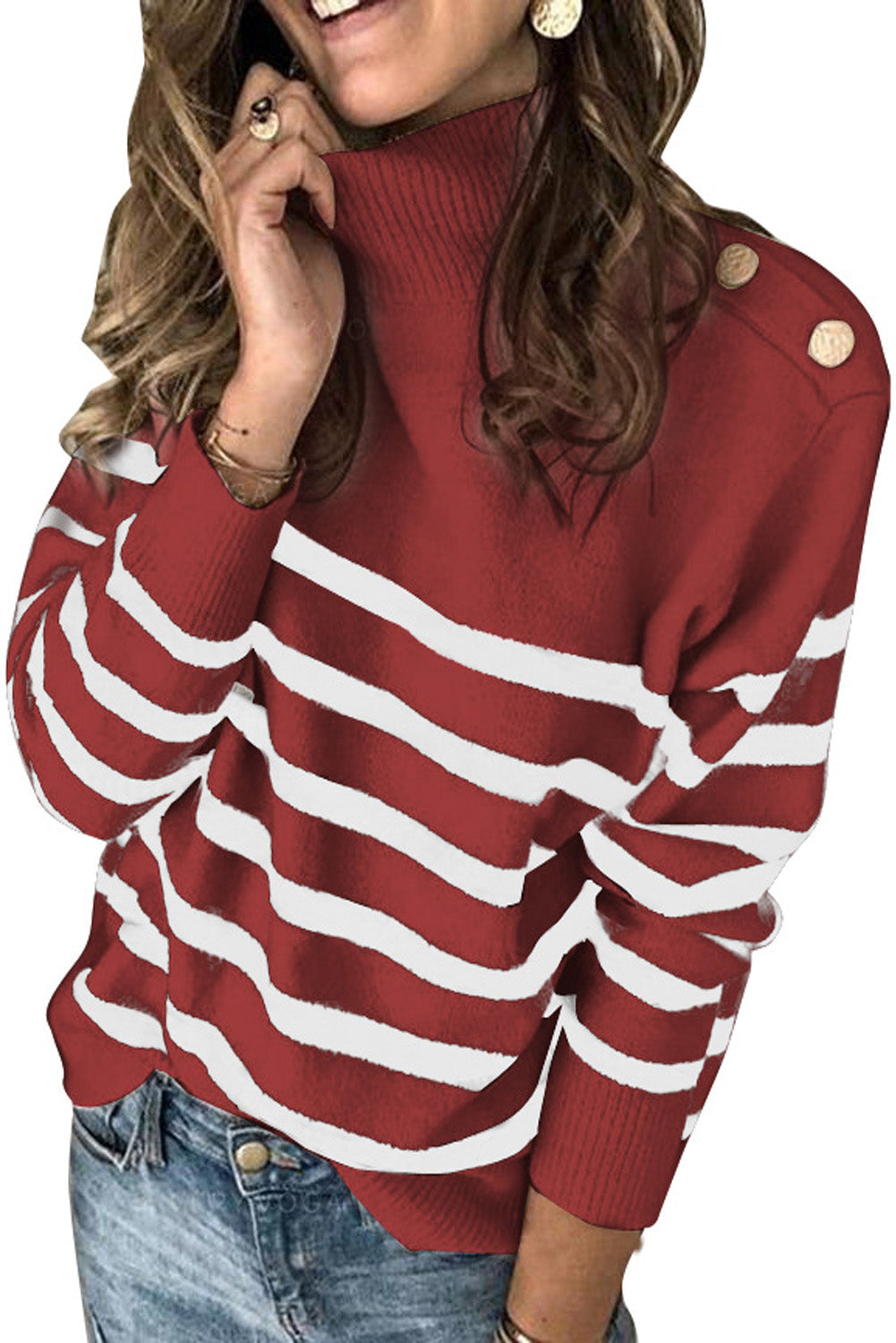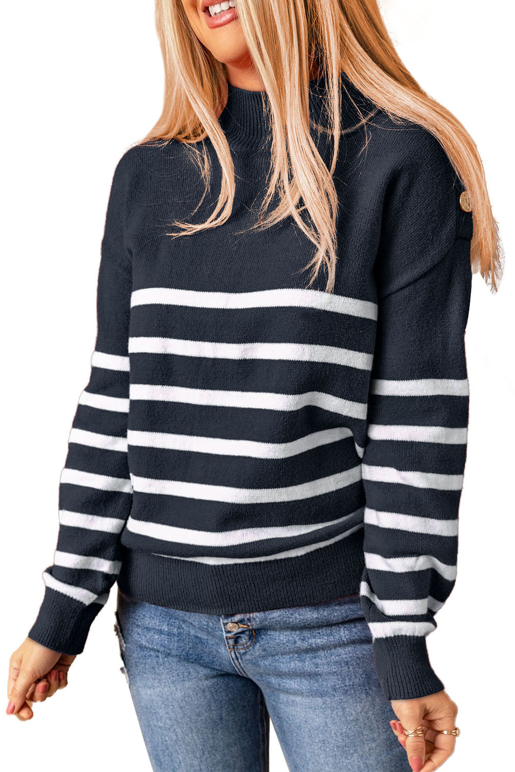 This Striped Turtleneck Long Sleeve Sweater With Buttons is the perfect addition to your wardrobe.
