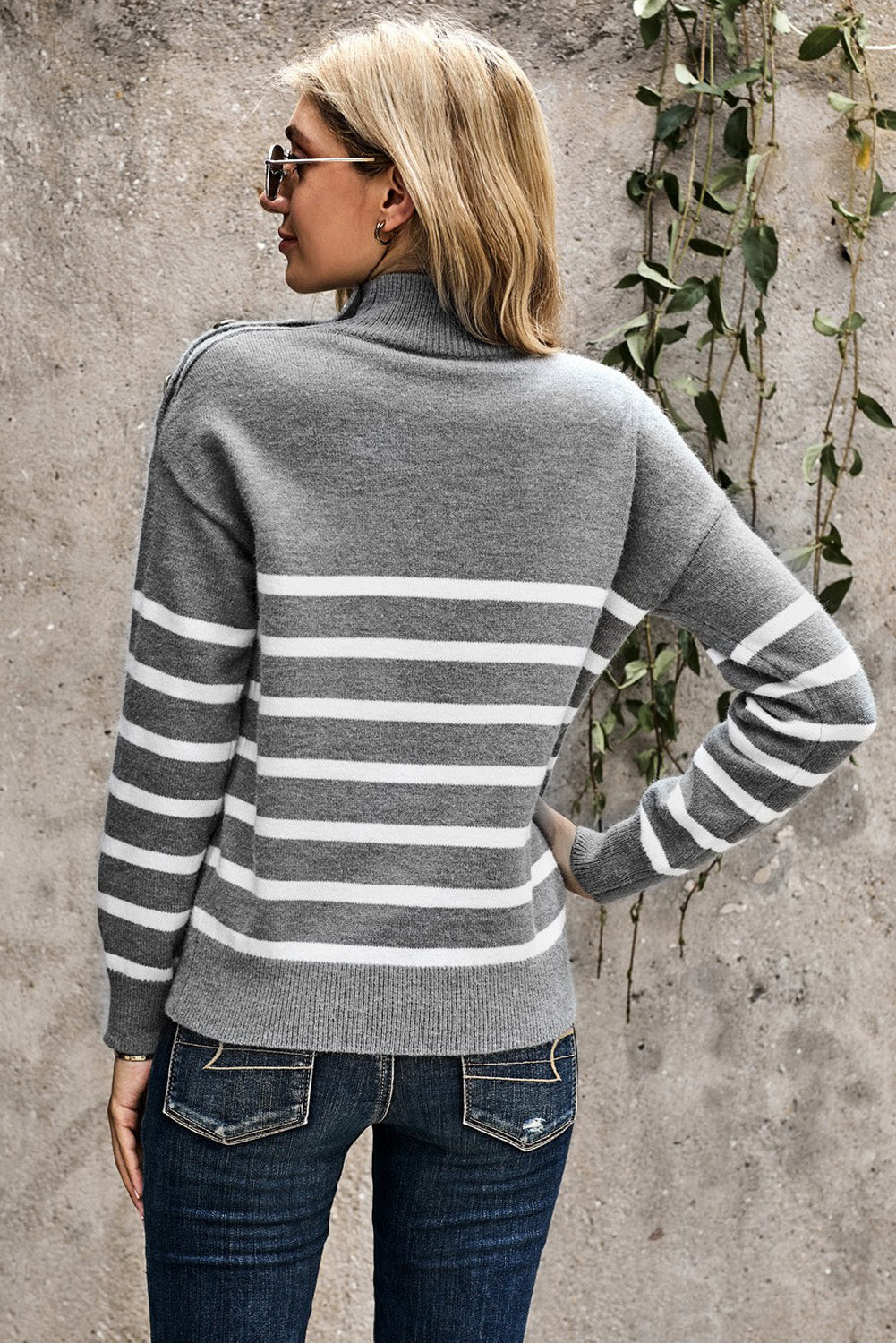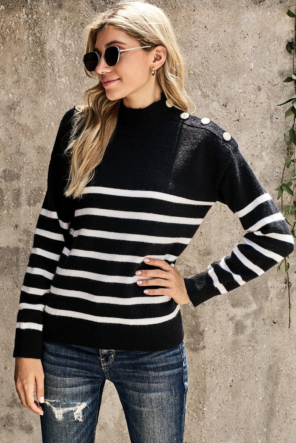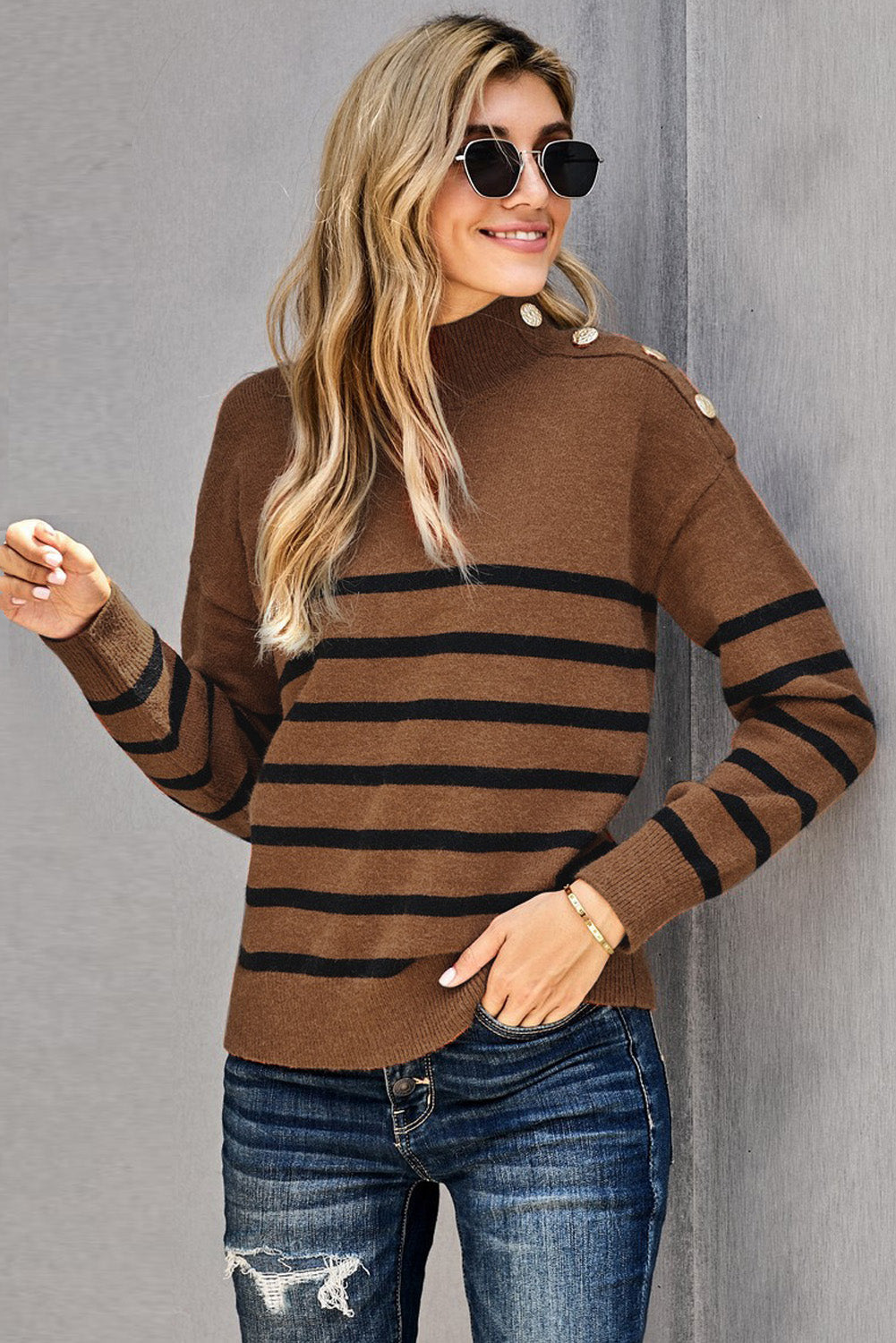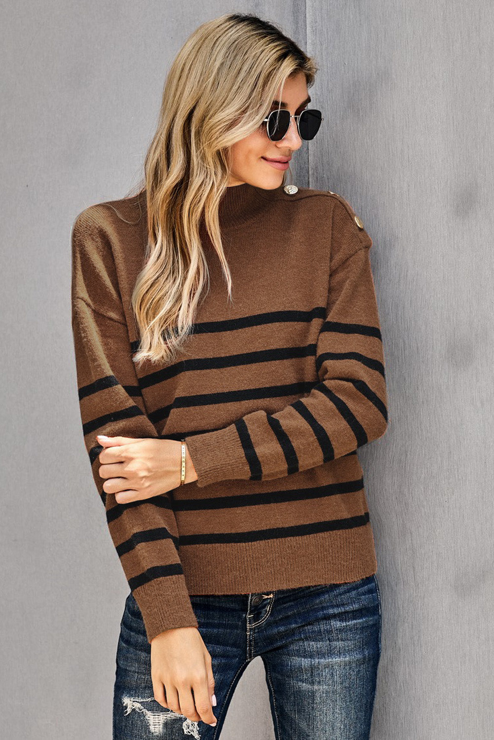 This Striped Turtleneck Long Sleeve Sweater With Buttons is the perfect addition to your wardrobe.