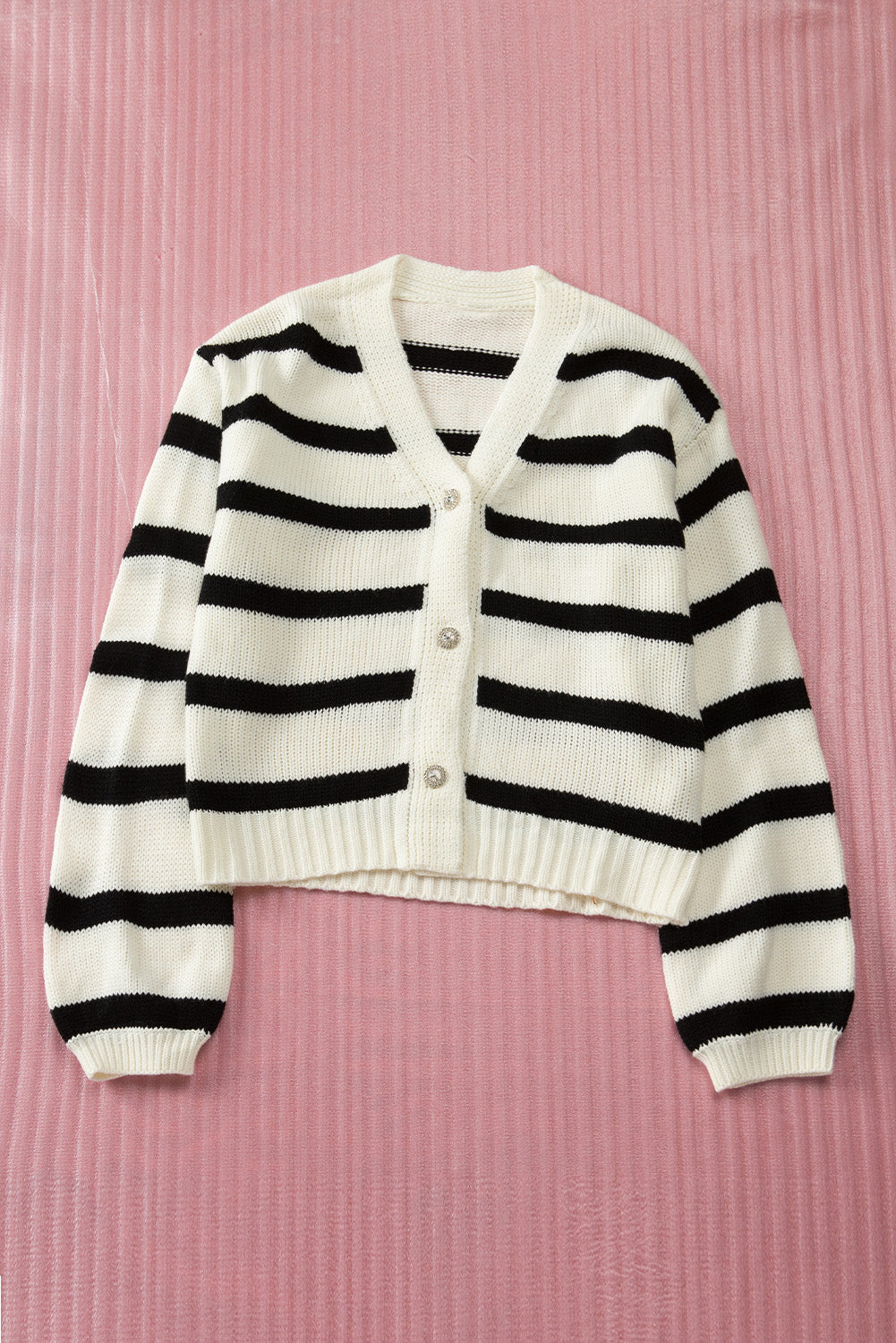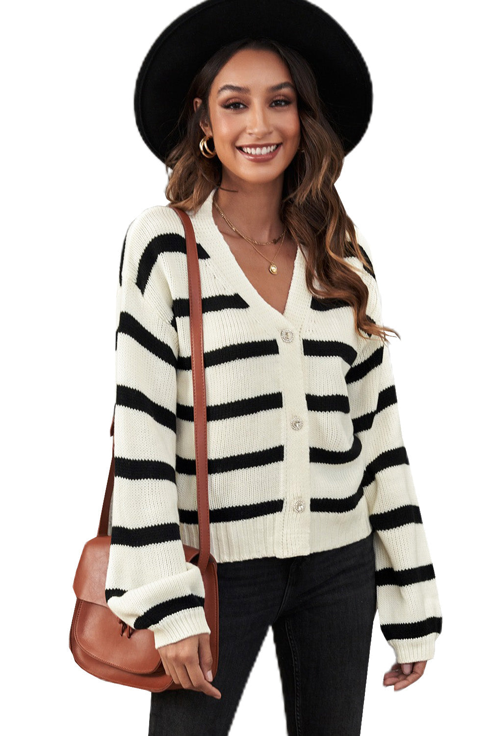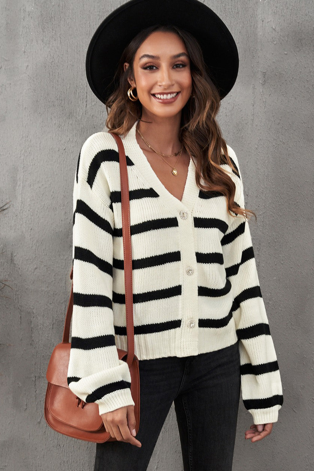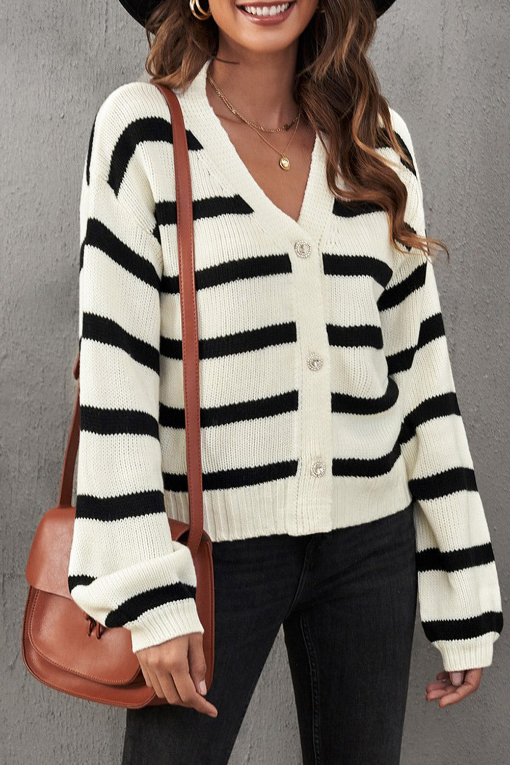 This Striped V-Neck Buttoned Open Front Knitted Sweater is the perfect addition to your wardrobe.