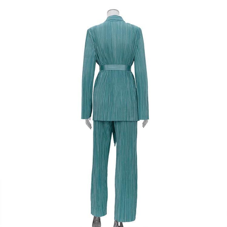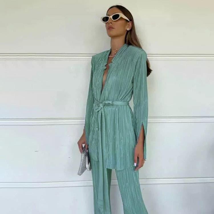This high-end suit is crafted from the finest fabrics and features a striking two-piece ensemble. Its split sleeves and lace-up shirt give the wearer a sophisticated look. while the pleated pants slim and uplift the legs. providing an optimal fit. The perfect attire for any occasion. this ensemble is sure to impress.