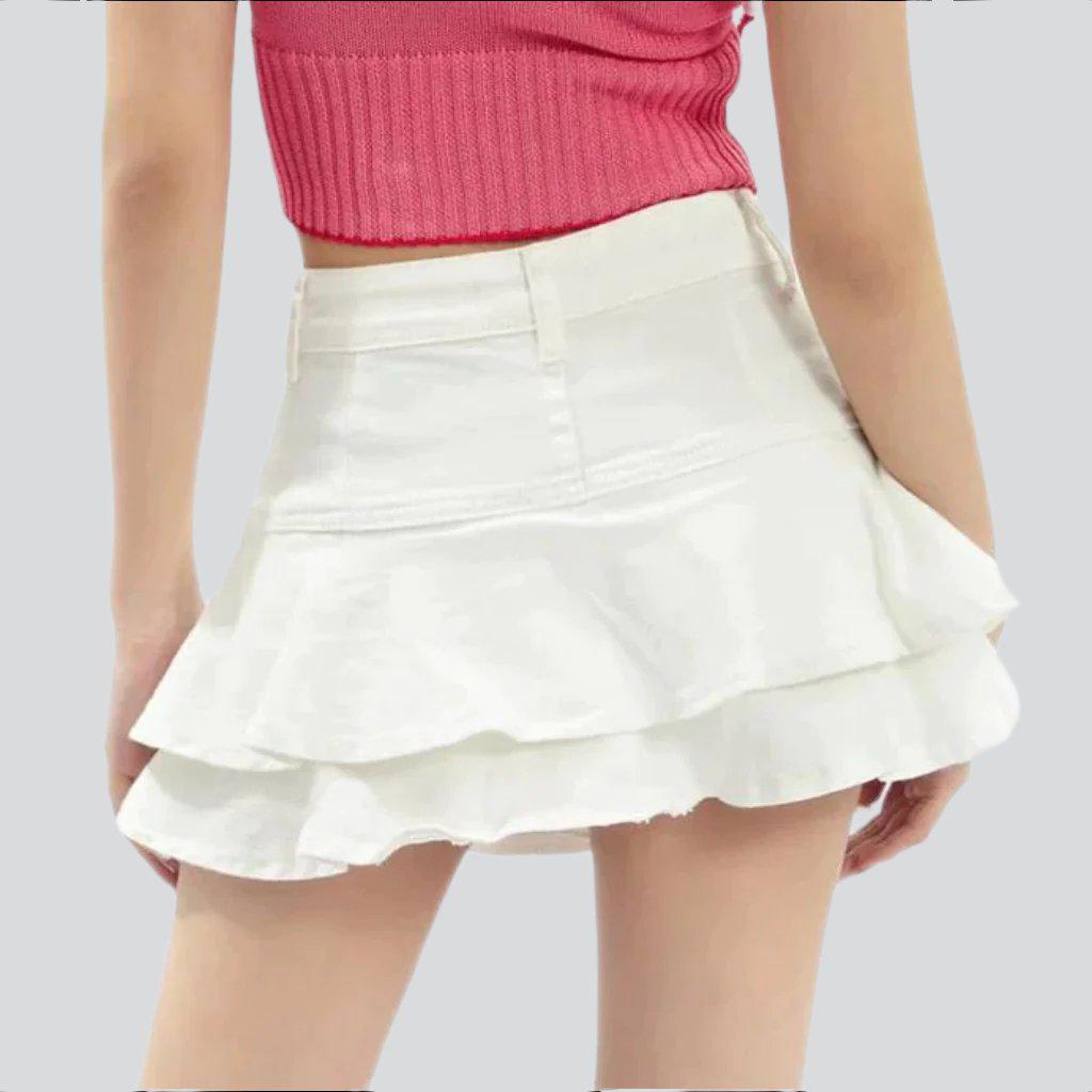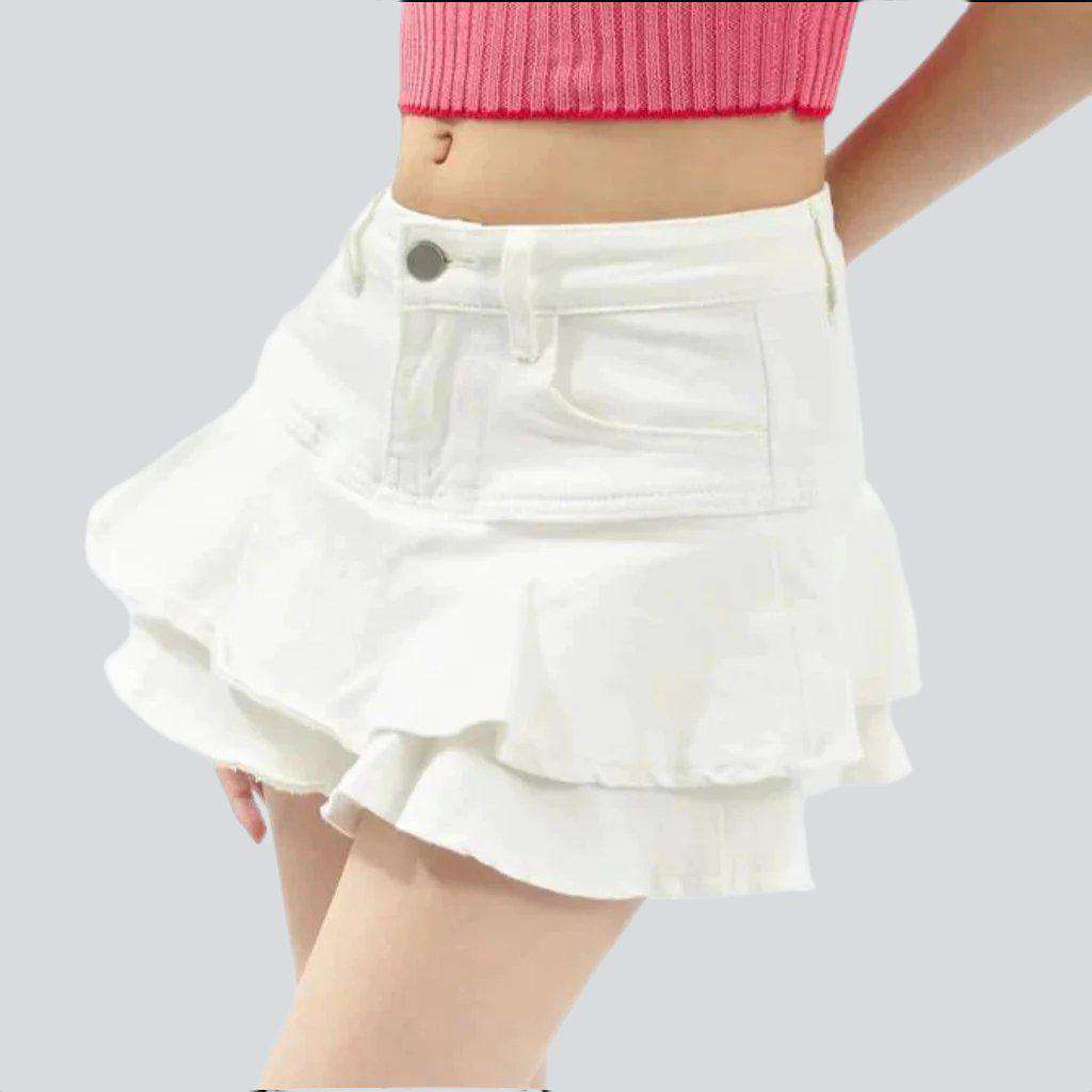 Introducing the 2023 Summer Collection's White Ruffle Skater Denim Skirt ââ‚?a laid-back-trend masterpiece that's taking the fashion world by storm!