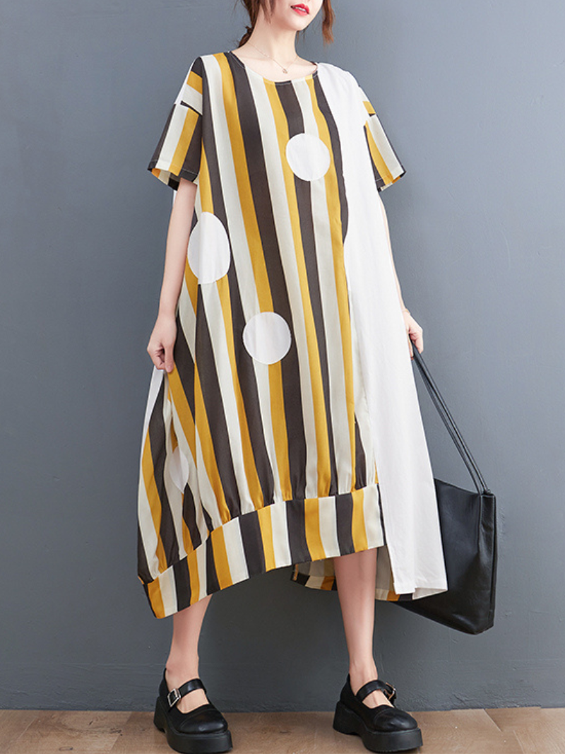 This white A-line dress is a classic and versatile choice for any woman's wardrobe. Made from comfortable cotton fabric. this dress offers a soft and breathable feel that is perfect for warm weather or casual occasions. The round neck adds a simple and timeless touch to the design. while the short sleeves offer a fresh and summery look. The A-line silhouette provides a flattering fit that accentuates the waist and flares out to the hem. creating a feminine and graceful silhouette. The pattern of polka dot stripes adds a playful and retro vibe to the dress. adding a touch of fun to your outfit. The white color provides a clean and crisp canvas that can be easily styled with other accessories and shoes for a chic and effortless look. This dress is perfect for everyday wear. whether you're dressing up for a casual brunch. a day at the office. or a weekend outing.